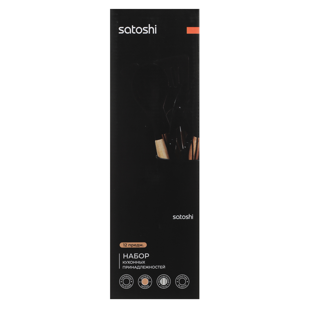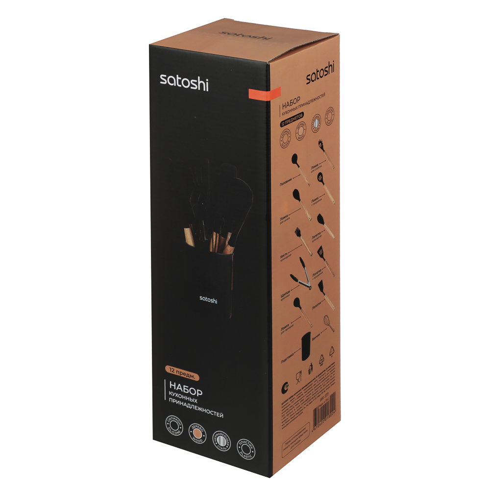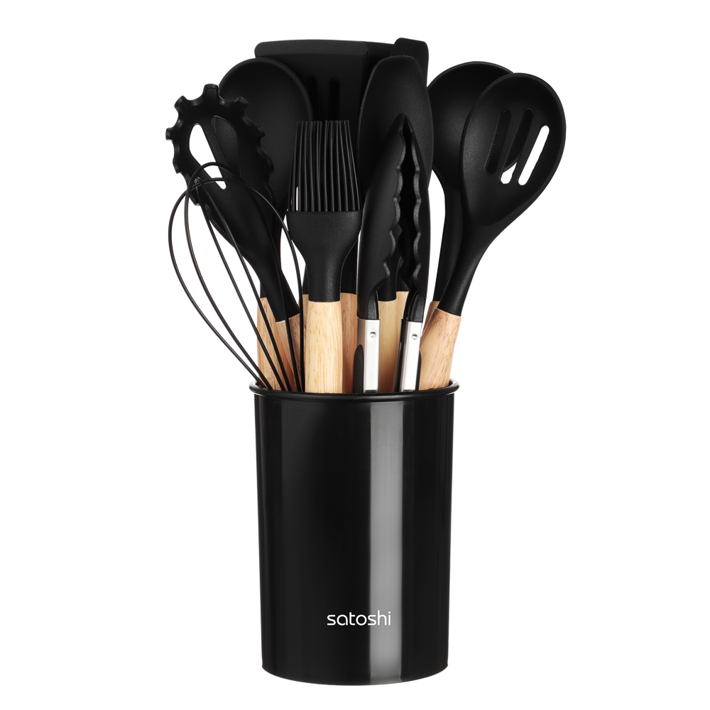 Набор кухонных принадлежностей из 12 предметов SATOSHI «Аллон» включает все самые необходимые приспособления для приготовления блюд на домашней кухне. Состав набора: венчик, половник, ложка для спагетти, ложка для салата, ложка с прорезями, кулинарная кисть и кулинарная лопатка, кухонные щипцы, лопатка с прорезями, лопатка для гарниров, лопатка без отверстий, устойчивая подставка. Все предметы выполнены из качественных безопасных материалов: рабочие части выполнены из силикона или термостойкого пластика, рукоятки – из натурального дерева. Щипцы и венчик изготовлены из высококачественной нержавеющей стали. Все предметы выполнены в едином стиле в черном цвете и компактно помещаются в устойчивую подставку-стакан. Набор кухонных принадлежностей сделает процесс приготовления комфортным и приятным, а эстетичный дизайн украсит интерьер кухни.