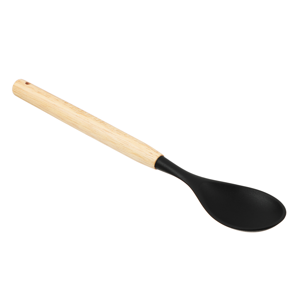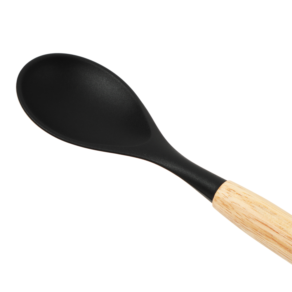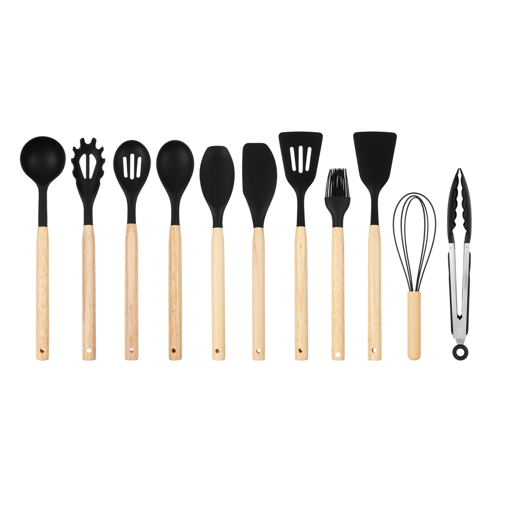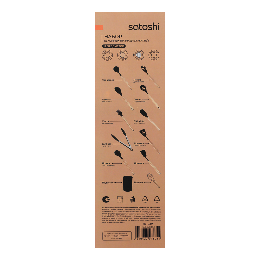 Набор кухонных принадлежностей из 12 предметов SATOSHI «Аллон» включает все самые необходимые приспособления для приготовления блюд на домашней кухне. Состав набора: венчик, половник, ложка для спагетти, ложка для салата, ложка с прорезями, кулинарная кисть и кулинарная лопатка, кухонные щипцы, лопатка с прорезями, лопатка для гарниров, лопатка без отверстий, устойчивая подставка. Все предметы выполнены из качественных безопасных материалов: рабочие части выполнены из силикона или термостойкого пластика, рукоятки – из натурального дерева. Щипцы и венчик изготовлены из высококачественной нержавеющей стали. Все предметы выполнены в едином стиле в черном цвете и компактно помещаются в устойчивую подставку-стакан. Набор кухонных принадлежностей сделает процесс приготовления комфортным и приятным, а эстетичный дизайн украсит интерьер кухни.