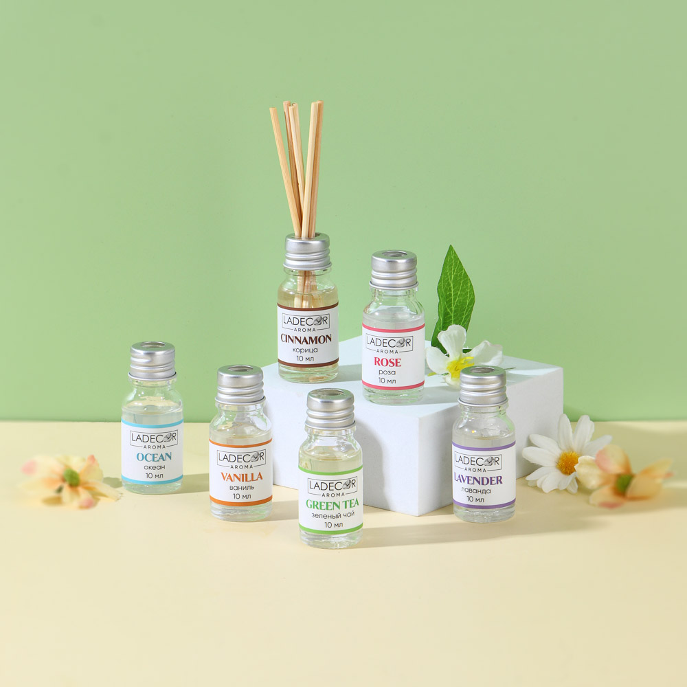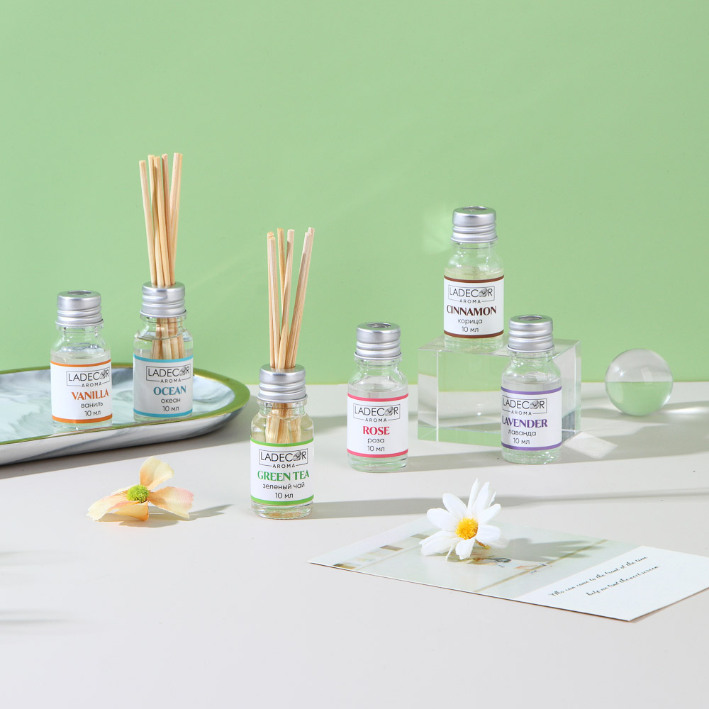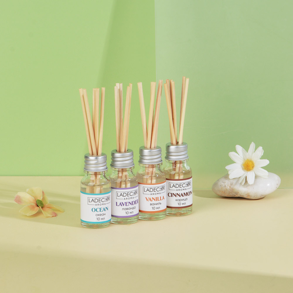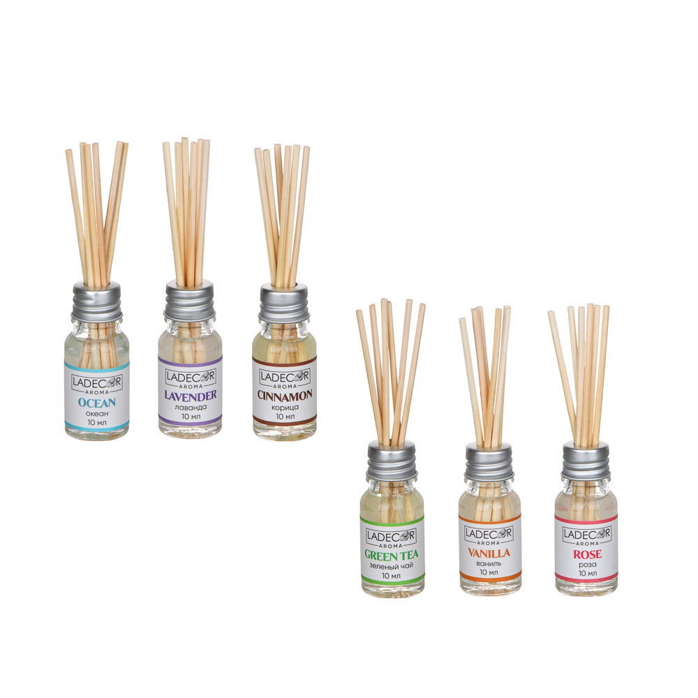 LADECOR Аромадиффузор с палочками, 10мл 6 ароматов зел.чай,лаванда,роза,ваниль,океан,корица