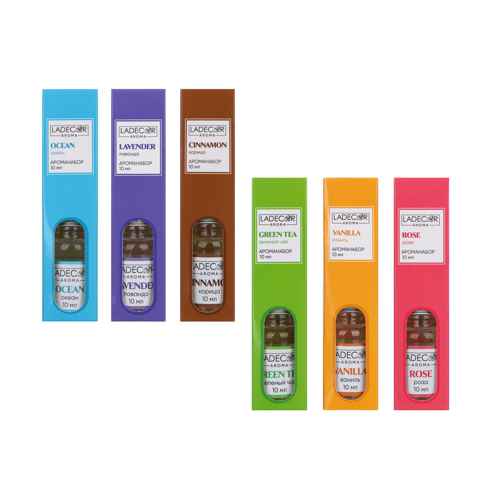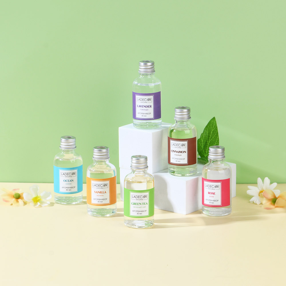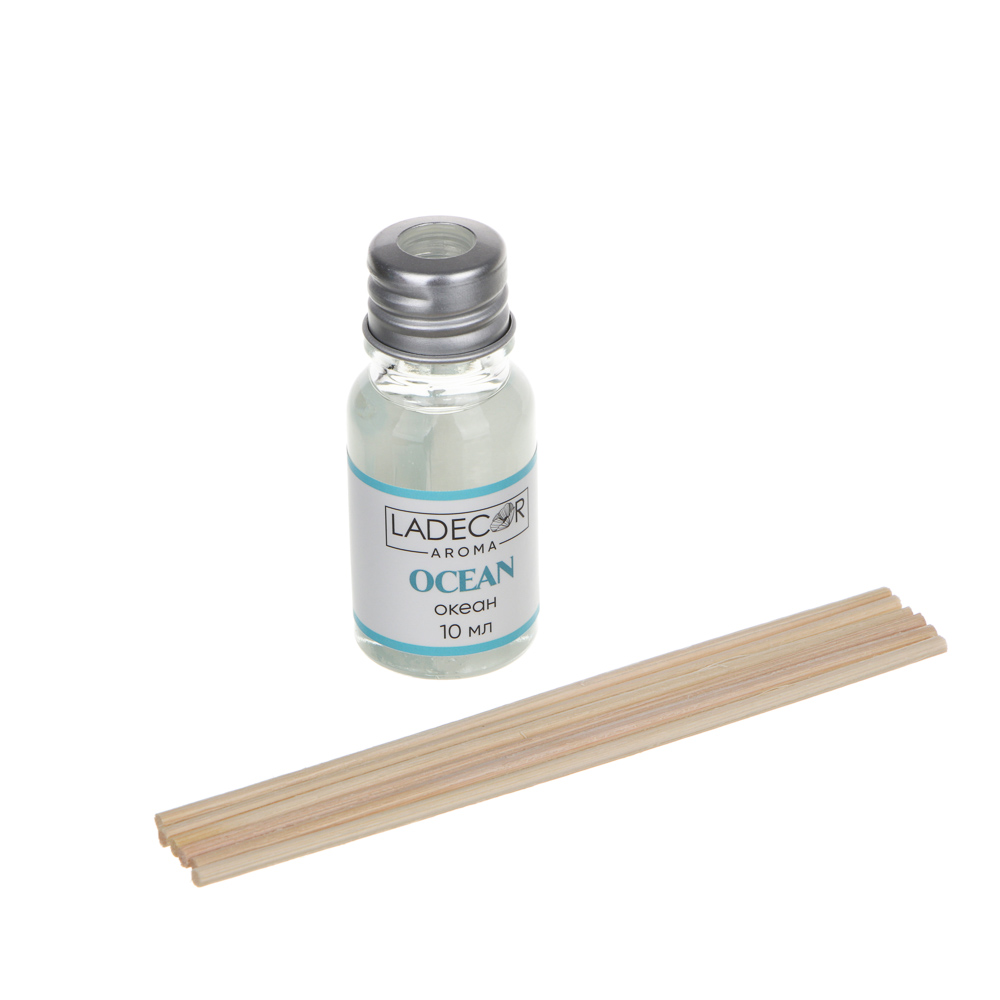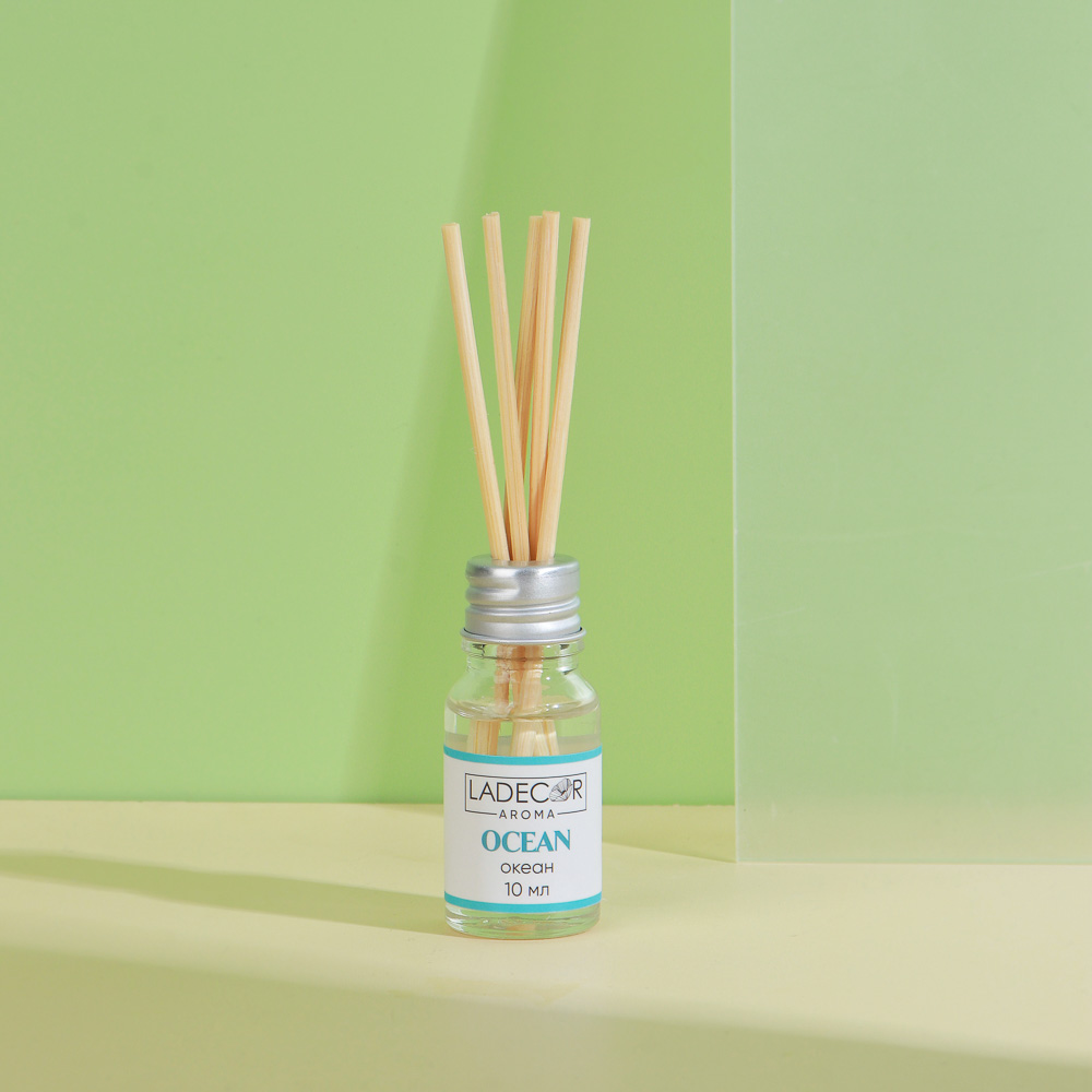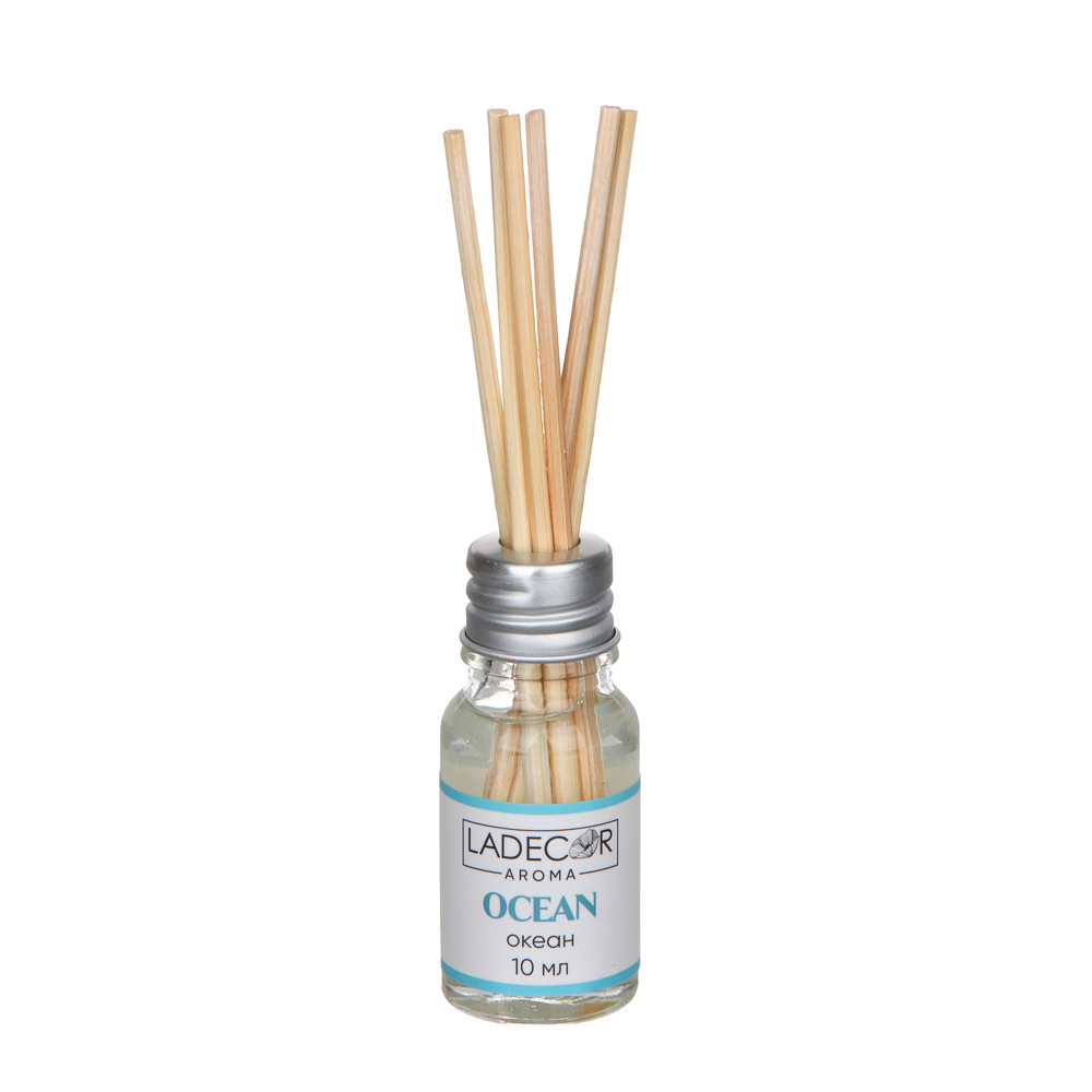 LADECOR Аромадиффузор с палочками, 10мл 6 ароматов зел.чай,лаванда,роза,ваниль,океан,корица