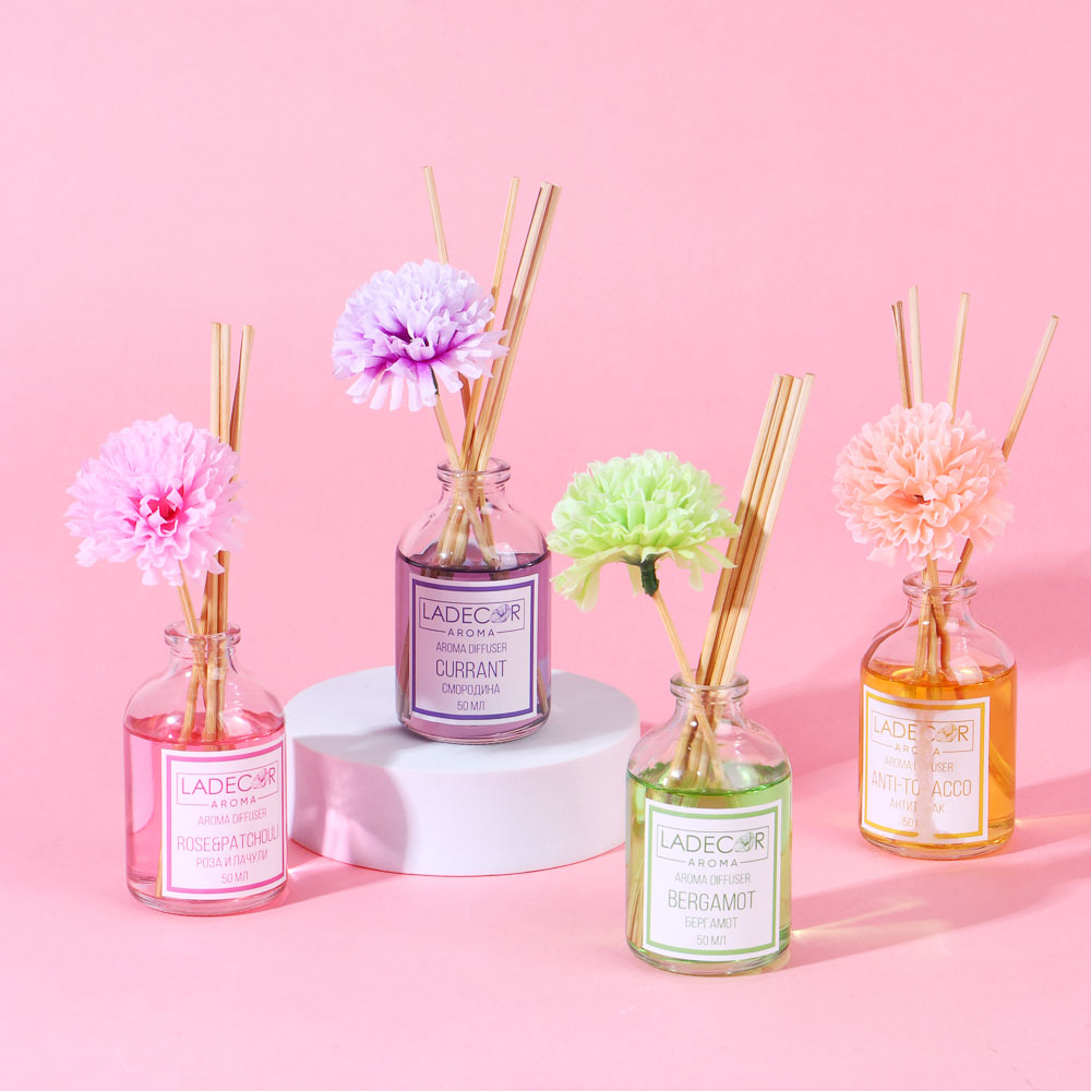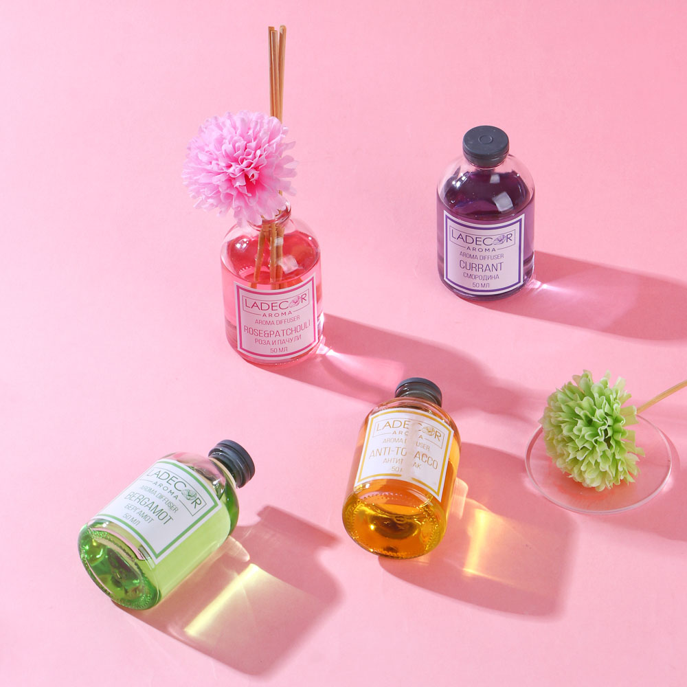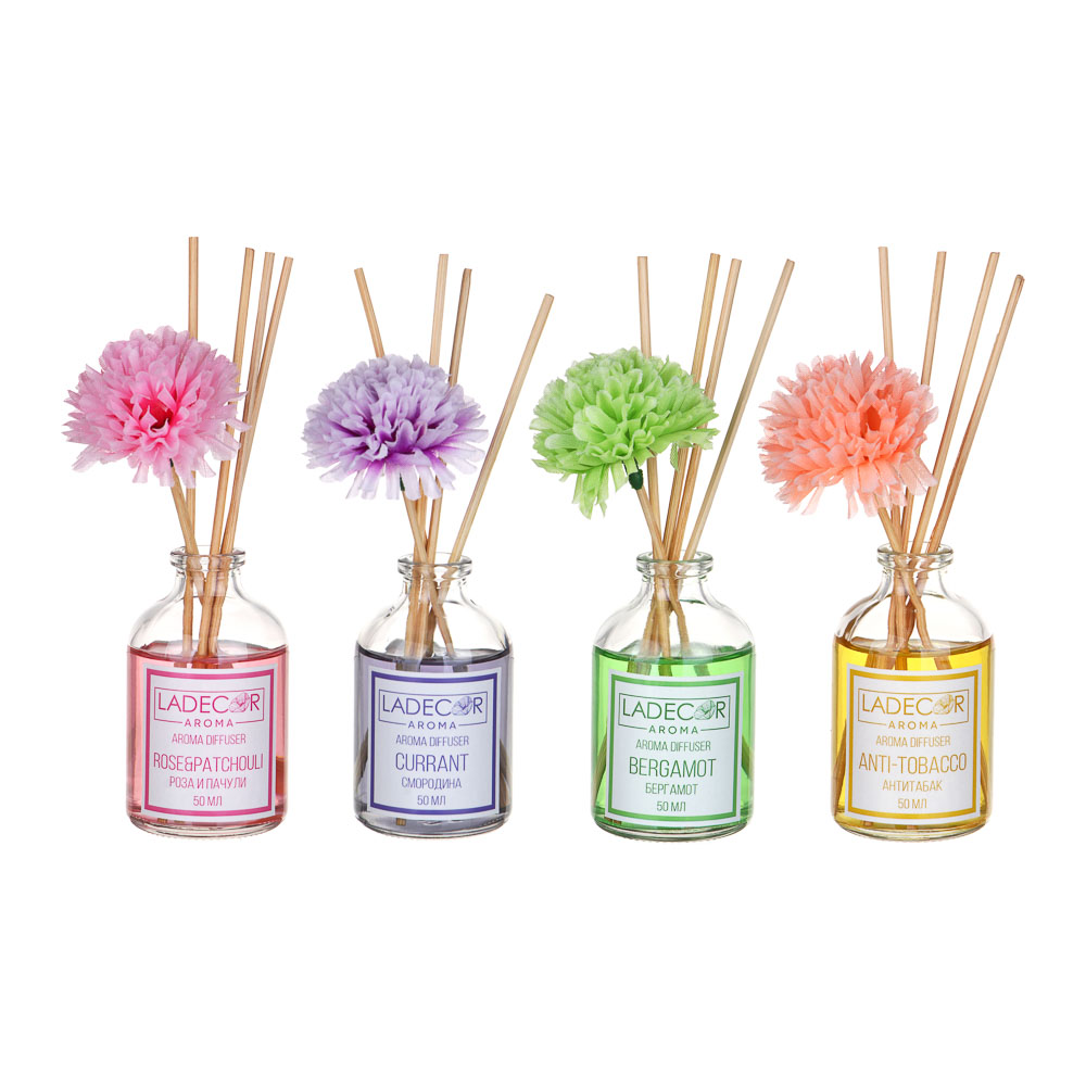 Аромадиффузор LADECOR с декором и палочками объемом 50 мл имеет лаконичный дизайн, который впишется в любой интерьер и станет маленькой акцентной деталью обстановки. Серия из 4 ароматических композиций с разнообразными ароматами на любой вкус позволит насладиться приятным ненавязчивым благоуханием, которое не только освежит пространство, но и подарит отличное настроение, расслабление и умиротворение. Доступные ароматы: роза-пачули, бергамот, смородина, антитабак.