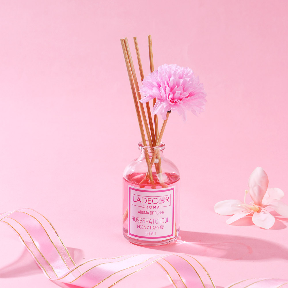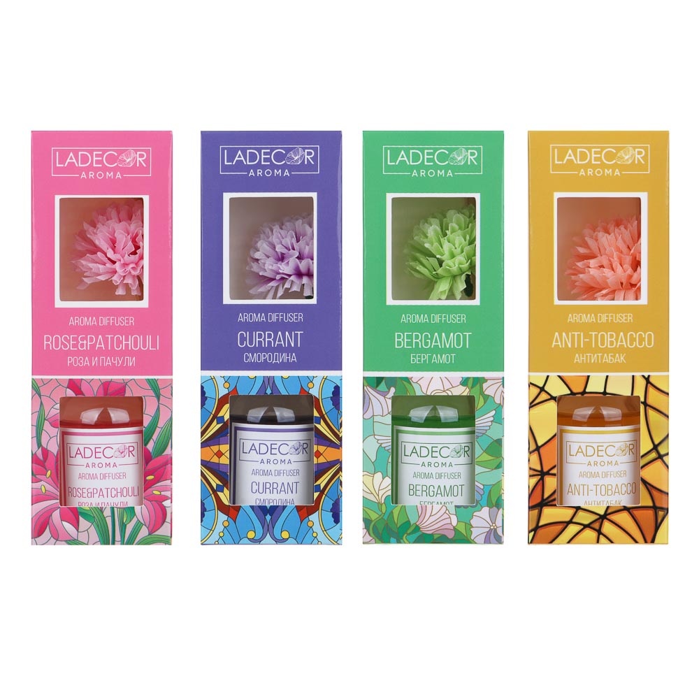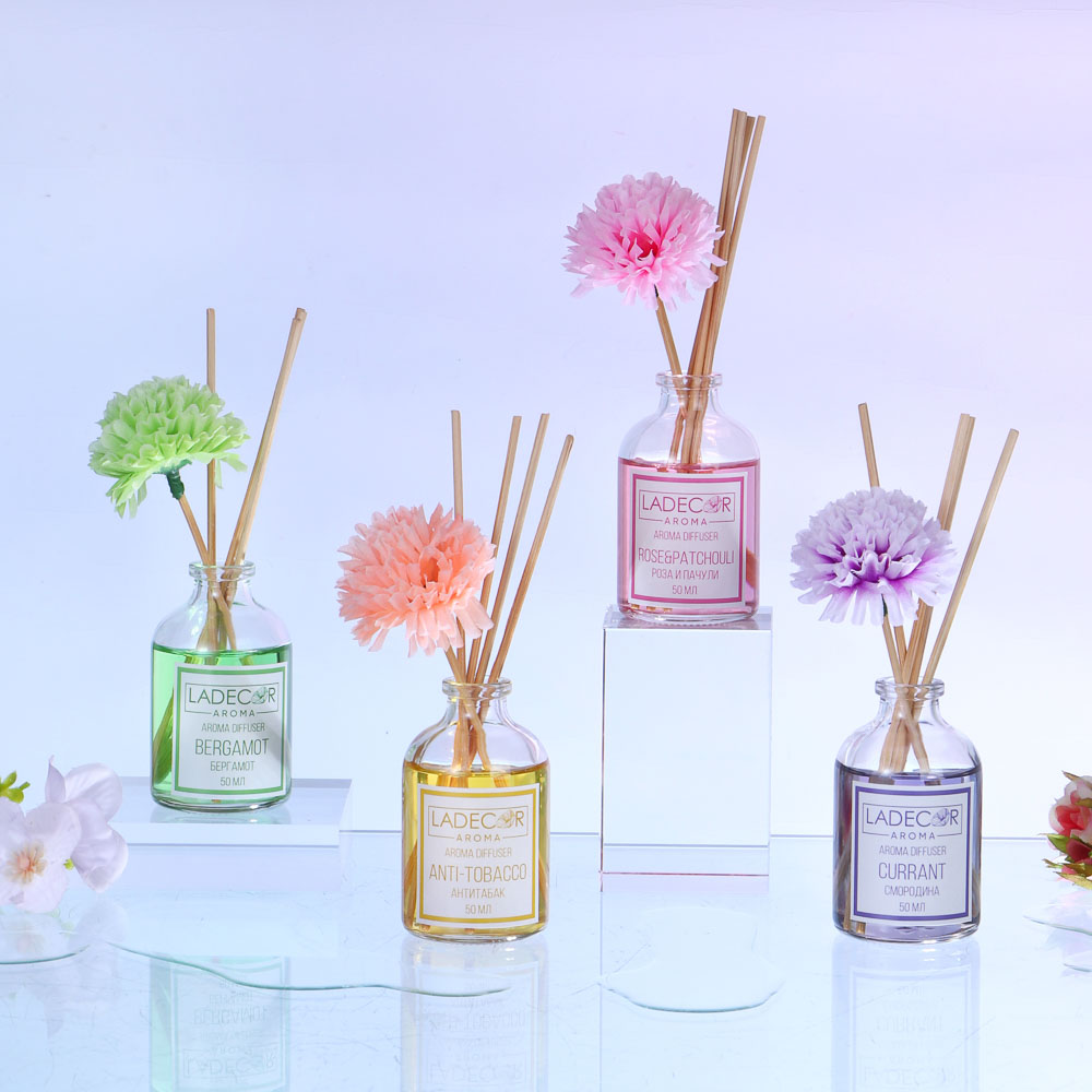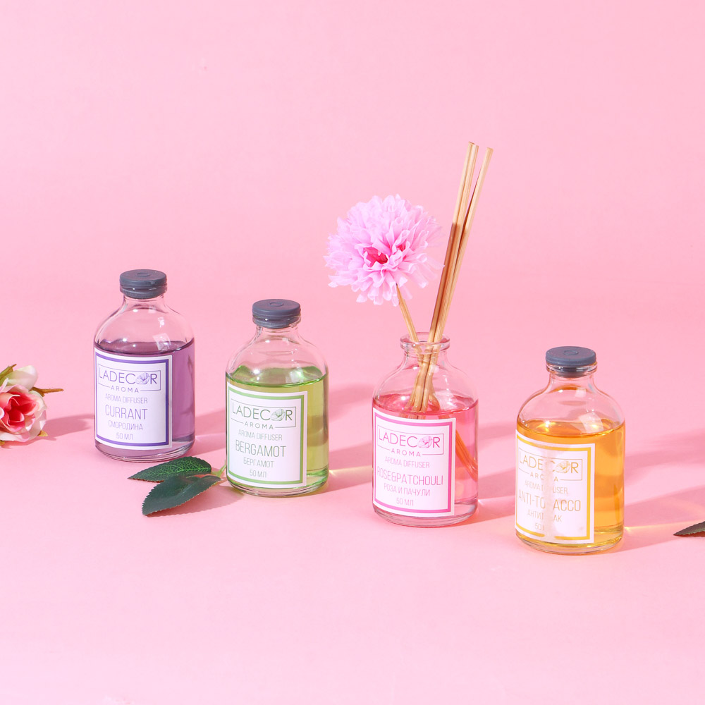 Аромадиффузор LADECOR с декором и палочками объемом 50 мл имеет лаконичный дизайн, который впишется в любой интерьер и станет маленькой акцентной деталью обстановки. Серия из 4 ароматических композиций с разнообразными ароматами на любой вкус позволит насладиться приятным ненавязчивым благоуханием, которое не только освежит пространство, но и подарит отличное настроение, расслабление и умиротворение. Доступные ароматы: роза-пачули, бергамот, смородина, антитабак.