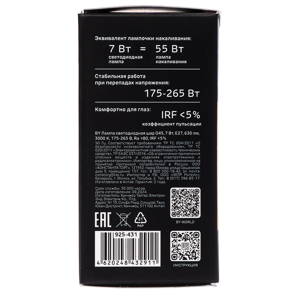 Создайте уютную атмосферу в вашем доме с помощью светодиодной лампы BY G45! Эта декоративная лампа в форме шара с цоколем E27 и мощностью 7 Вт излучает теплый, комфортный свет (3000K) с яркостью 630 Лм. Высокий индекс цветопередачи (Ra>80) гарантирует естественную передачу цветов, а низкий уровень инфракрасного излучения (IRF <5%) делает свет мягким и приятным для глаз. Работает от стандартной сети 175-265 В. Долговечная и энергоэффективная, лампа BY G45 станет отличным дополнением к любому интерьеру, создавая теплую и гостеприимную обстановку. Идеально подходит для настольных ламп, бра и других светильников с цоколем E27.