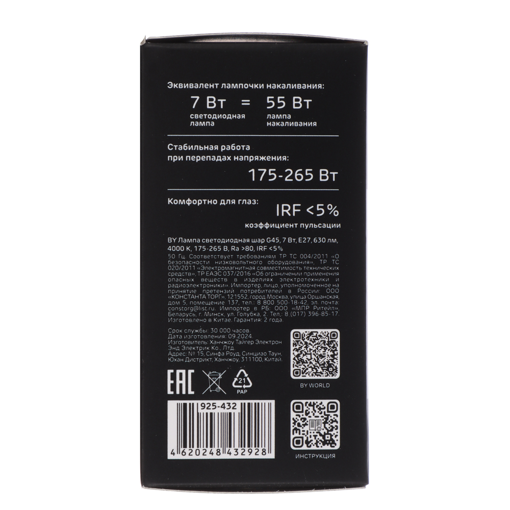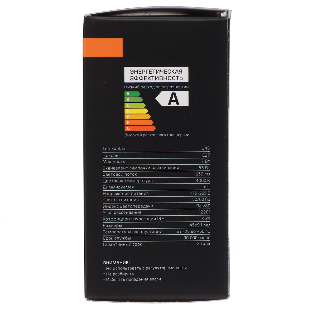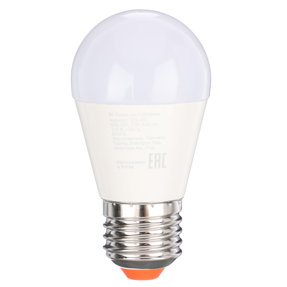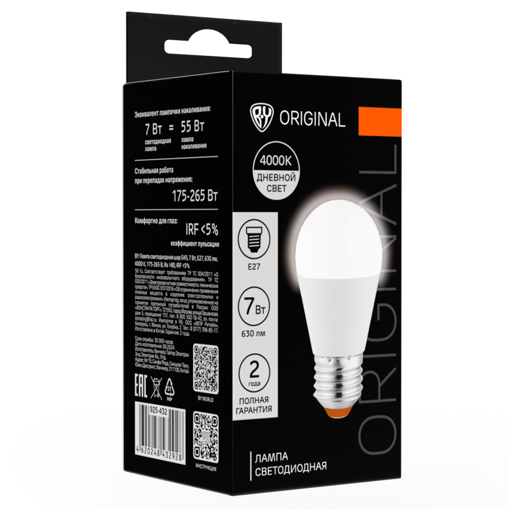 Стильная светодиодная лампа BY G45 в форме шара — это яркое и энергоэффективное решение для освещения вашего дома. Ее нейтрально-белый свет (4000K) создает комфортную атмосферу, а высокая цветопередача обеспечивает естественное восприятие цветов. Благодаря мощности 7 Вт и световому потоку 630 Лм, лампа обеспечивает яркое освещение, потребляя при этом минимум энергии. Подходит для стандартных патронов E27.