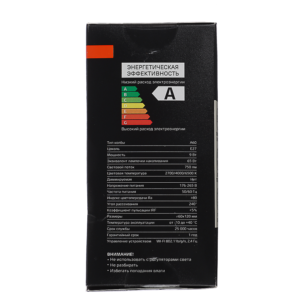 BY Smart A60 - это светодиодная лампочка с цоколем типа Е27 и мощностью 9 Вт. Поддерживает управление через приложение Tuya и совместимо с голосовыми ассистентами Алиса и Яндекс. Излучает световой поток яркостью 750 люмен, цветовая температура варьируется от 2700 до 6500 кельвинов. Есть функция регулировки яркости (диммирования) и изменения цвета (RGB). Работает от сети с напряжением 176-265 В.