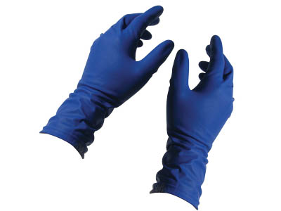 Перчатки синего цвета, нестерильные, неопудренные, повышенной прочности, текстура на пальцах.