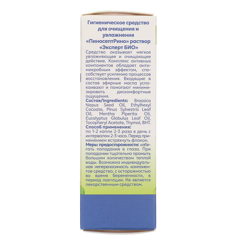 Средство оказывает мягкое увлажняющее и очищающее действие на слизистые оболочки. Комплекс активных компонентов обладает антимикробным и противовоспалительным эффектом, способствует усилению процессов восстановления. Входящие в состав эфирные масла успокаивают и помогают минимизировать дискомфортные ощущения. Гигиеническое средство для очищения и увлажнения "ПиносептРино" - это композиция из трех эфирных масел растительного происхождения, дополнительно обогащенная витамином Е и тимолом. Особенно полезные в осенне-зимний период компоненты средства оказывают смягчающее и восстанавливающее действие. Масло мяты содержит большое количество (до 80%) ментола, который обладает антисептическими, тонизирующими и освежающими свойствами. Масло эвкалиптовое оказывает "отвлекающее" действие, а также обладает местной противовоспалительной и антисептической активностью. Масло сосны является мощным антисептиком, обладает противоотечным действием, усиливает местное кровообращение.