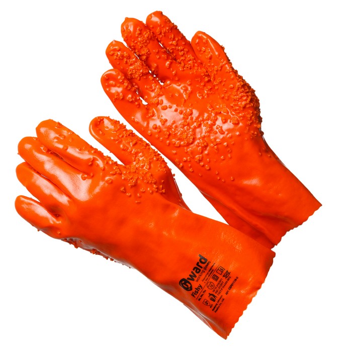 Gward Fishy также известные как "Перчатки рыбообработчика". Полностью покрытые ПВХ удлинённые перчатки с ПВХ крошкой на ладони и пальцах. Подойдут для любой работы, где требуется надёжное сцепление с поверхностью. Длинна 30-31 см. Вес пары перчаток 210 грамм. Конструкция: Перчатки из вязаной хлопчатобумажной основы с антибактериальной пропиткой. Покрытие стойким к пониженным температурам поливинилхлоридом оранжевого цвета. Манжета "ZIG-Zag". Прочная, стойкая к истиранию, проколу, разрыву и порезу перчатка. Покрытие герметично. Защитные свойства ТР ТС: Ми, МП, К 80, Щ 40, Нс, Нм, Нт Анатомическая конструкция перчаток снижает нагрузку на руки и способствует снижению их преждевременной утомляемости. Длительный срок службы и отличные эксплуатационные характеристики.