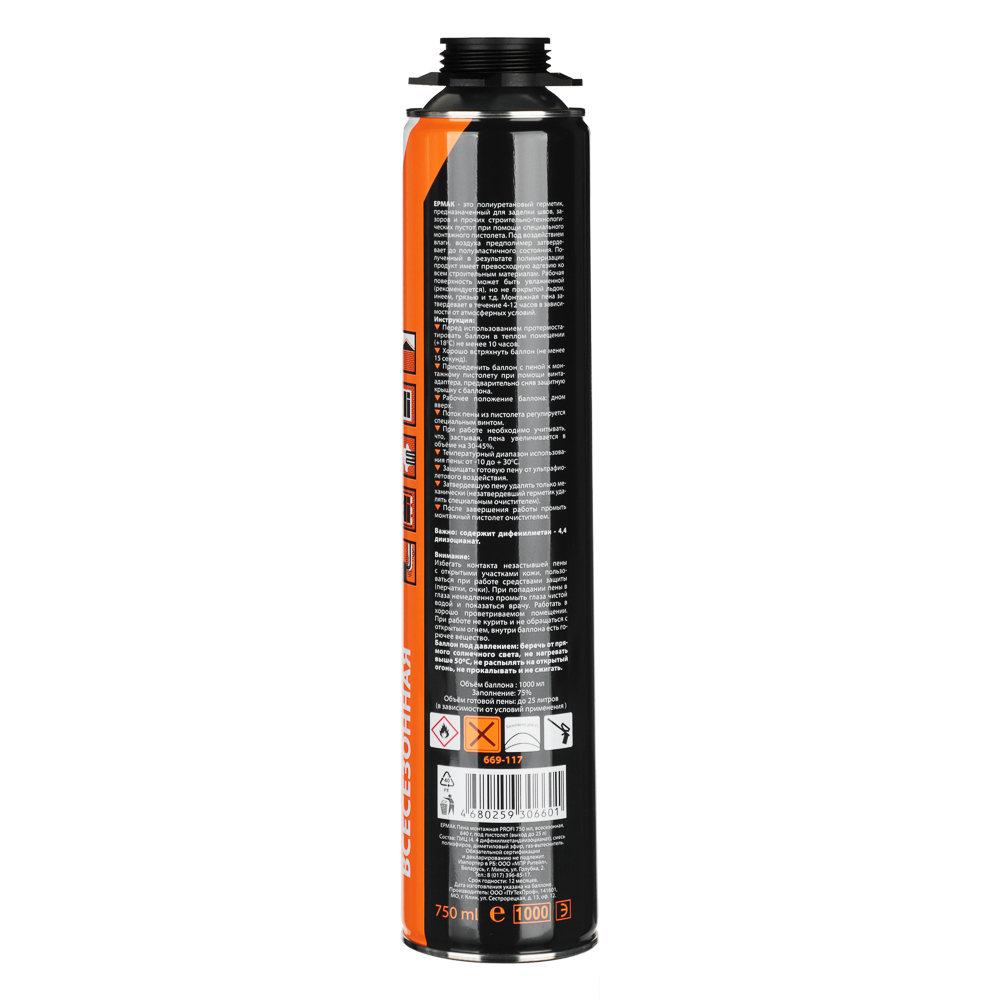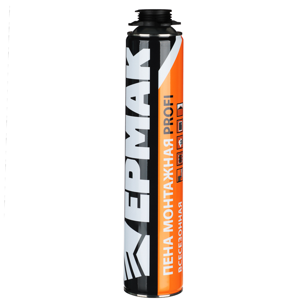 Монтажная пена PROFI ЕРМАК предназначена для профессионального заполнения, герметизации и теплоизоляции швов, стыков и пустот в строительных конструкциях. Всесезонная формула обеспечивает стабильное расширение и надёжное сцепление с различными поверхностями при любых температурах. Баллон объёмом 1 л рассчитан на выход пены до 35 л и предназначен для использования с монтажным пистолетом, что обеспечивает точное и экономичное нанесение. Состав на основе ПИЦ и смеси полиэфиров с добавлением газового вытеснителя гарантирует долговечность и прочность материала. При работе необходимо соблюдать меры безопасности, указанные производителем.