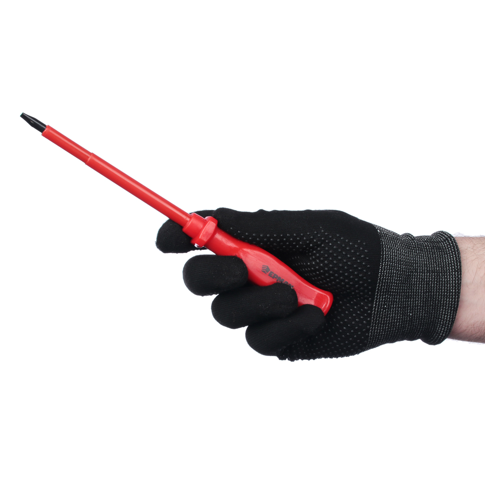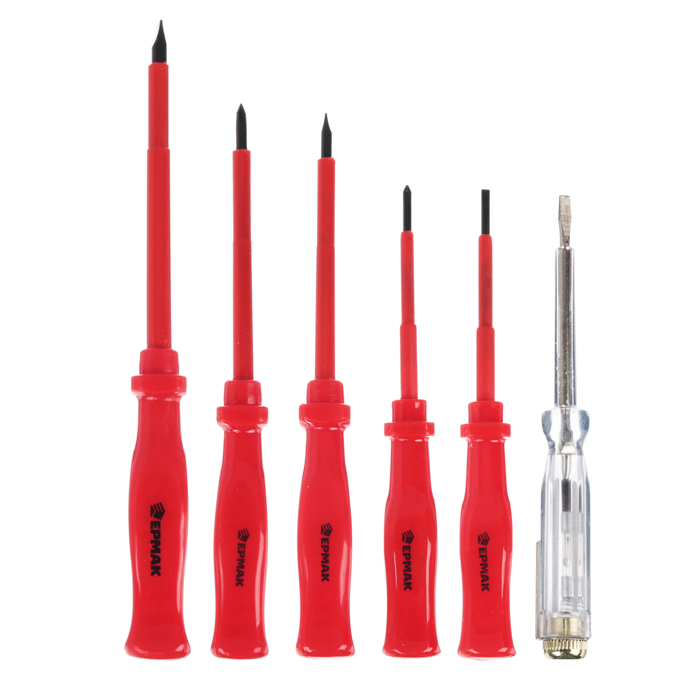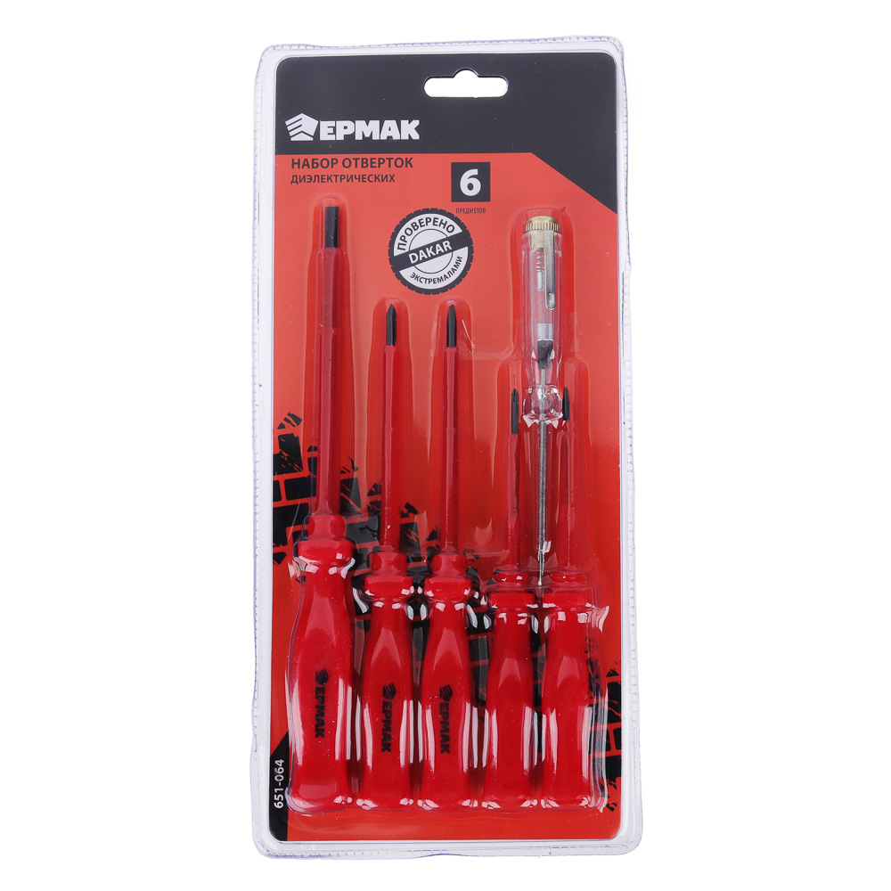 Набор диэлектрических отверток из 6 штук от бренда ЕРМАК предназначен для безопасной работы с электрическими цепями и монтажом оборудования под напряжением до 1000 В. В комплект входят шлицевые SL3 × 75 мм, SL4 × 100 мм, SL5,5 × 125 мм, крестовые PH0 × 75 мм, PH1 × 100 мм, а также тестер 140 мм для проверки проводимости и напряжения. Лезвия изготовлены из хромованадиевой стали, что обеспечивает прочность, долговечность и высокую износостойкость инструмента. Эргономичные изоляционные ручки гарантируют надёжный хват и защиту от поражения электрическим током. Набор подходит как для профессиональных электромонтажных работ, так и для бытового использования, сочетая безопасность, удобство и точность при работе.