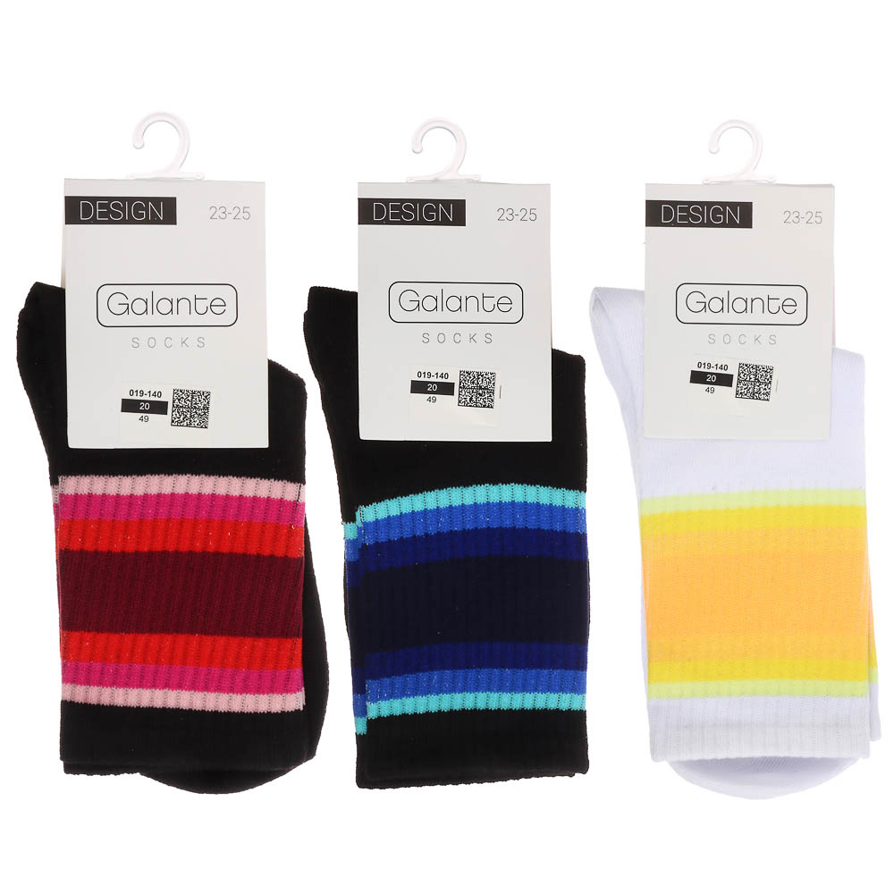 Женские носки GALANTE размером 23-25 — это яркий, стильный и комфортный аксессуар. Изготовлены из качественной смесовой пряжи: 85% натурального хлопка обеспечивает мягкость, гигиеничность и отличную воздухопроницаемость, 10% полиэстера придает прочность, устойчивость к деформации и быстрое высыхание, а 5% спандекса гарантирует эластичность и идеальную посадку по ноге без стягивания. Носки имеют классическую среднюю длину. Дизайн отличается современным и жизнерадостным стилем: на верхней части носков расположены широкие, яркие горизонтальные полосы. В ассортименте.