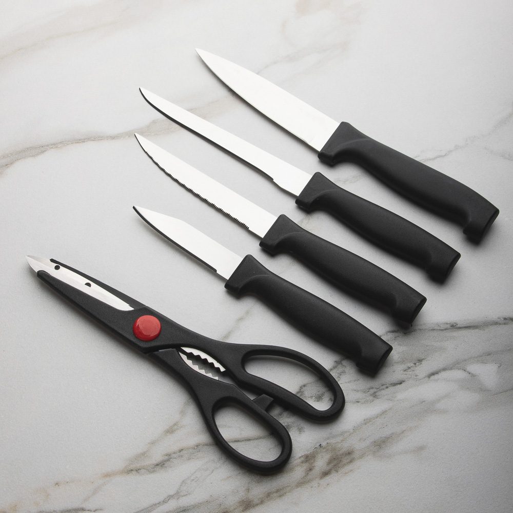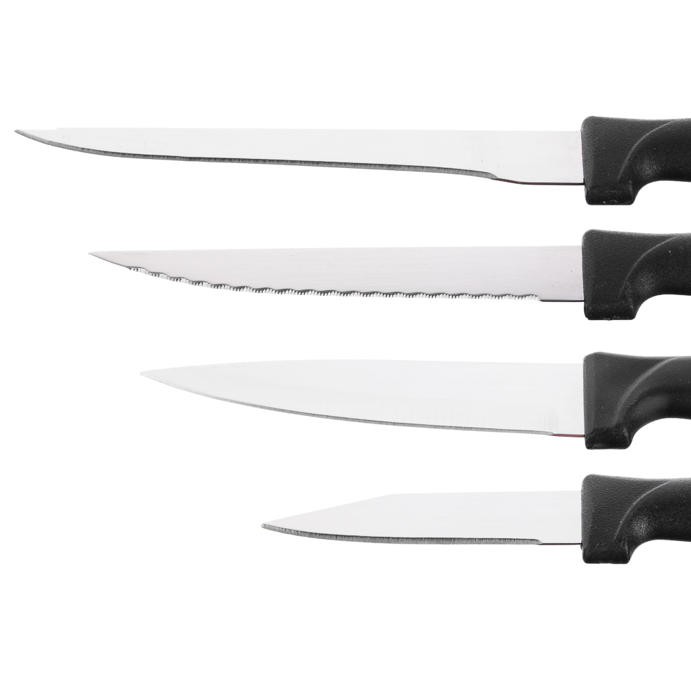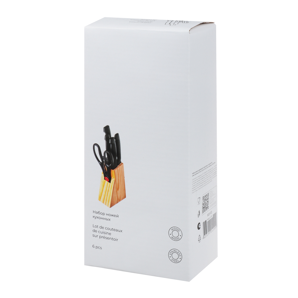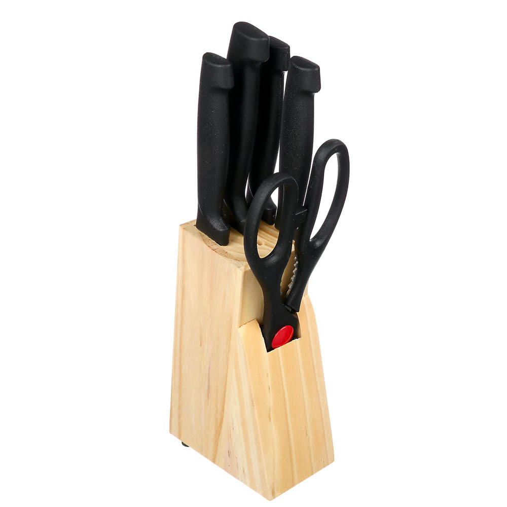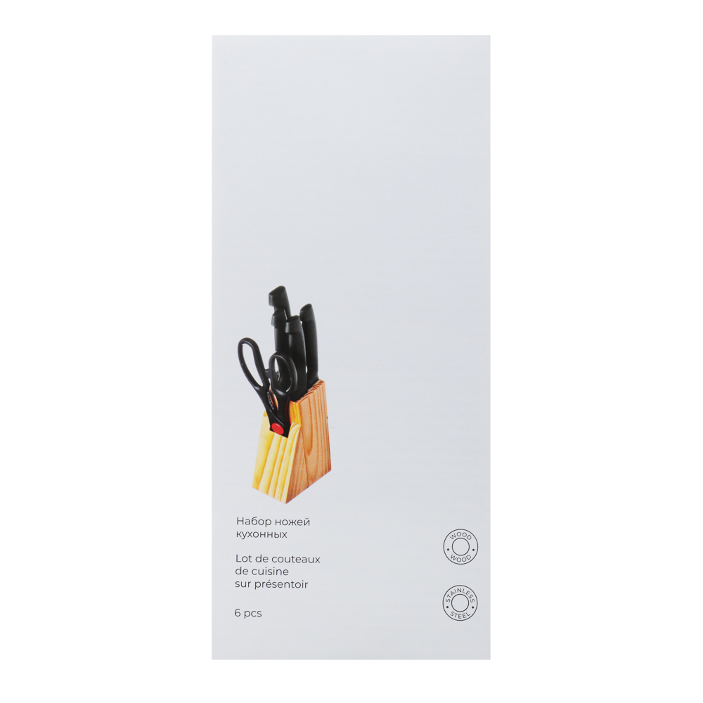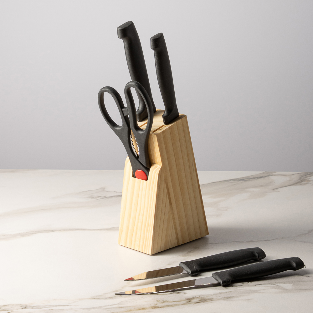 Набор из 5 предметов в деревянной подставке - идеальный выбор для любой кухни! В комплект входят ножи различных размеров: 7,5 см, 11,5 см, 12 см, 14 см, а также ножницы. Лезвия из нержавеющей стали имеют острую заводскую заточку, не подвержены коррозии. Эргономичные ручки гарантируют удобный и безопасный захват во время работы. Набор станет отличным дополнением к любой кухне и позволит вам с легкостью решать различные кулинарные задачи - от нарезки овощей до разделки мяса. Деревянная подставка не только обеспечивает удобное хранение ножей, но и придает набору стильный и элегантный вид. Обновите свою коллекцию кухонных инструментов уже сегодня!