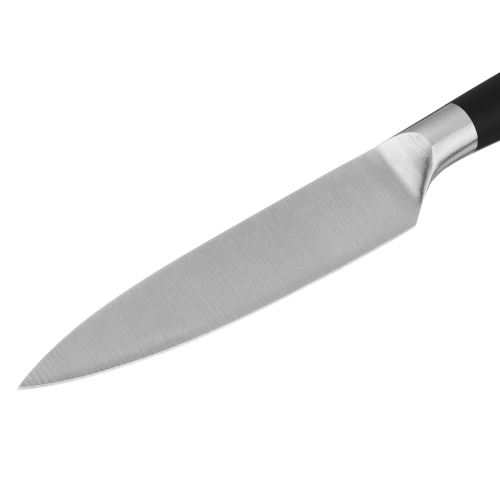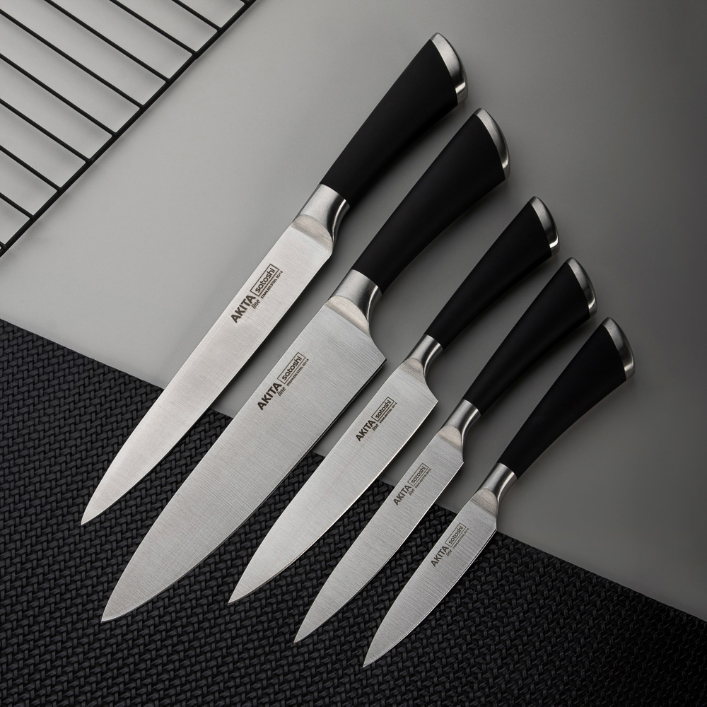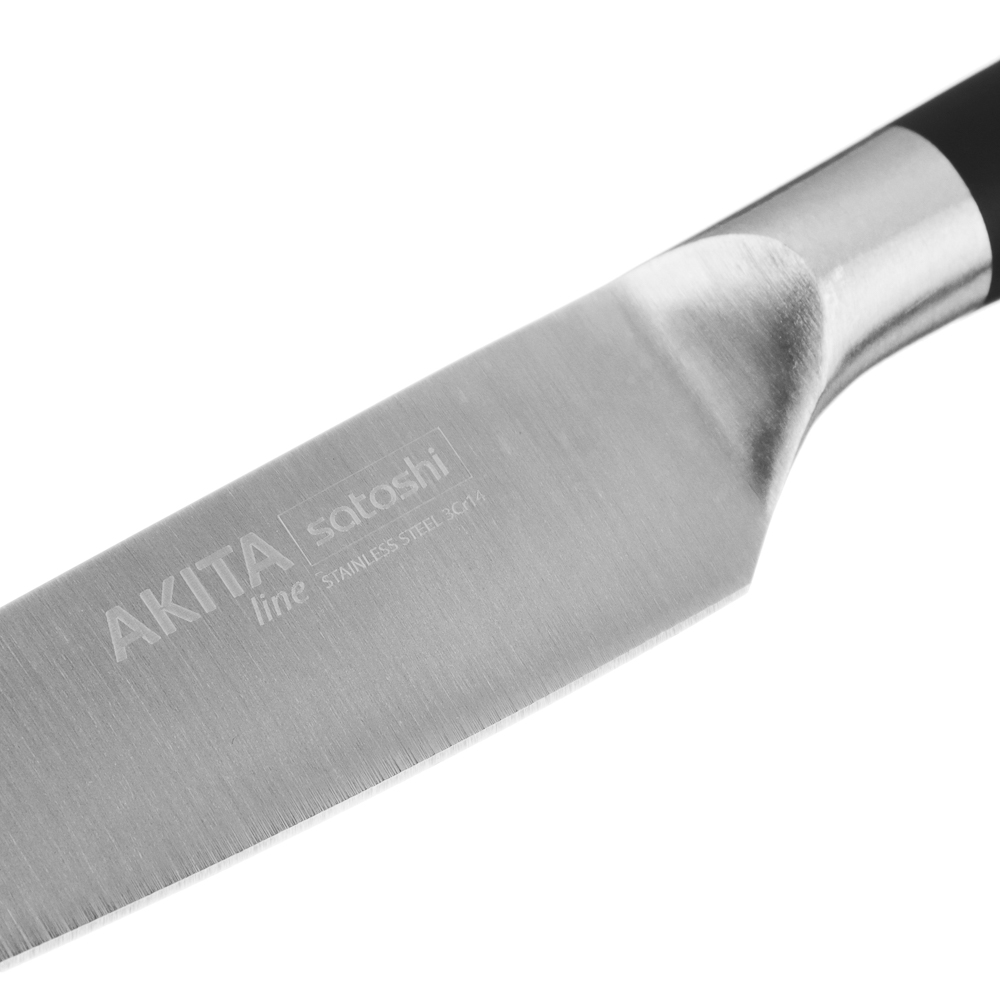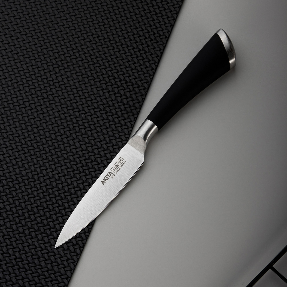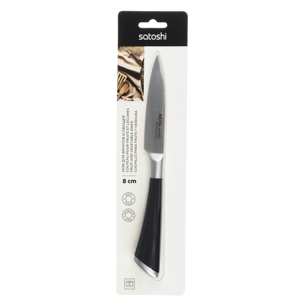 Идеальный выбор для любителей домашней кухни - овощной кухонный нож SATOSHI Акита с длиной лезвия 8 см. Маленький нож удобен для нарезки и чистки овощей и фруктов от кожуры. Рукоять с покрытием софт-тач удобно фиксируется в руке, не выскальзывая в процессе использования. Сталь долго держит заточку, не боится коррозии. Имеет строгий стильный дизайн.