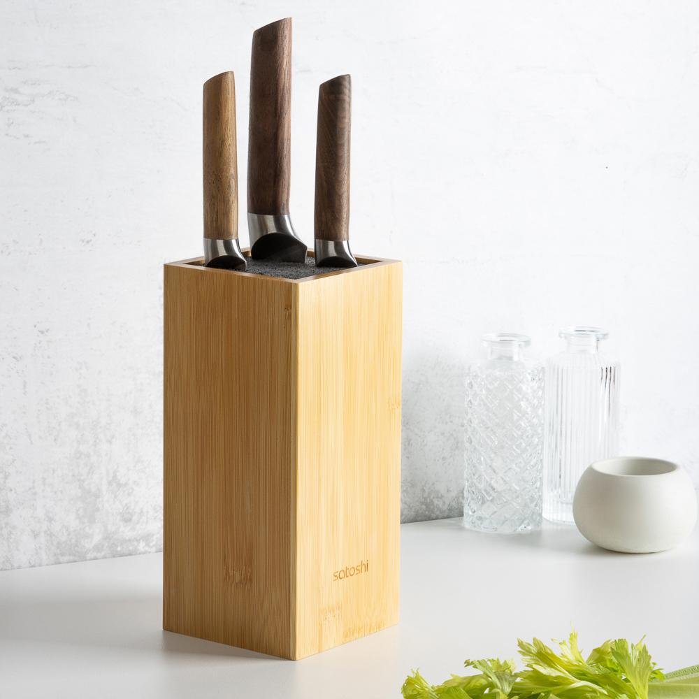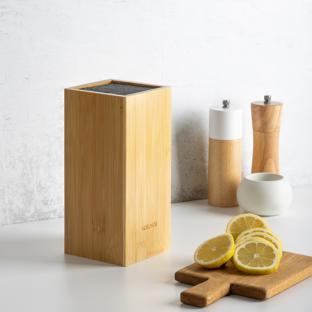 Современная подставка для ножей «Бамбук» с полипропиленовыми разделителями позволит содержать кухню в порядке и чистоте. Все нужные вам ножи всегда будут находиться в одном месте. Диаметр 10 см, высота 22,5 см. Полипропиленовые разделители позволяют хранить ножи безопасно и аккуратно, предотвращая их соприкосновение друг с другом и повреждение лезвий. Подставка компактна и легко вписывается в любой интерьер, добавляя нотку эко-стиля вашей кухне. Подставка для ножей SATOSHI станет незаменимым аксессуаром для каждого любителя готовить, обеспечивая надежное хранение и защиту ножей.