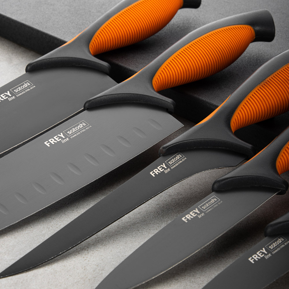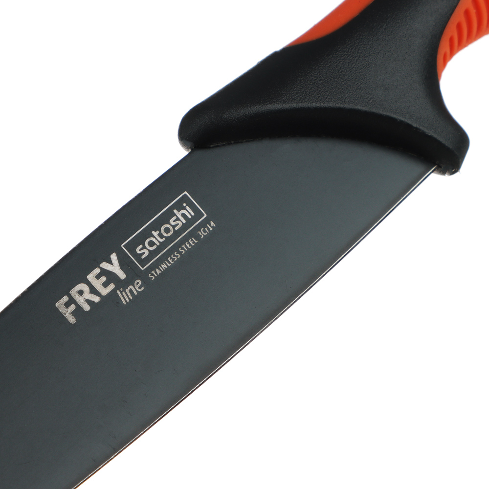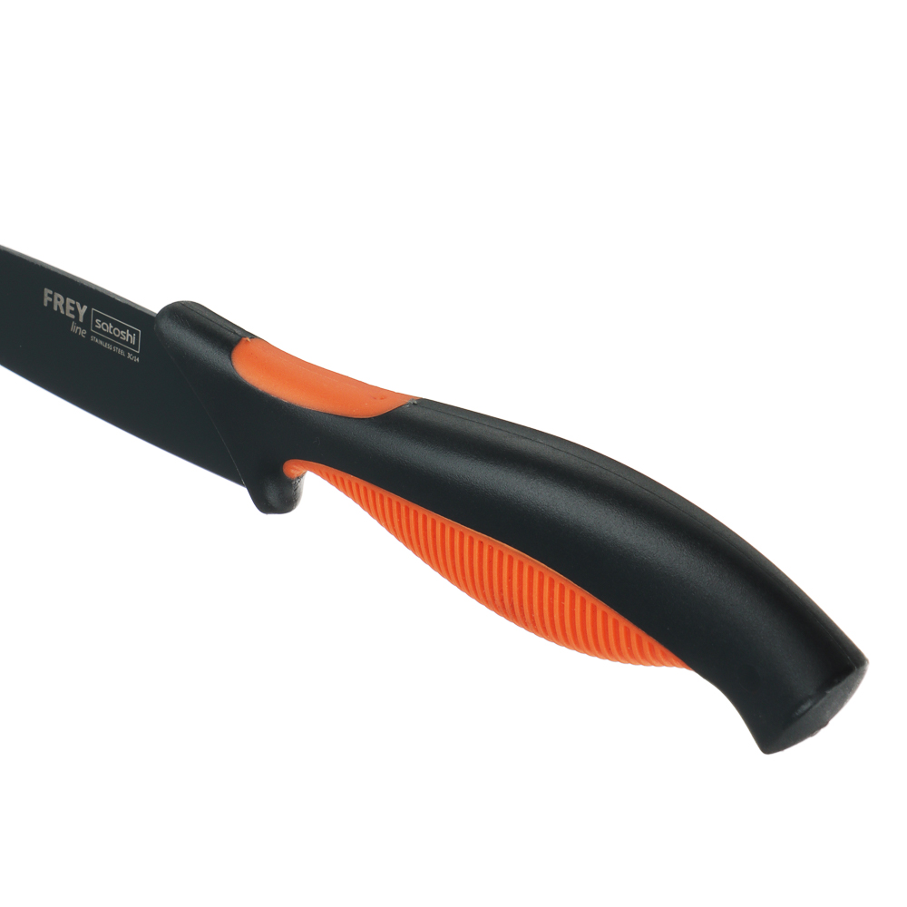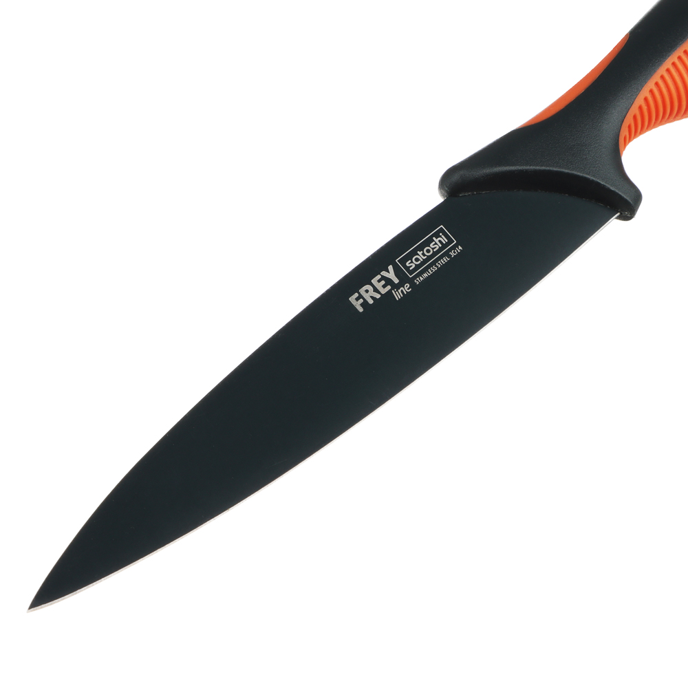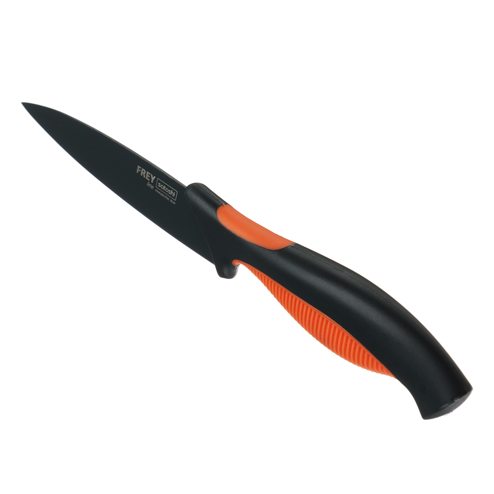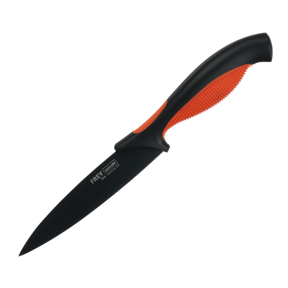 Овощной кухонный нож SATOSHI «Фрей» с длиной клинка 12,5 см из нержавеющей стали с экологичным антиналипающим покрытием – универсальное решение для домашней кухни. Компактный нож удобен для очистки овощей и фруктов, а также для нарезки продуктов. Тонкое лезвие беспрепятственно проникает в продукт, что позволяет производить нарезку тонкими ломтиками. Рукоятка с антискользящей ребристой накладкой и покрытием софт-тач не выскальзывает из рук и не вызывает усталости в области кисти даже при длительной работе ножом. Сталь устойчива к коррозии и не влияет на вкус продуктов.