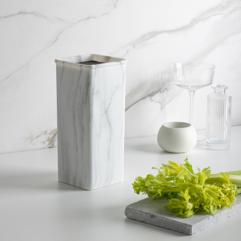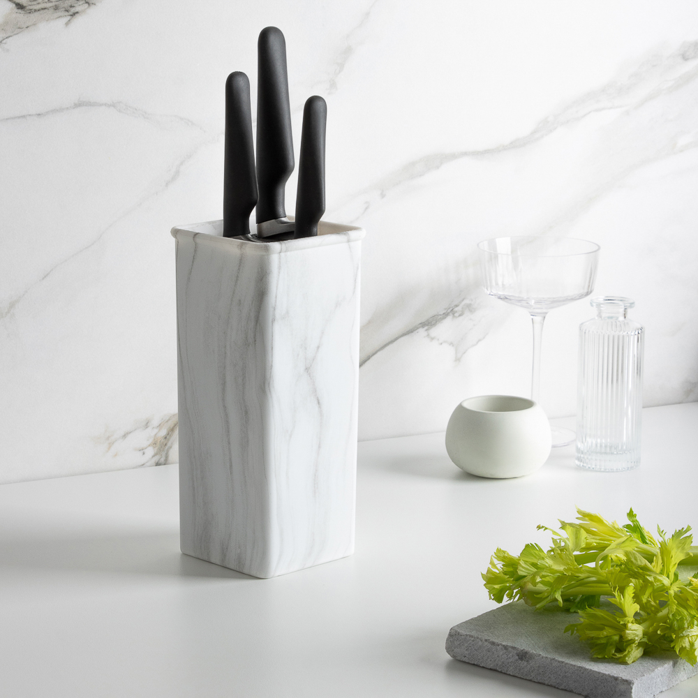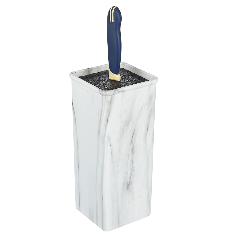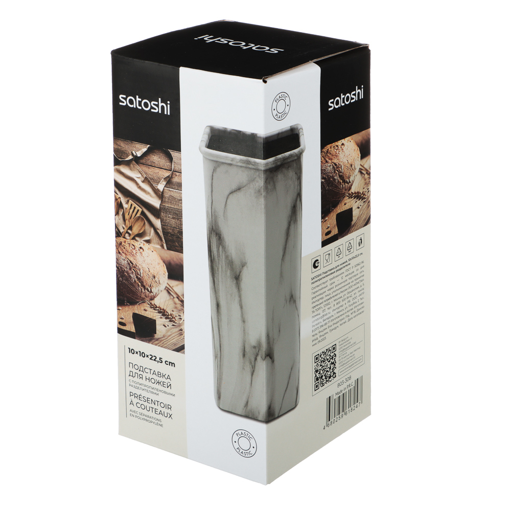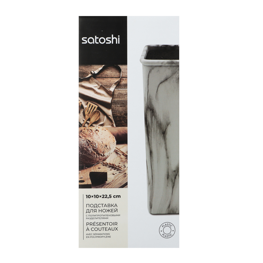 Универсальная подставка для ножей Мрамор от SATOSHI размером 10x10x22,5 см позволяет легко разместить ее на любой кухне. Дизайн под мрамор выглядит современно и будет гармонично сочетаться с любым интерьером. Благодаря полипропиленовым разделителям ножи будут храниться безопасно и надежно, не соприкасаясь друг с другом, что предотвратит их повреждение. Такая подставка станет отличным дополнением для вашей кухни и поможет сохранить остроту ножей.