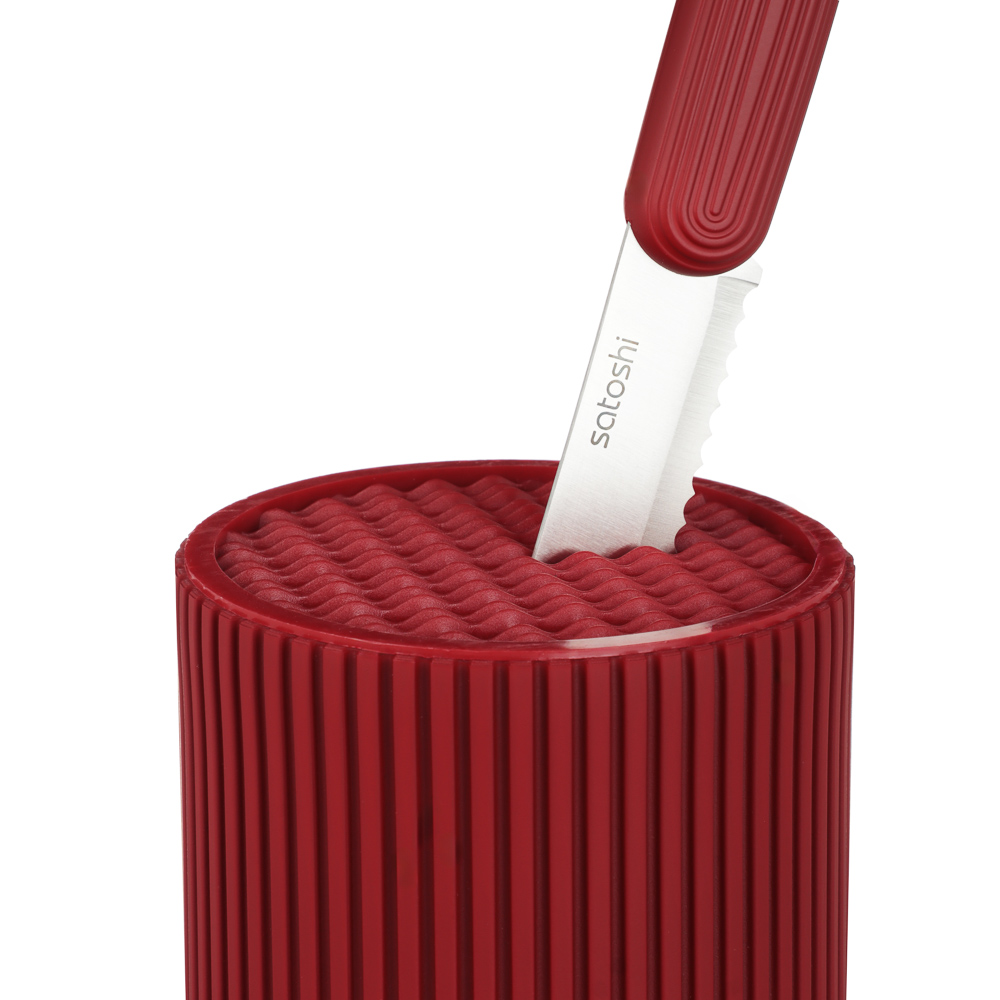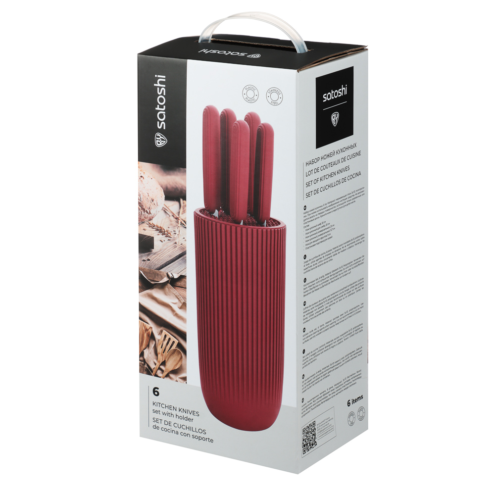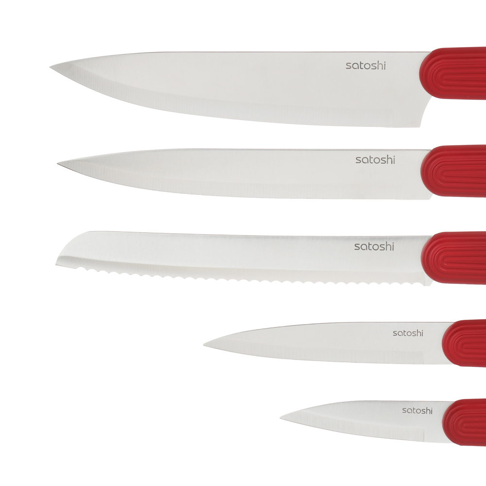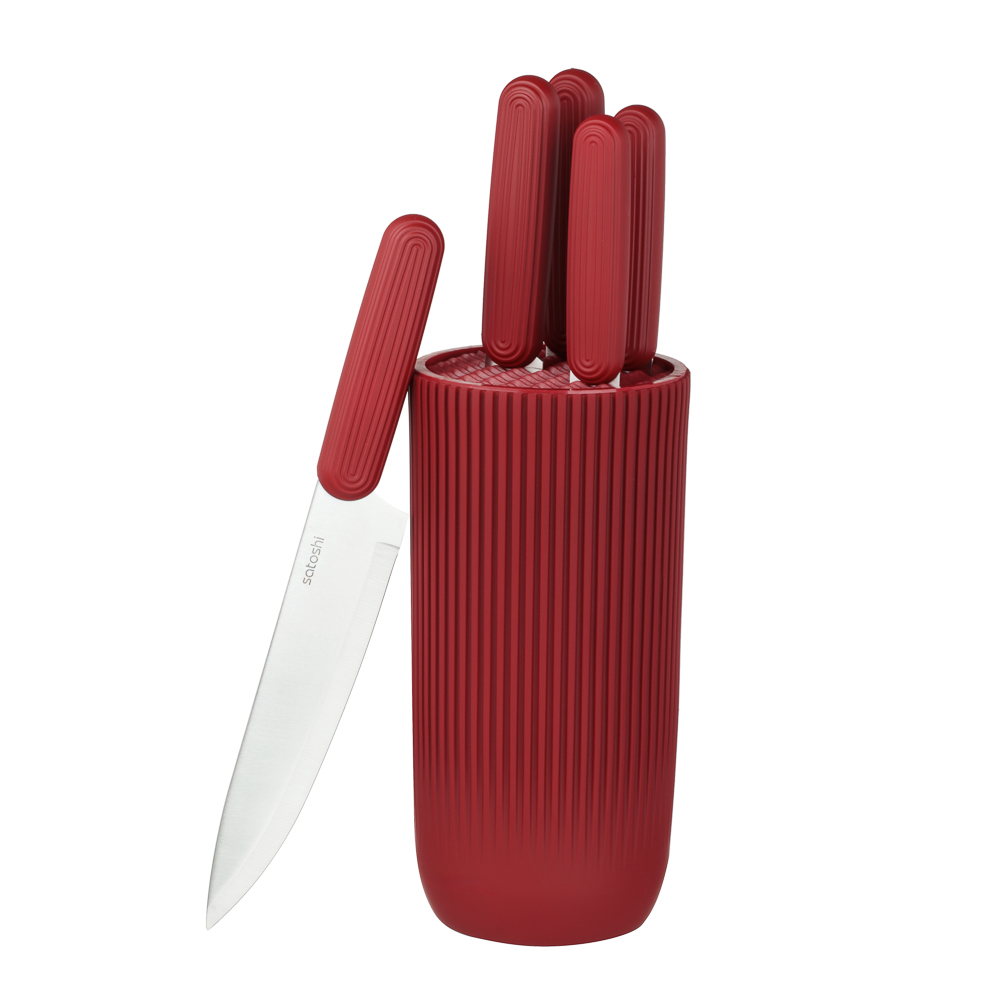 Набор кухонных ножей SATOSHI Райден на подставке с полипропиленовыми разделителями включает 5 практичных ножей, которые подходят для любых кулинарных целей: для шинковки в шефской технике, обвалки, деликатной тонкой нарезки, рубки и чистки овощей и фруктов. Комплект имеет стильный яркий дизайн, поэтому займет достойное место в интерьере кухне, а также компактно разместится на столешнице. Ножи имеют острую заточку, а лезвия из высококачественной нержавеющей стали не боятся коррозии и долго сохраняют остроту. Эргономичные рукоятки не вызывают усталости в кисти даже при длительной работе. Отличное решение для домашней кухни.