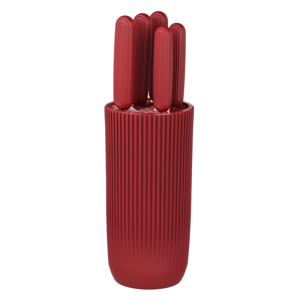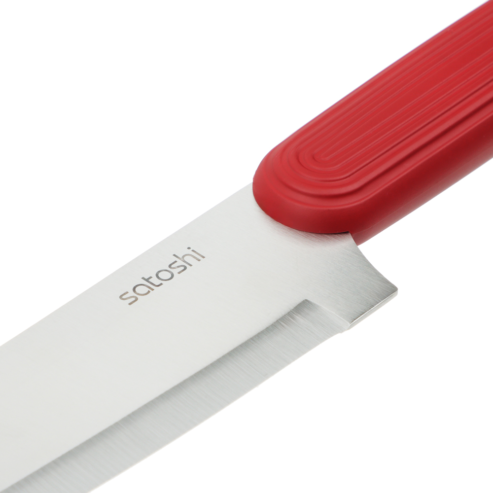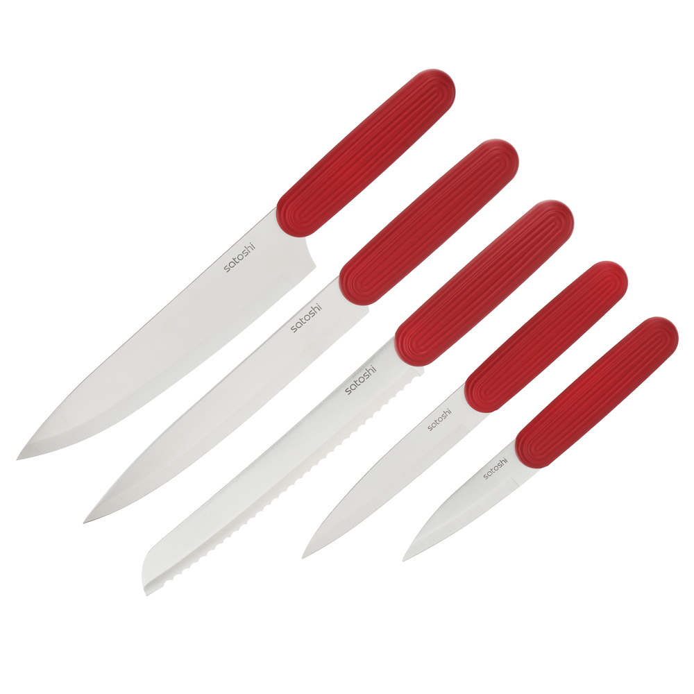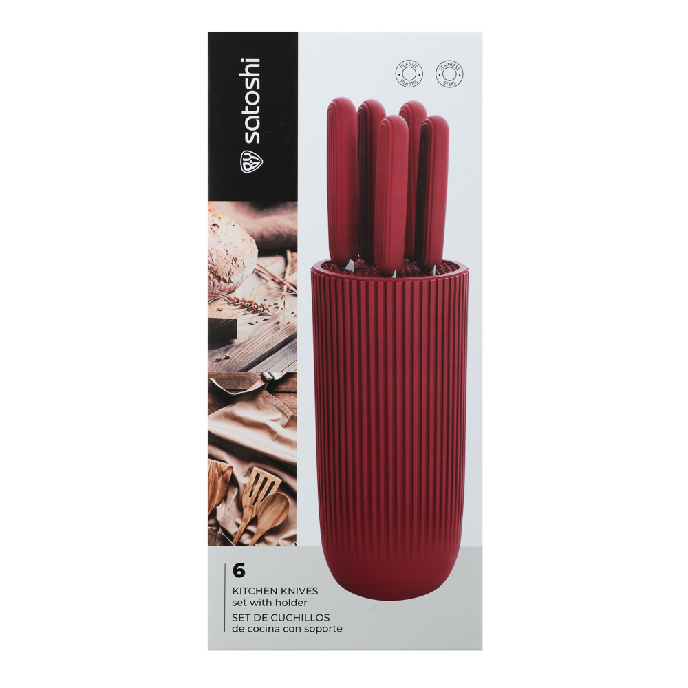 Набор кухонных ножей SATOSHI Райден на подставке с полипропиленовыми разделителями включает 5 практичных ножей, которые подходят для любых кулинарных целей: для шинковки в шефской технике, обвалки, деликатной тонкой нарезки, рубки и чистки овощей и фруктов. Комплект имеет стильный яркий дизайн, поэтому займет достойное место в интерьере кухне, а также компактно разместится на столешнице. Ножи имеют острую заточку, а лезвия из высококачественной нержавеющей стали не боятся коррозии и долго сохраняют остроту. Эргономичные рукоятки не вызывают усталости в кисти даже при длительной работе. Отличное решение для домашней кухни.