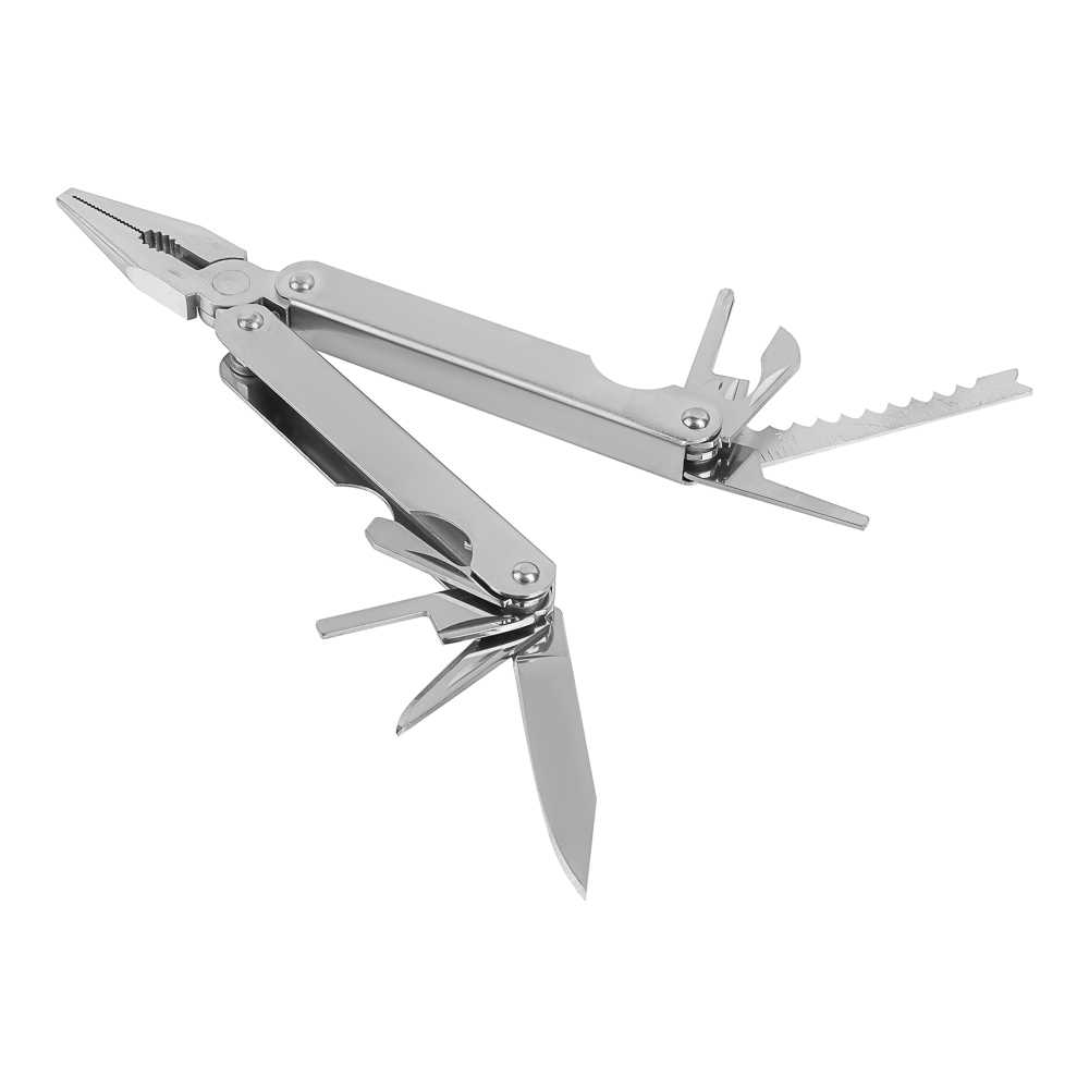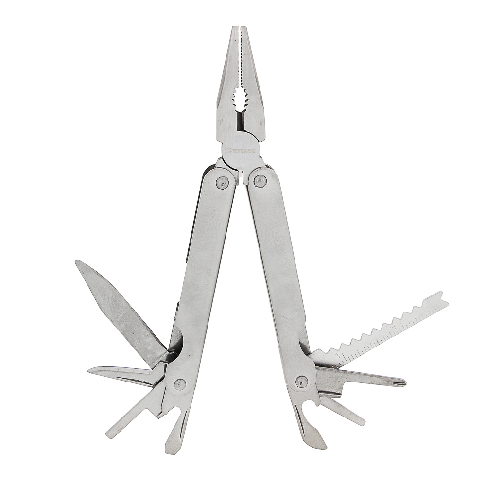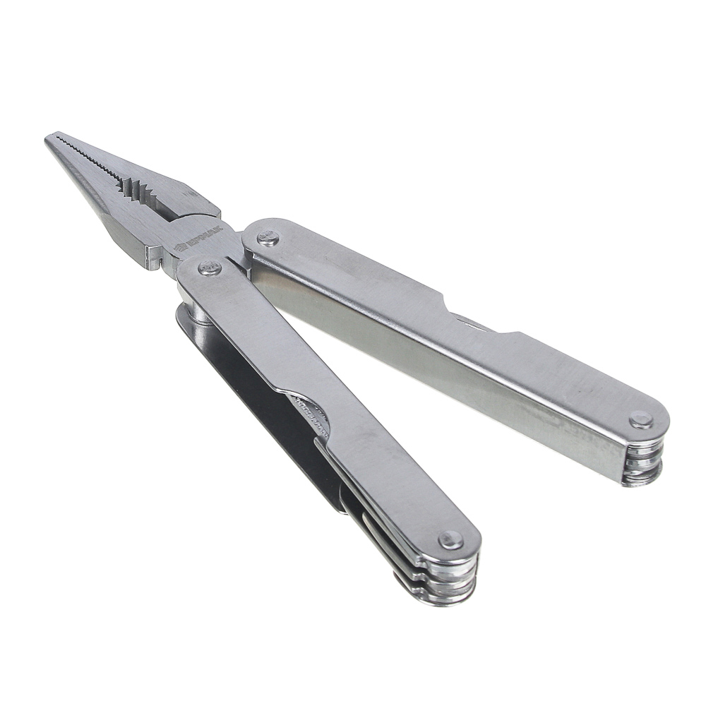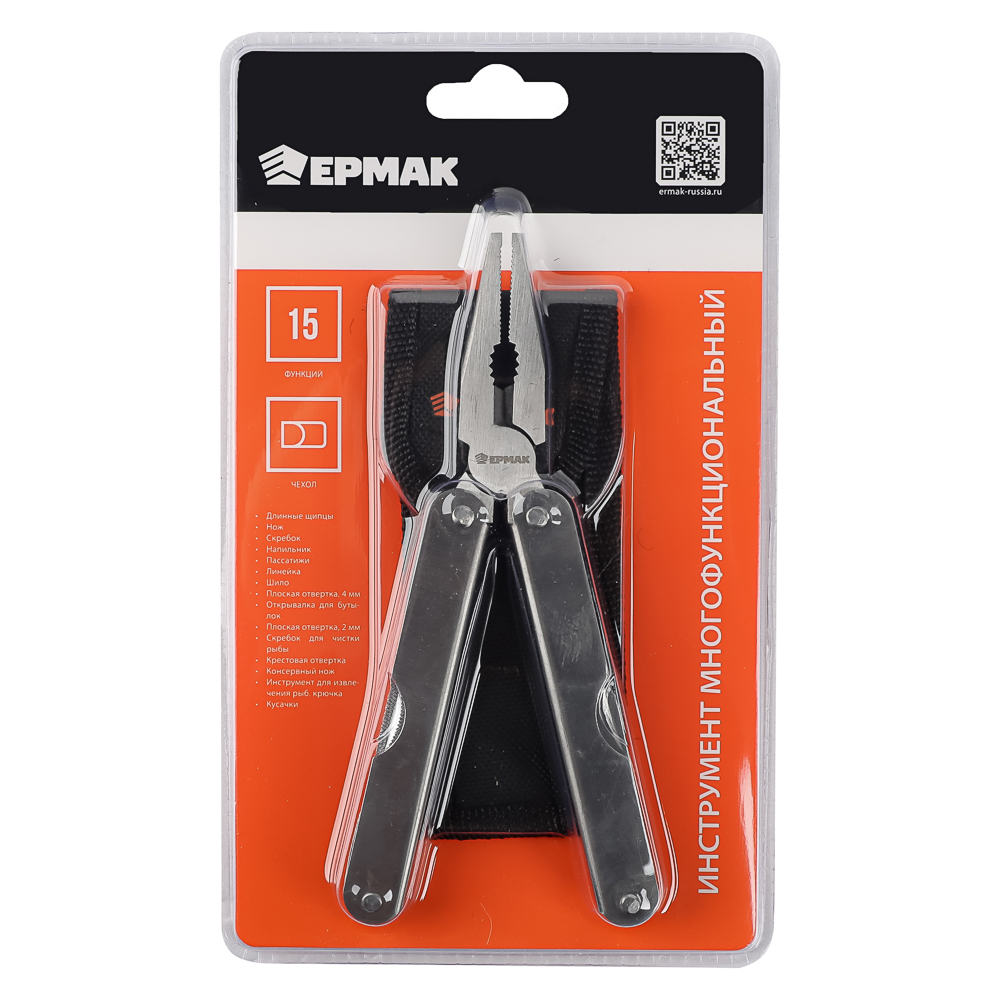 Многофункциональный инструмент ЕРМАК умеет больше, чем вы думаете. Он пригодится для решения домашних бытовых вопросов, ремонта автомобиля, на рыбалке, охоте и в туристическом походе. В наборе есть два ножа разных размеров. Открывашка поможет быстро открыть бутылку, а консервный нож — подготовить ингредиенты для приготовления обеда. Крестовая и прямая отвертки всегда нужны в хозяйстве. Незаменимые помощники каждого мужчины — длинные щипцы, кусачки и пассатижи. Также в набор входят: шило, линейка и съемник крючка. С таким функционалом вы сможете легко решить любую проблему.