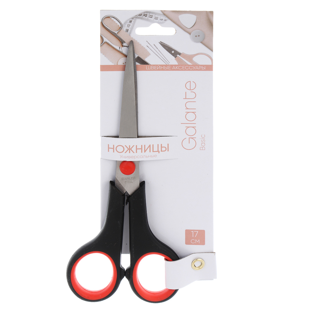 Универсальные ножницы длиной 17 см. Отлично подойдут для различных бытовых нужд: для работы с бумагой, картоном, полиэтиленом. Ножницы удобно лежат в руке, а их острые лезвия обеспечивают идеально ровный срез. Пластиковые ручки обеспечивают удобное положение инструмента в руке. Купить товар можно, добавив его в корзину.