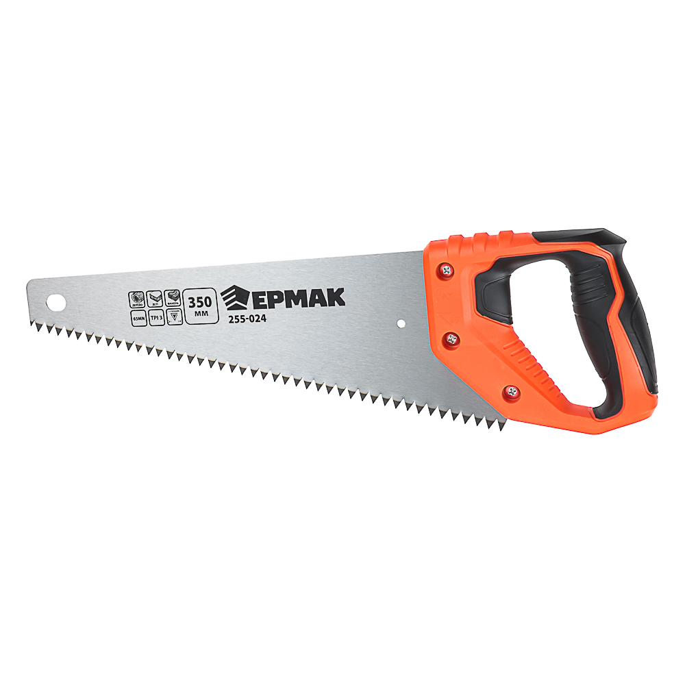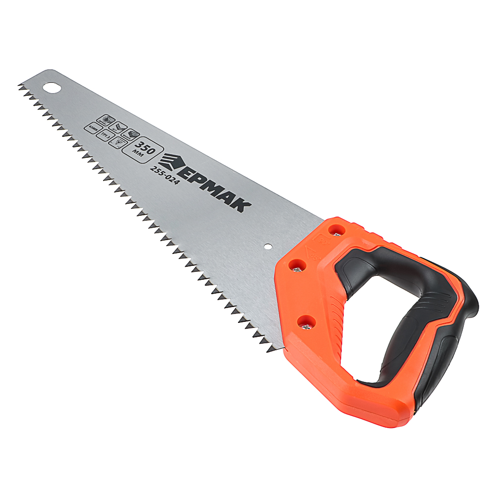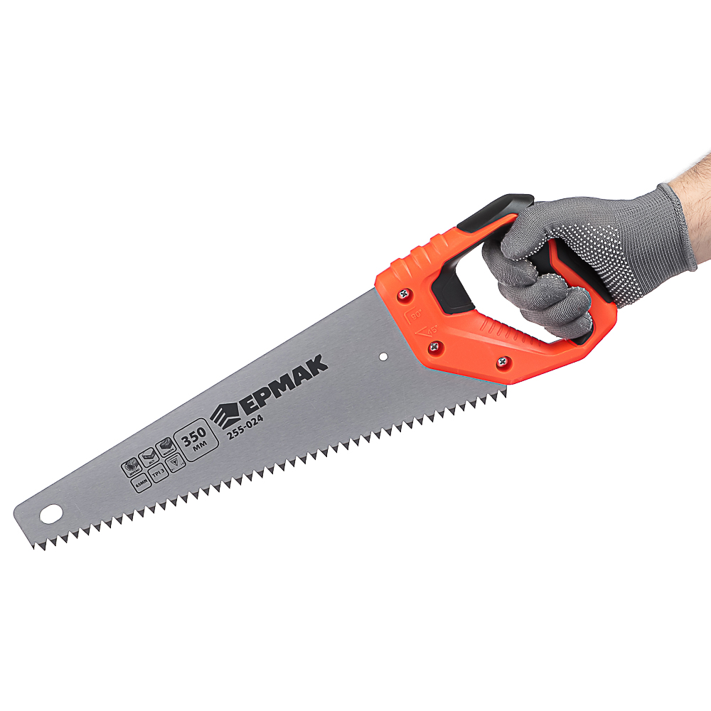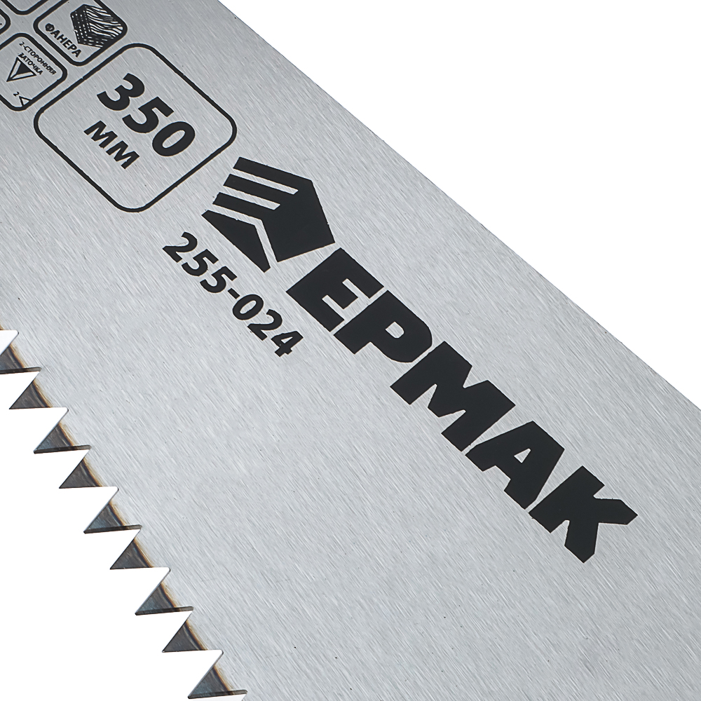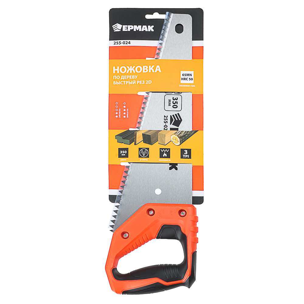 Ножовка по дереву ЕРМАК «Быстрый рез 2D» 350 мм отлично подходит для распила древесины вдоль и поперек волокон. Применяется в строительстве, ремонте, а также в столярно-слесарных работах. Большие зубья с шагом TPI 3 с заточкой 2D обеспечивают высокую скорость реза. Качественная закаленная сталь 65MN твердостью HRC 50 обладает повышенной стойкостью к износу и трению. Двухкомпонентная эргономичная рукоятка обеспечивает удобный захват и снижает вибрацию на руку.