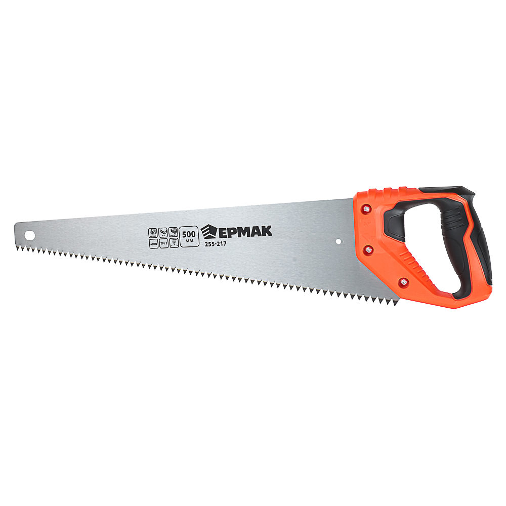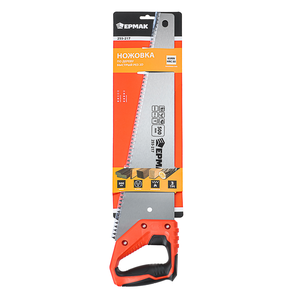 Ножовка по дереву ЕРМАК «Быстрый рез 2D» с полотном увеличенной длины 500 мм подходит для распила крупных заготовок из дерева и материалов на его основе. Шаг зубьев TPI 3 подходит для грубого распила бревен и досок. Размер зуба 8 мм и 2D заточка обеспечивают быстрый рез, значительно ускоряя процесс работы. Закаленная сталь 65MN хорошо держит заточку и подлежит заточке по мере износа. Легкая эргономичная пластиковая ручка с антискользящей вставкой обеспечит комфорт во время работы.