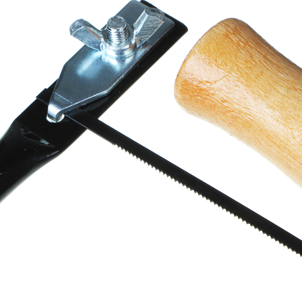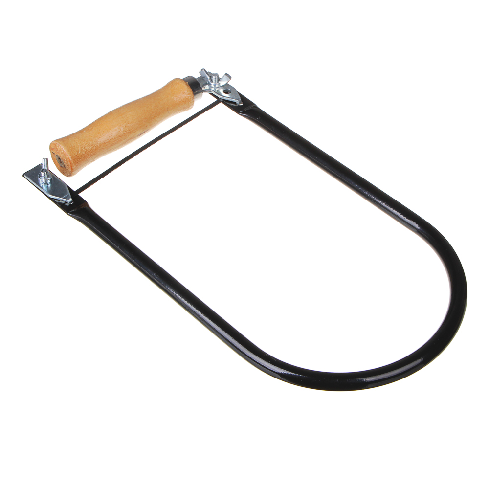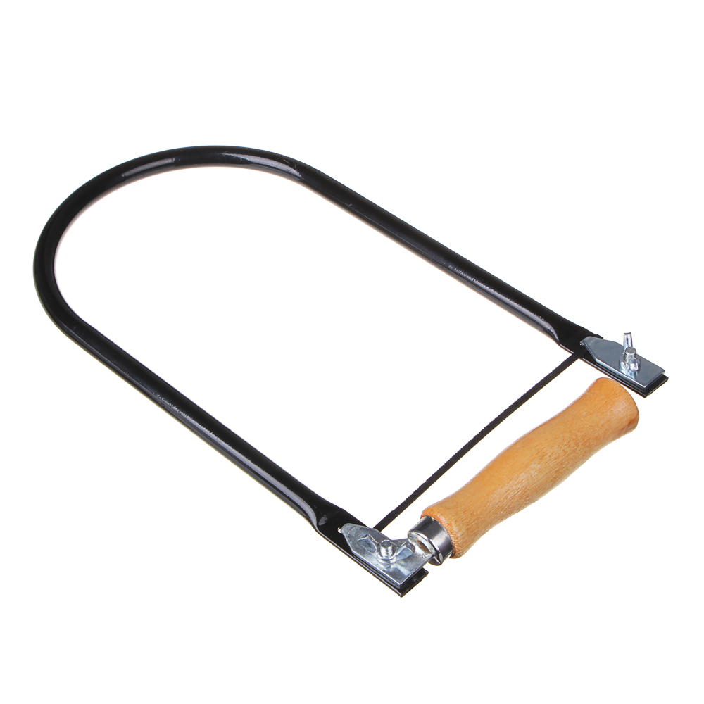 Ручной лобзик по дереву от бренда Рокот - это U-образная металлическая рамка, между концами которой натянуто пилящее лезвие. Лезвие крепится к зажимам. Зажимы можно вращать и создавать разные плоскости для пиления. С одной стороны рамки деревянная рукоятка. Лобзик используют, чтобы выпиливать из фанеры сложные контуры, в том числе криволинейные. Длина лезвия 130 мм.
