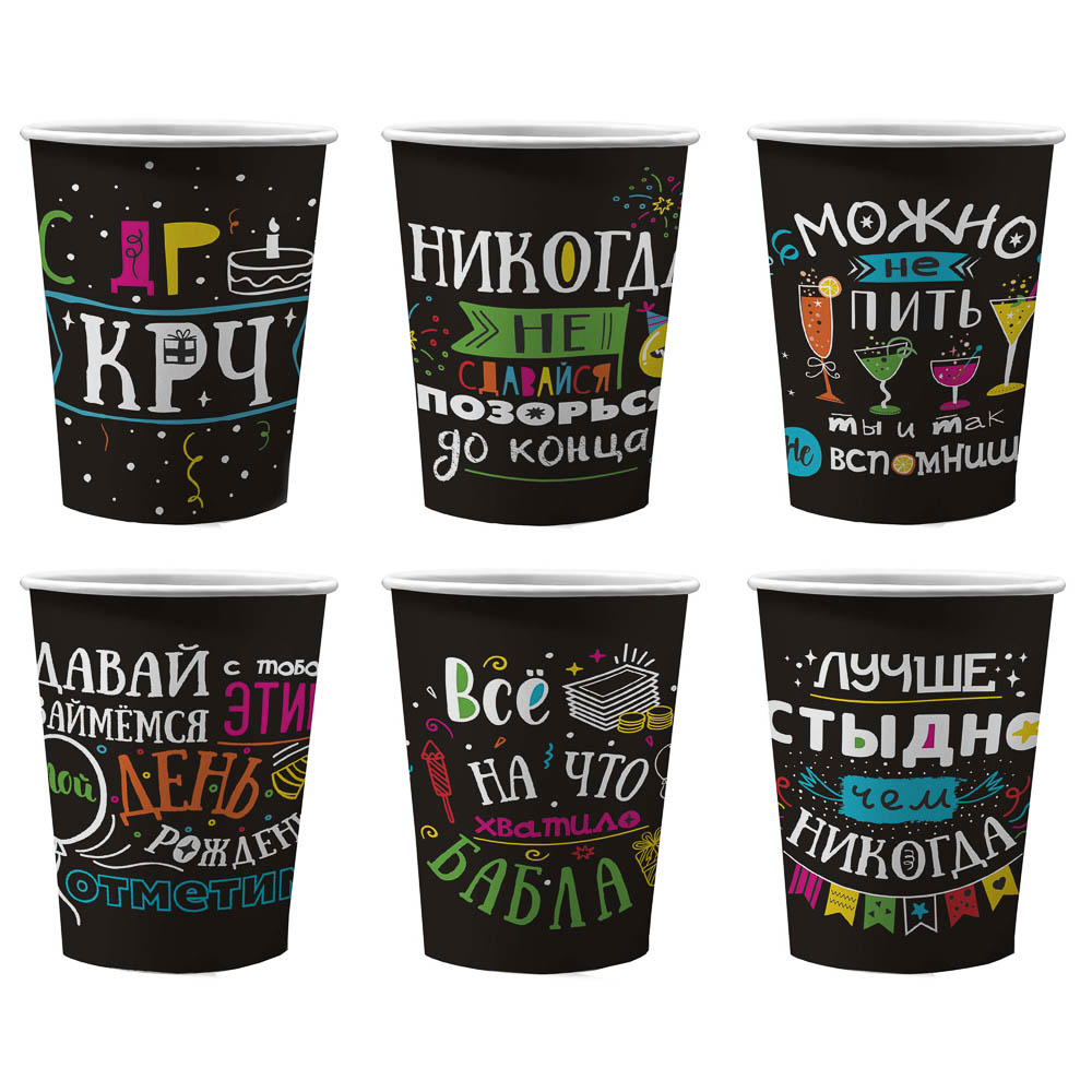 Смелый и забавный набор бумажных стаканов «Шутки на черном» поднимет настроение даже на самом скучном мероприятии! Контрастные надписи и оригинальный юмор делают эти стаканы идеальным выбором для неформальных вечеринок и корпоративов. Объем 250 мл подходит для любых напитков. Материал плотный и безопасный, не размокает. Яркий, современный и практичный аксессуар для тех, кто любит нестандартные решения и позитивную атмосферу.