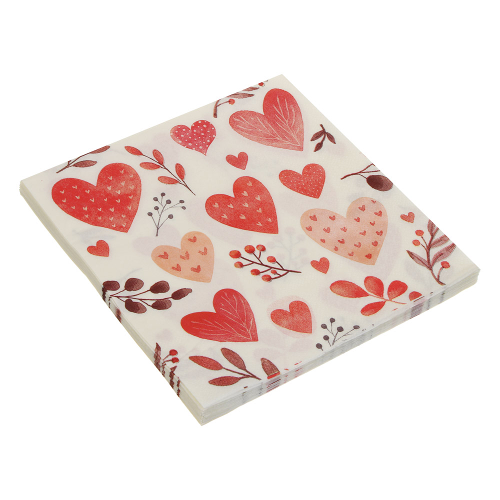 Набор бумажных салфеток размером 33×33 см (12 шт.) — это стильное и практичное решение для сервировки стола. Салфетки украшены нежным романтичным принтом: на светлом фоне расположены сердечки разных оттенков красного и розового, дополненные изящными веточками и ягодами. Такой дизайн создаёт атмосферу уюта и тепла, идеально подходит для праздничных посиделок, романтического ужина, дня рождения или тематического мероприятия. Салфетки выполнены из мягкой, но плотной бумаги, хорошо впитывают влагу и сохраняют форму при использовании. Они украсят сервировку, добавят яркий акцент и помогут создать гармоничный, продуманный декор стола.