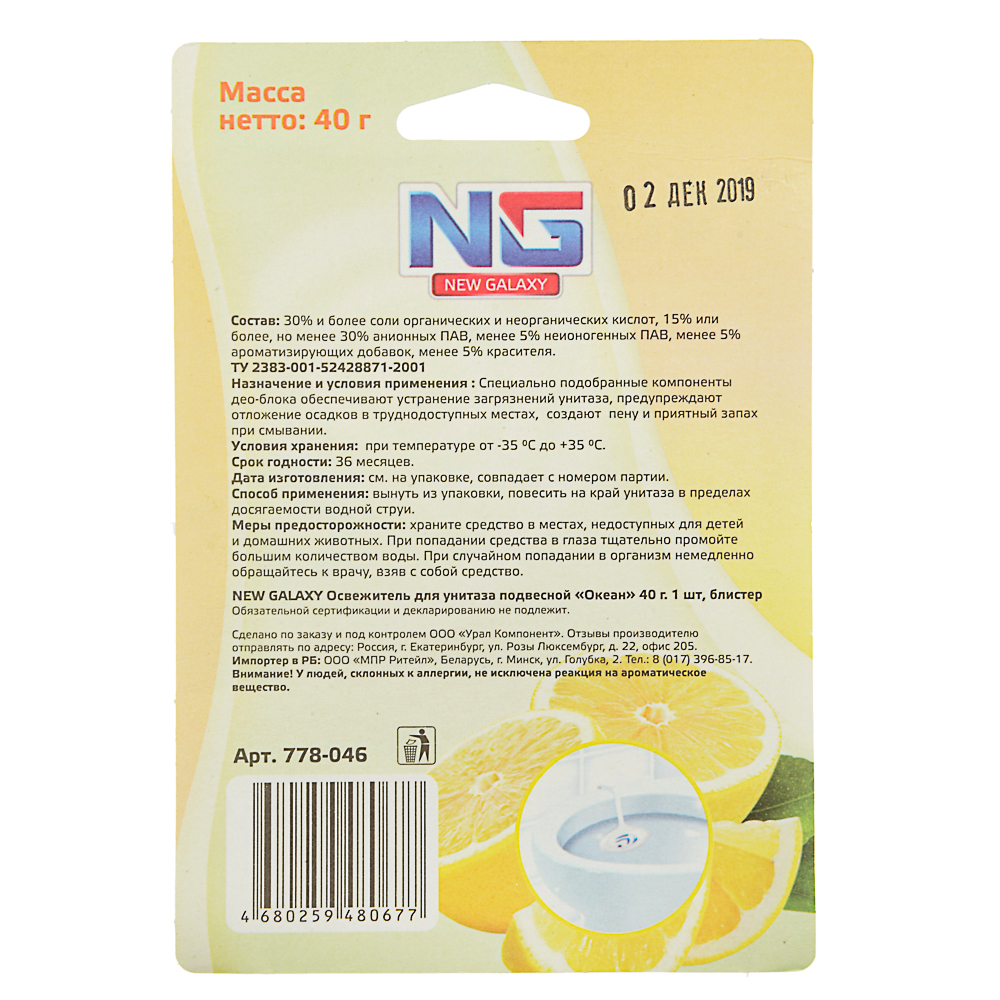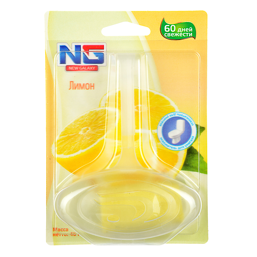 Подвесной освежитель для унитаза NEW GALAXY с ароматом лимона подарит 60 дней свежести и чистоты. Специально подобранные компоненты эффективно устраняют загрязнения унитаза, предупреждают отложение осадка в труднодоступных местах, создают обильную пену и приятный освежающий запах при смывании. Блок быстро и легко крепится на ободок унитаза и надежно держится.