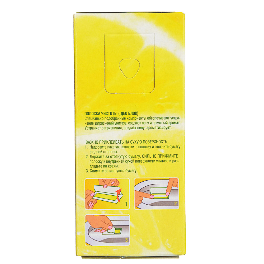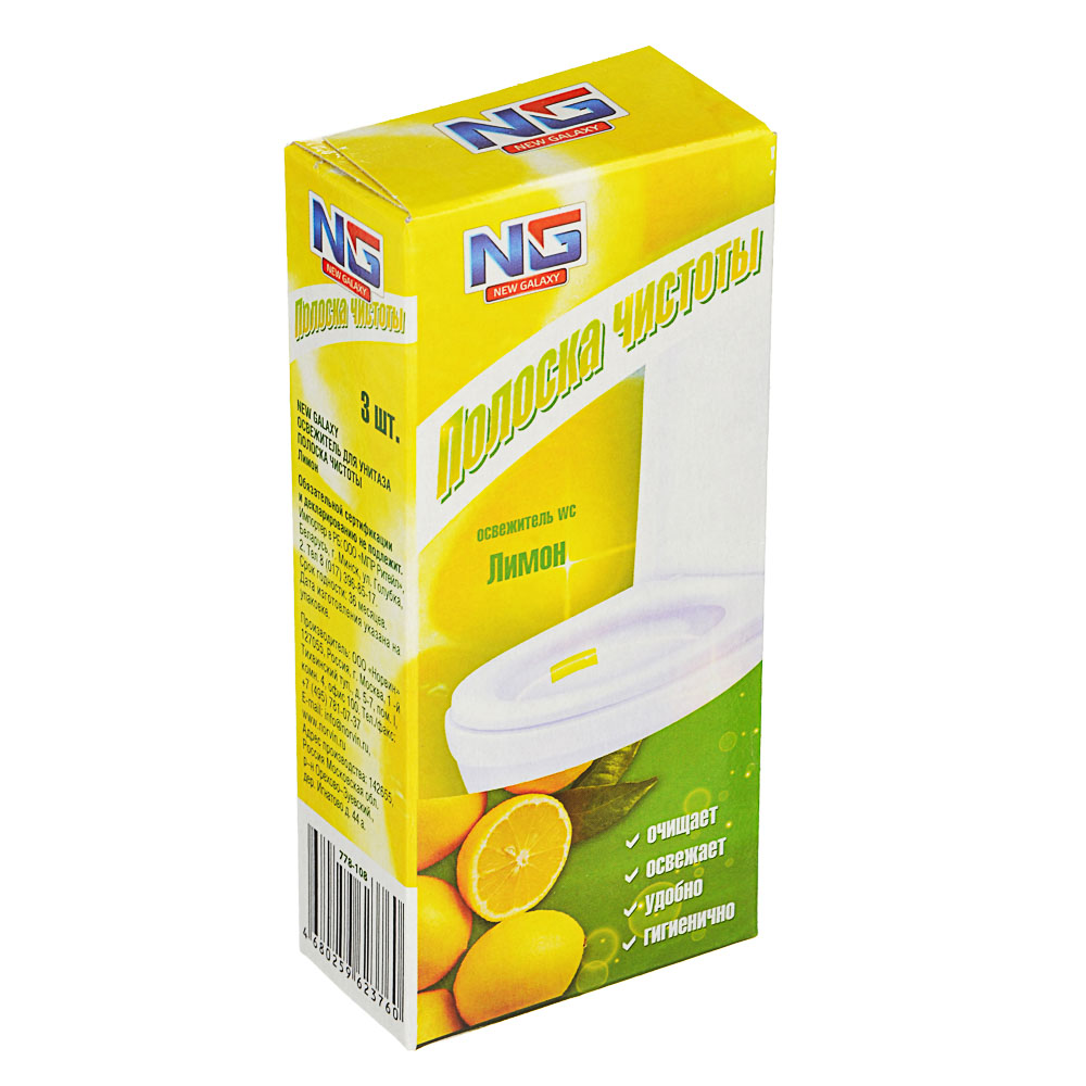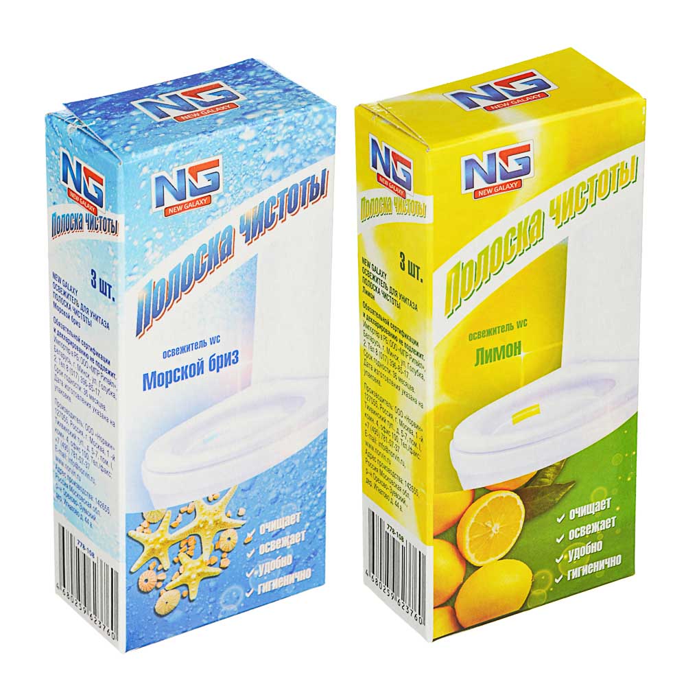 Устали каждый раз вставлять новый сменный блок в пластиковый корпус освежителя и вешать конструкцию на ободок? Освежитель для унитаза NEW GALAXY Полоска чистоты сэкономит ваше время, ведь она быстро и просто приклеивается к внутренней поверхности унитаза. Специально подобранные компоненты устраняют загрязнения, образуют пену и создают приятный аромат. Полоска чистоты – это удобно и гигиенично! Доступные ароматы: лимон, морской бриз.