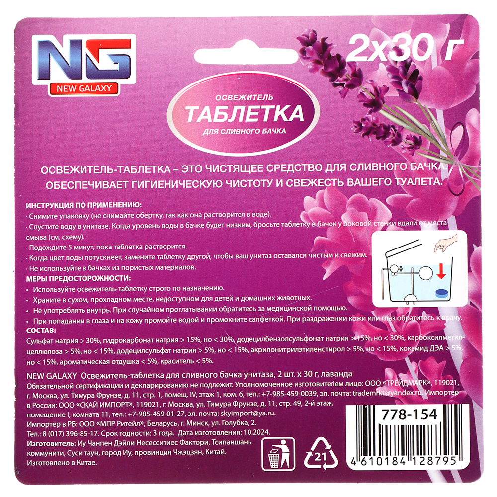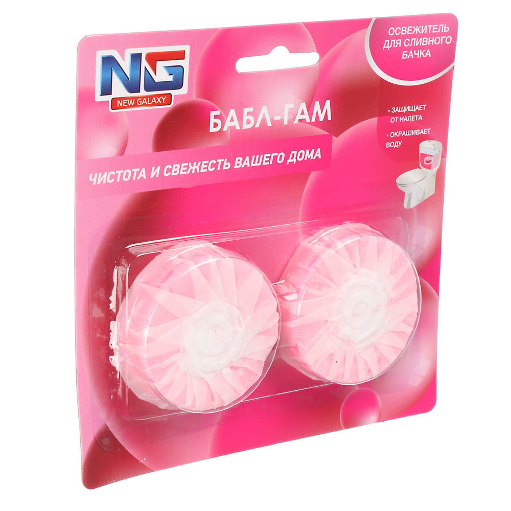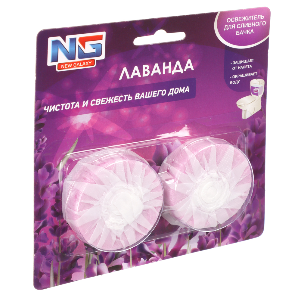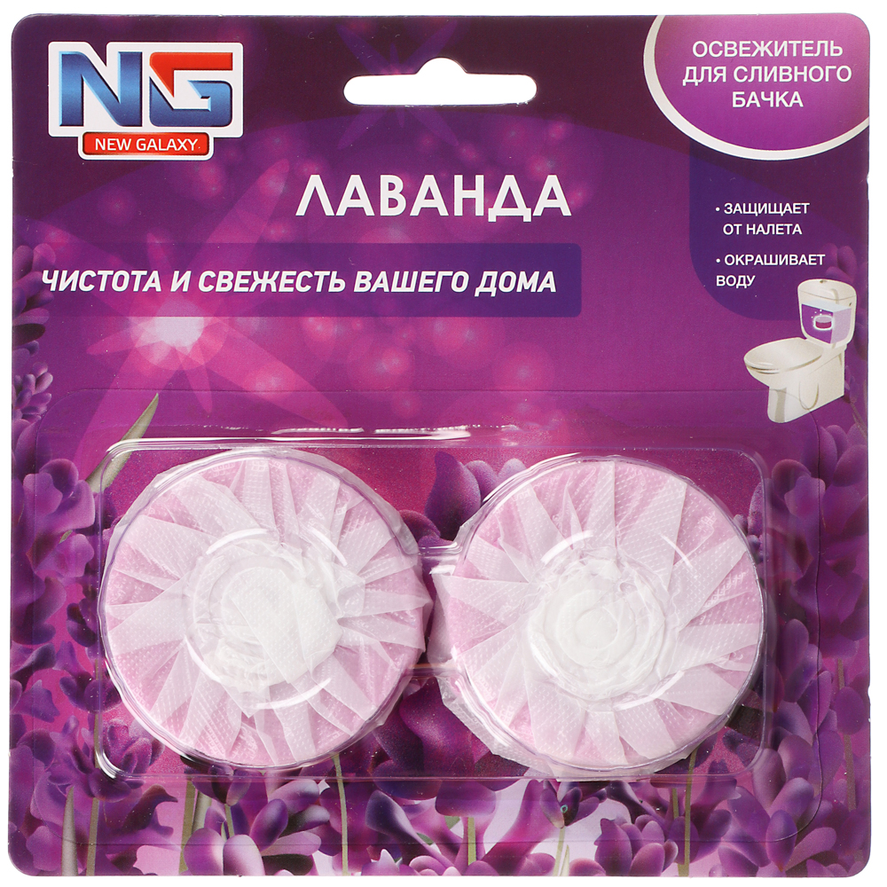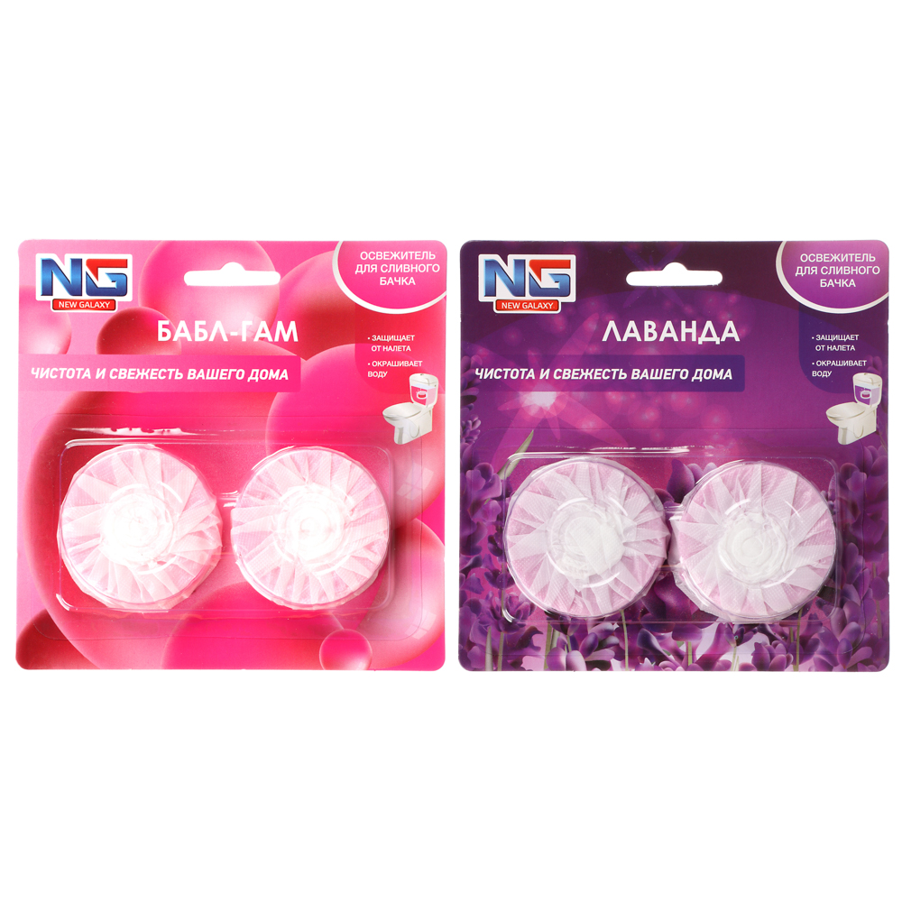 Освежитель для сливного бачка унитаза “NEW GALAXY”, в упаковке 2 таблетки по 30 грамм. Эффективно борется с неприятными запахами, придавая свежесть и чистоту вашему туалету. Просто поместите одну таблетку в бачок, и при каждом смывании она будет медленно растворяться, обеспечивая длительный эффект. Экологически безопасен, не содержит вредных веществ. В ассортименте 2 аромата: лаванда, бабл гам.