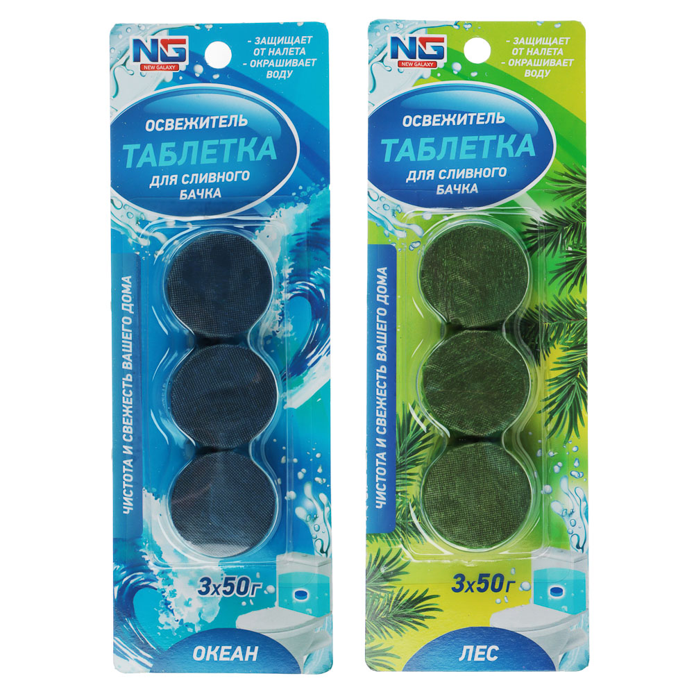 Таблетка освежитель для сливного бочка унитаза NEW GALAXY " Океан", "Лес" – это средство 3 в 1. Специальная формула освежает и наполняет воздух в санузле приятным ароматом, очищает внутреннюю поверхность унитаза и препятствует образованию новых отложений. В процессе смывания образуется обильная пена. Блок вешается на ободок унитаза в пределах досягаемости водной струи.
