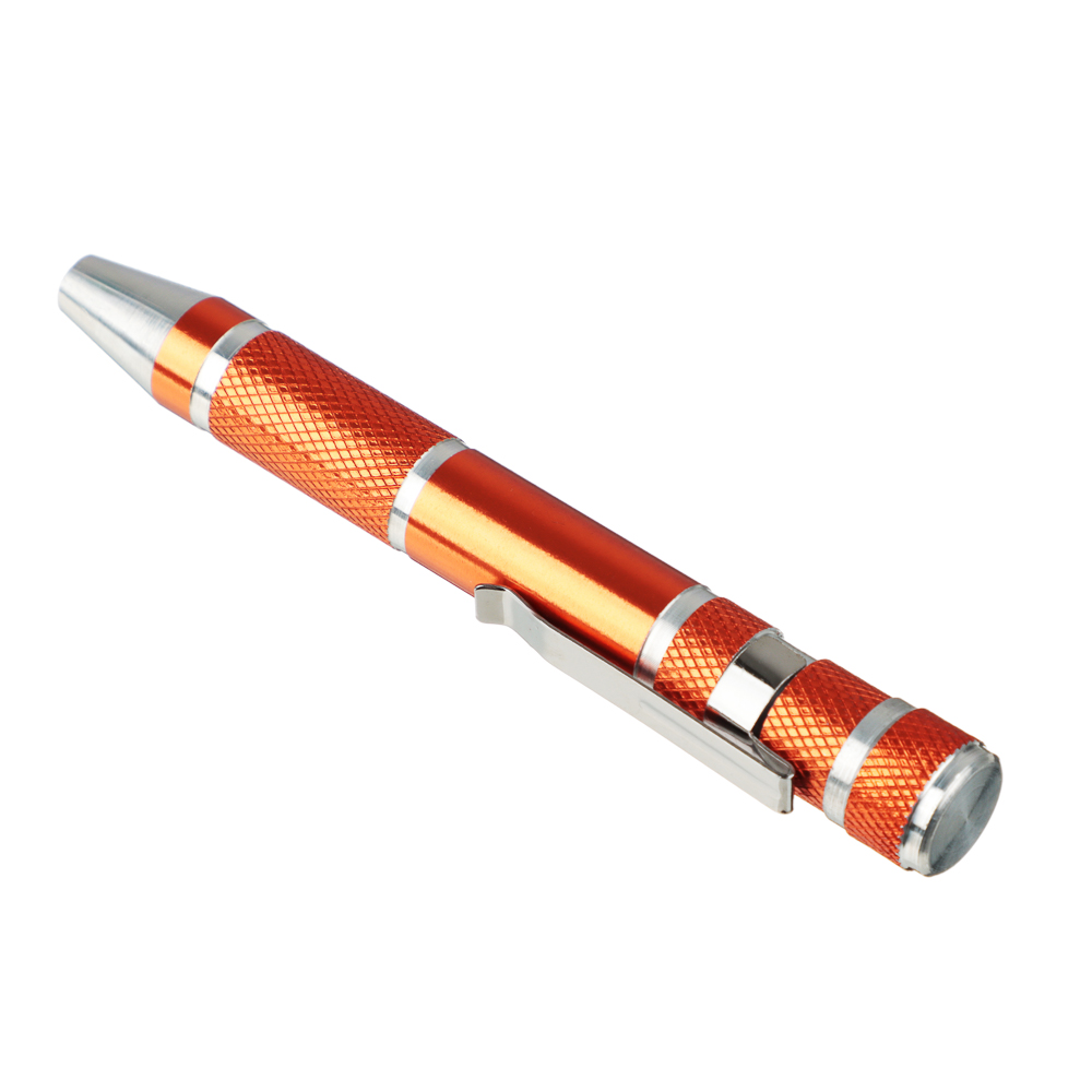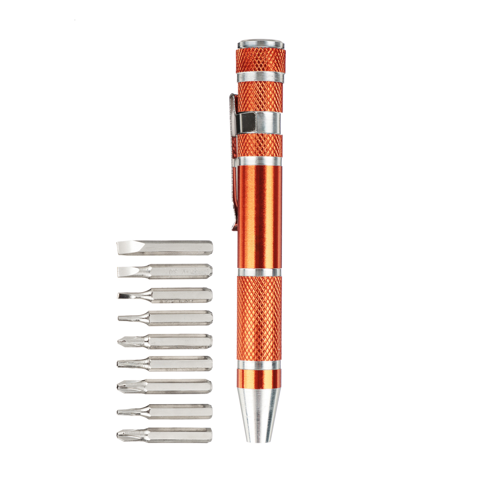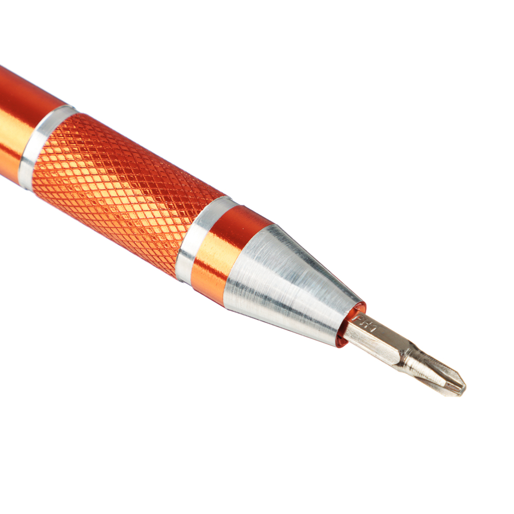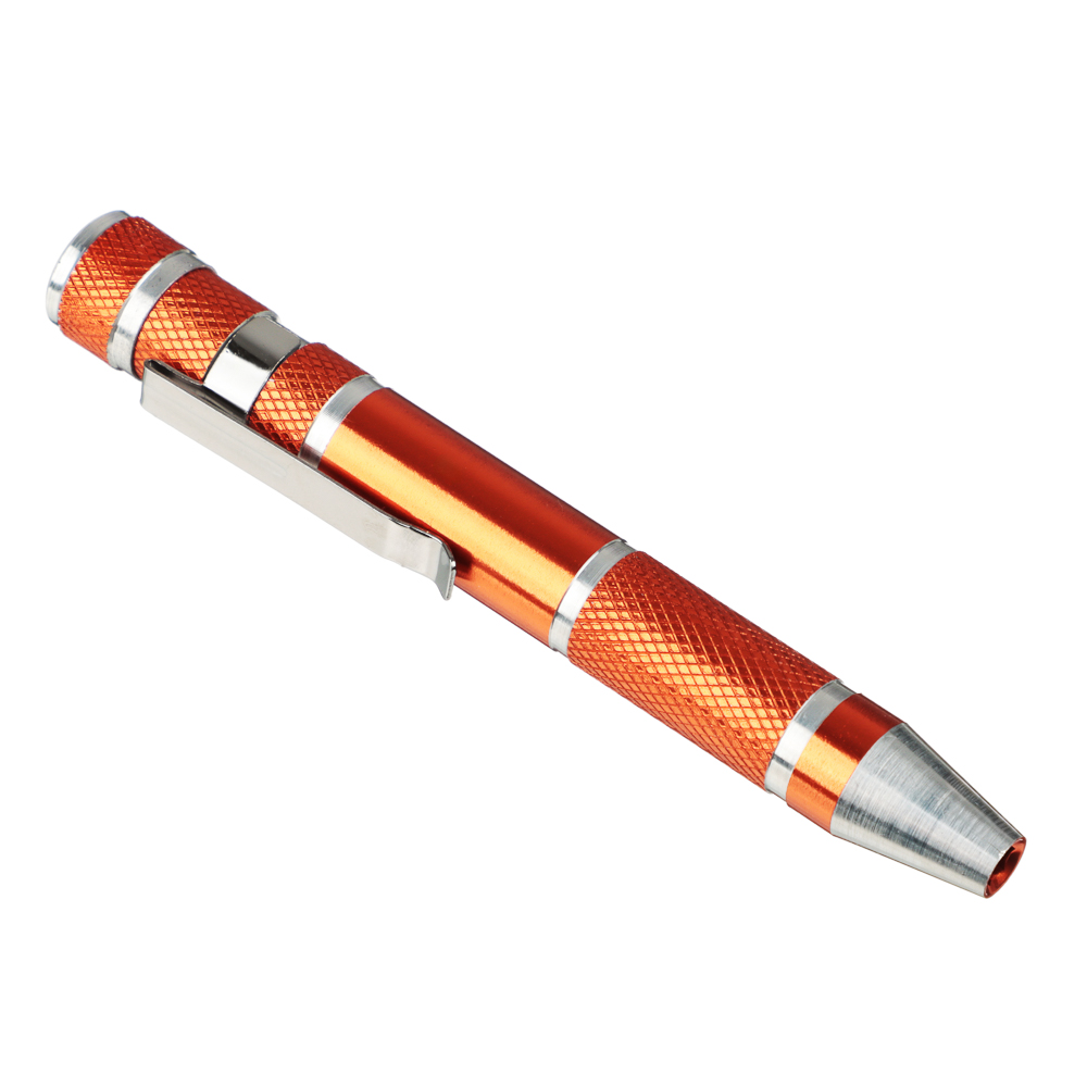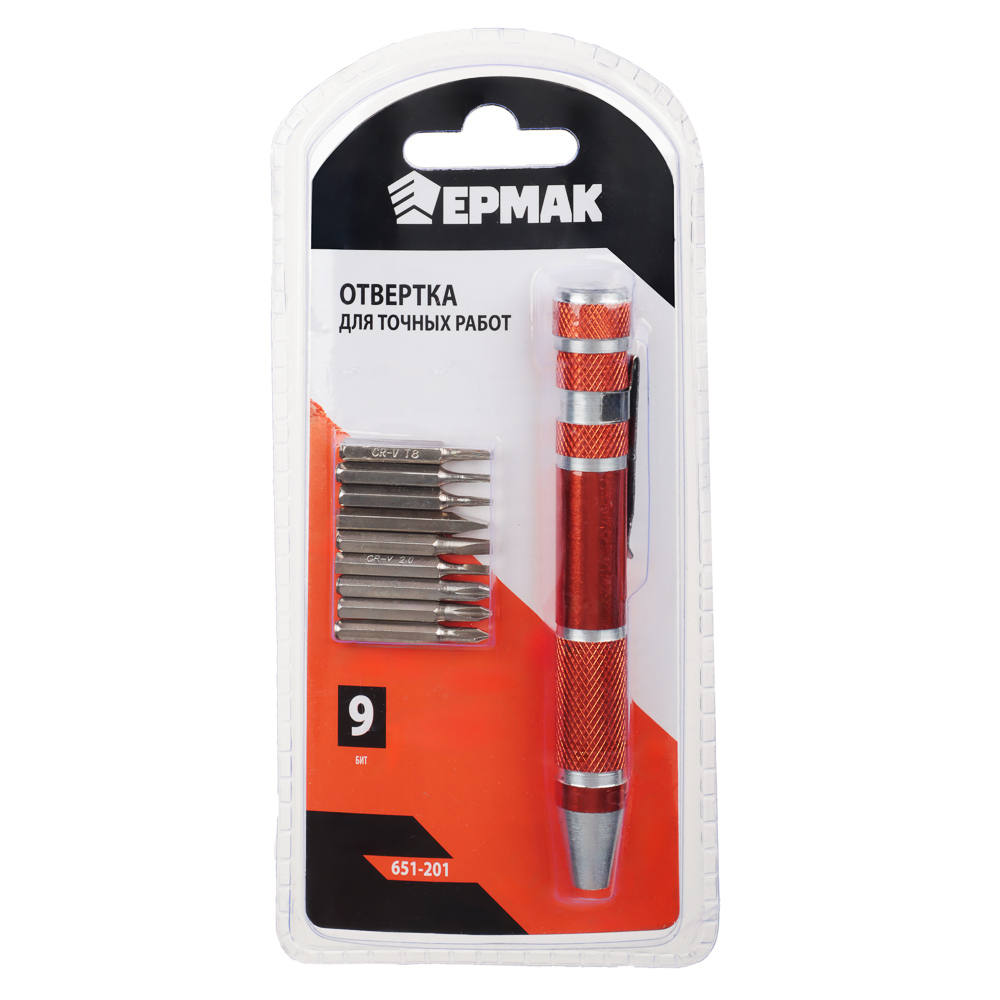 Отвертка для точных работ в форме ручки с битами ЕРМАК из углеродистой стали на вид напоминает обычную ручку для письма с удобной клипсой для крепления на одежде. Имеет компактный размер, поэтому ее удобно носить даже в кармане. Комплект также включает 9 бит популярных типов и размеров. Отлично справляется с резьбовыми соединениями, а биты имеют высокоточную подгонку, что помогает в процессе ремонта различных мелких точных механизмов. Материал отвертки и бит обладает высокой стойкостью к деформации.Состав набора: Прямой шлиц: SL2, SL3, SL4; Крестовой шлиц: PH0, PH1, PH2; Шлиц TORX: T6, T7, T8.