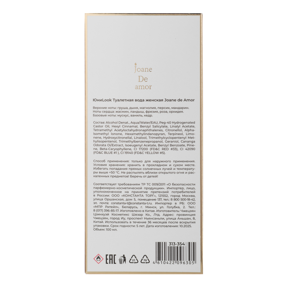 ЮниLook Туалетная вода женская Joane de Amor, 100 мл – это идеальный выбор для мечтательной, женственной и романтичной особы, которая верит в любовь и хочет подчеркнуть свою чувственность и нежность. Многослойная фруктово-цветочная композиция создана для свиданий, особых моментов и тех дней, когда хочется чувствовать себя неотразимой. Пирамида аромата:• Верхние ноты: Яркий жизнерадостный всплеск с нотами спелой груши, сладкой дыни, нежной магнолии, сочного персика и солнечного мандарина.• Ноты сердца: Роскошный и романтичный букет, в котором переплетаются жасмин, ландыш, воздушная фрезия, роза и изысканная орхидея.• Базовые ноты: Чувственный, тёплый и обволакивающий шлейф, сотканный из мускуса, ванили и ароматного меда.Лаконичный флакон станет украшением туалетного столика.