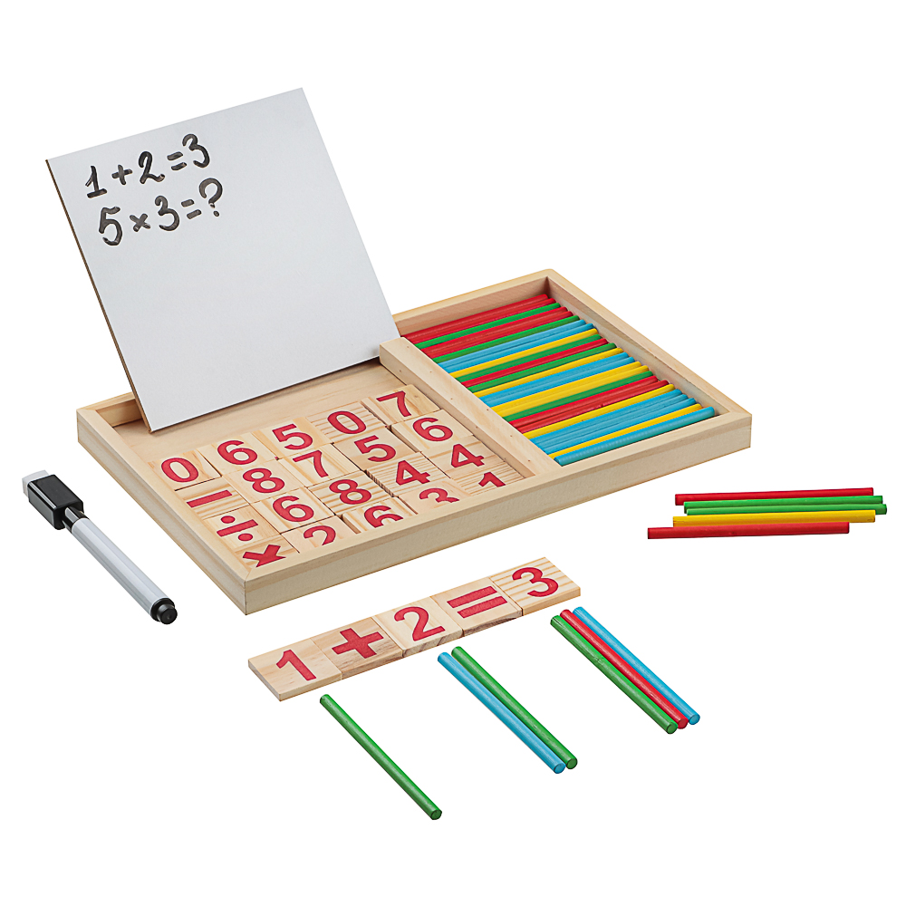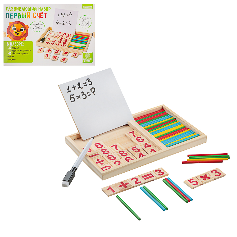 Набор обучающий "Первый счет" от ИГРОЛЕНД содержит в себе целый комплекс игрушек, которые будут формировать логическое мышление ребёнка. Доска поможет показать различные математические действия, например, сложение или вычитание: используйте плашки с цифрами и знаками, а затем пишите маркером результат. Также палочки можно использовать как счётный материал: попробуйте отсортировать их по цветам. Доска и водный маркер удобны в использовании, ведь написанное можно бесконечно стирать с помощью губки на колпачке. Деревянные квадратики с цифрами подойдут для составления примеров и в качестве счётного материала. Состав набора: цветные палочки, 25 плашек с цифрами и знаками, водный маркер со стирателем, доска.
