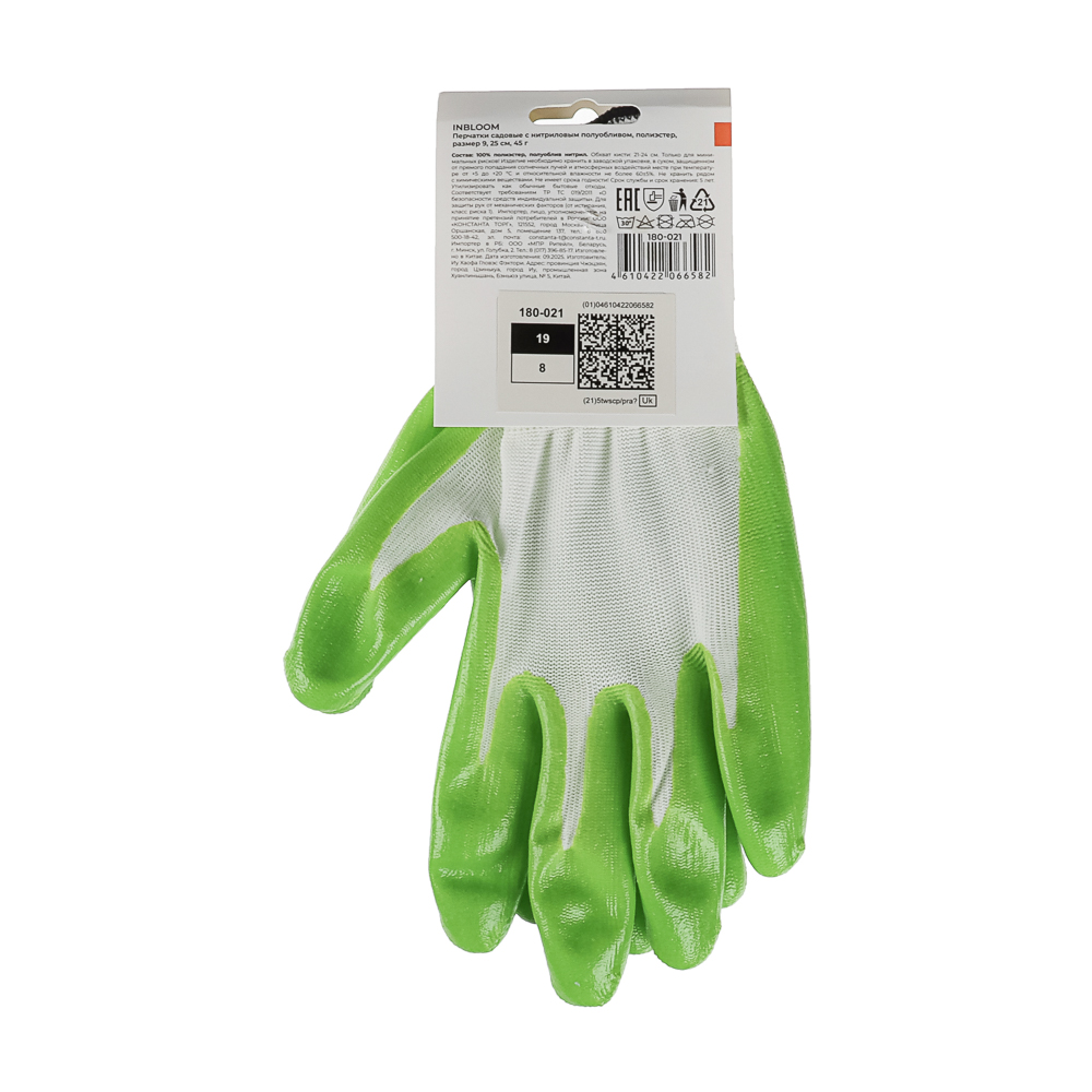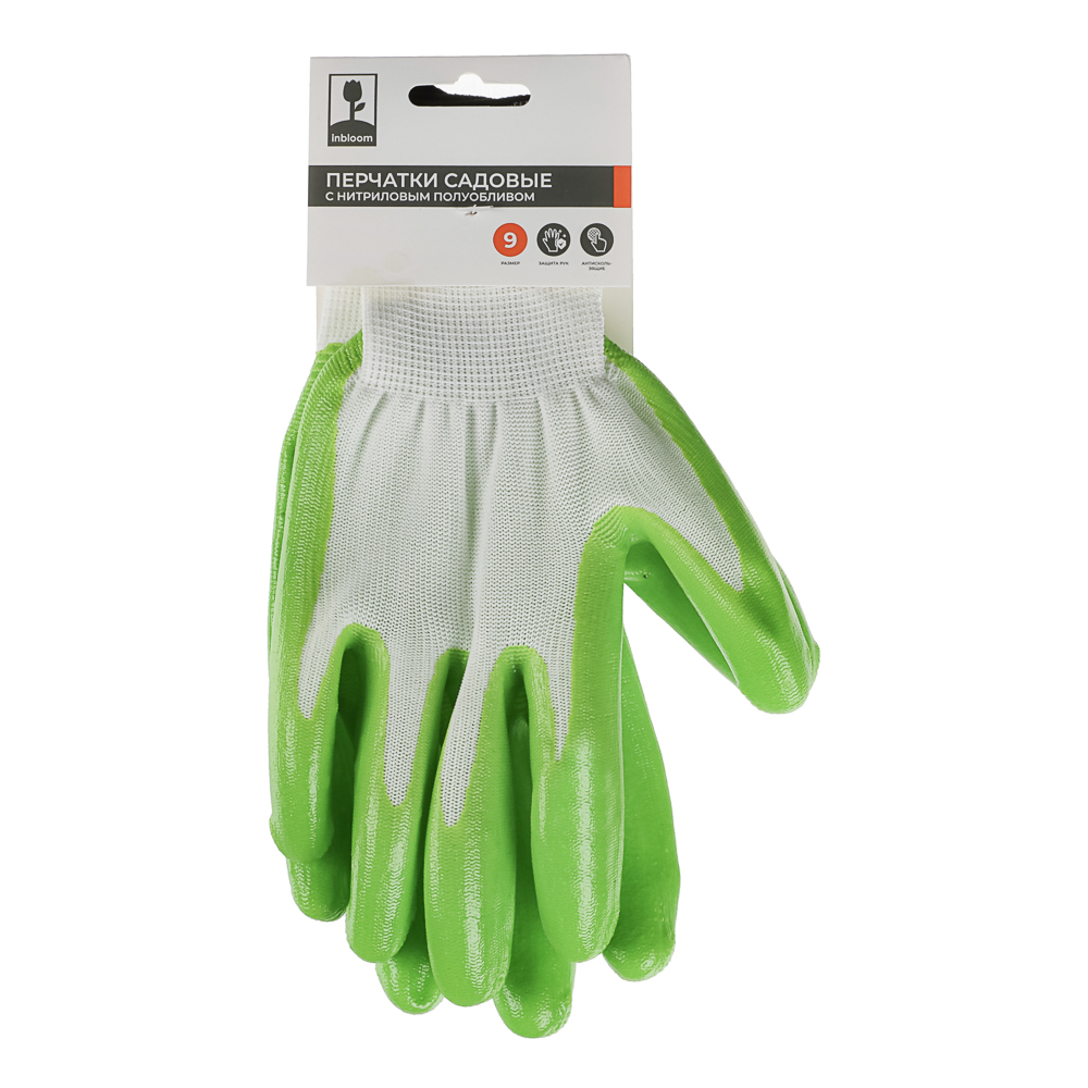 Во время дачных работ кожа рук подвергается негативным воздействиям внешних факторов. Защитить руки помогут садовые перчатки с нитриловым полуобливом INBLOOM. Полуоблив дает антискользящий эффект и защиту от влаги и механических воздействий. Основа из полиэстера позволяет коже дышать. Перчатки плотно облегают ладонь, комфортны в носке, не затрудняют работу. Размер – 9.