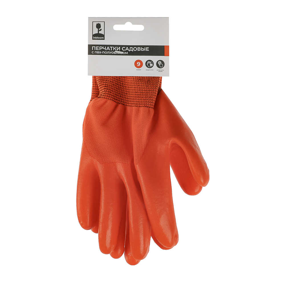 Перчатки садовые INBLOOM с ПВХ-полуобливом – надежная защита рук при работе в саду. Выполнены из прочного полиэстера, обеспечивают комфорт и долговечность. Полуоблив из ПВХ улучшает сцепление с инструментами и предотвращает скольжение. Размер 9, длина 25 см, вес 75 г. Яркий оранжевый цвет делает их заметными, а дышащий материал позволяет коже оставаться сухой. Идеальны для садовых и хозяйственных работ.
