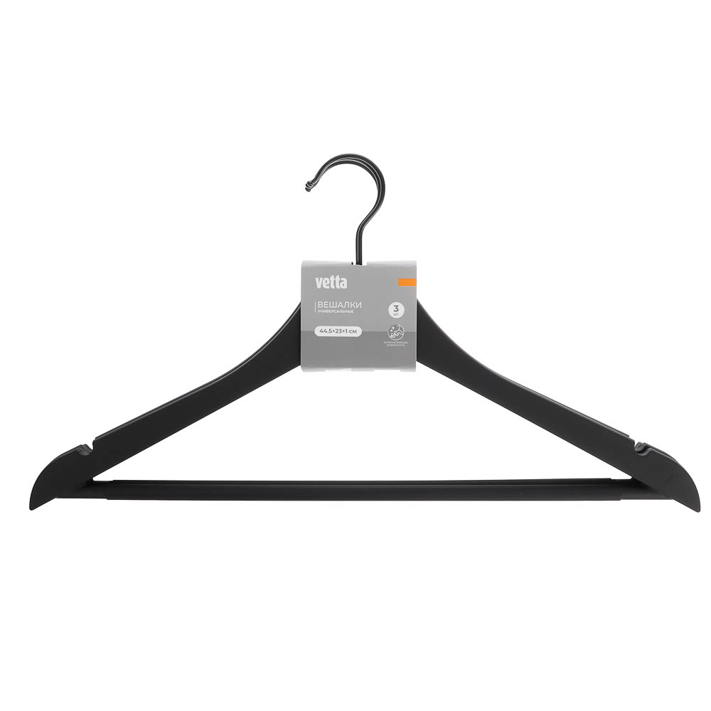 Набор вешалок для одежды VETTA — это стильный и функциональный аксессуар для вашего гардероба. Вешалки изготовлены из прочного пластика ABS с покрытием софт-тач, которое предотвращает соскальзывание одежды. Благодаря своей конструкции они выдерживают даже тяжёлую верхнюю одежду. Стильный чёрный цвет и лаконичный дизайн впишутся в любой интерьер. В наборе три вешалки размером 44,5x23x1 см, что позволяет использовать их для разных типов одежды. Они идеально подойдут для рубашек, блузок, платьев и других предметов гардероба. Набор вешалок для одежды VETTA поможет организовать хранение одежды и сохранить её в идеальном состоянии.