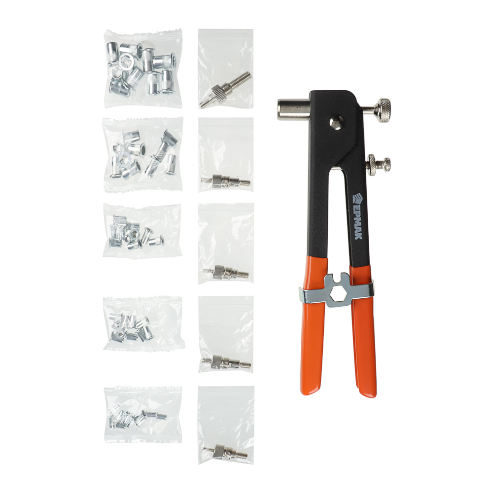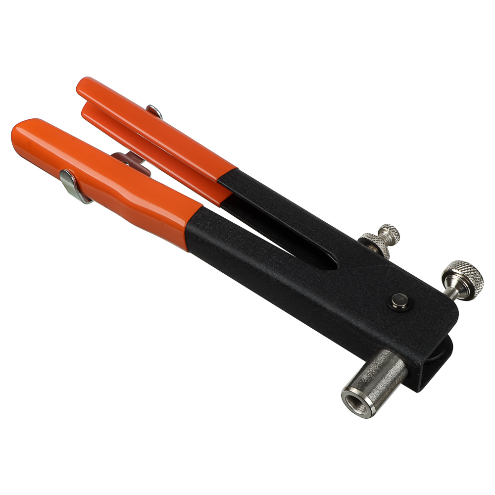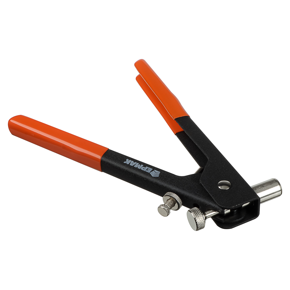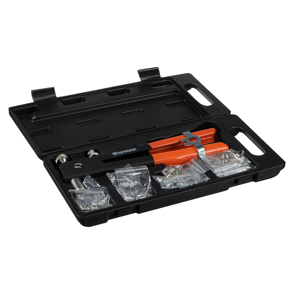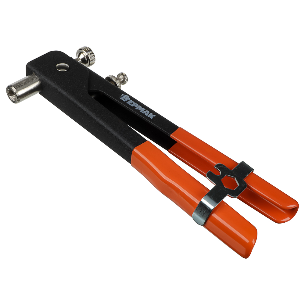 Заклепочник для резьбовых заклепок ЕРМАК двуручный служит для быстрого и удобного скрепления между собой различных материалов при помощи заклепок с резьбой. • Заклепочник изготовлен из качественных материалов, поэтому отличается высокой прочностью и устойчивостью к износу.• Рукоятки не скользят в ладонях.• Инструмент подходит для стальных и алюминиевых заклепок.