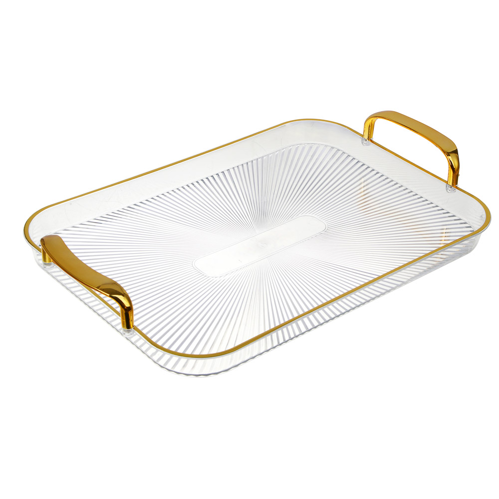 Поднос прямоугольный с ручками с золотой каемкой 42,5x27x3 см – это элегантный круглый поднос с удобными позолоченными ручками и декоративной золотой окантовкой, который станет изысканным украшением праздничной сервировки. Может использоваться для разноса блюд и уборки грязной посуды, а также его можно использовать для сервировки напитков, фруктов, закусок или десертов. Прозрачный пластик ПЭТ легкий и в то же время прочный и практичный. Легко моется. Подходит для домашнего застолья, для кафе и оформления фуршетов. Отличный выбор для тех, кто ценит эстетику и функциональность.