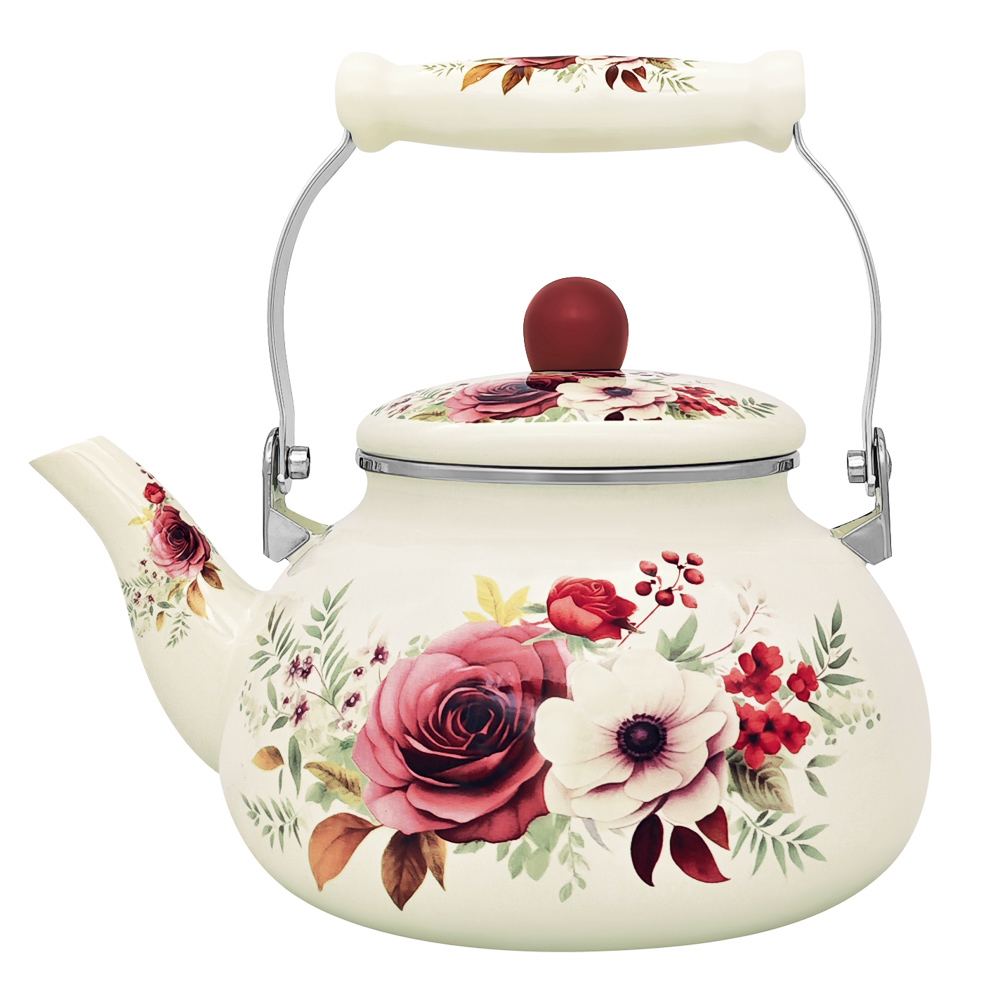 Чайник эмалированный VETTA «Лаура», объем 2,5 л сочетает в себе традиционный дизайн и современное исполнение с магнитным дном для использования на любых типах плит, включая индукционные. Чайник с самобытным цветочным принтом украсит каждое чаепитие, станет одним из неотъемлемых элементов для создания атмосферы уюта и гостеприимства и будет сопровождать уютные вечера в кругу семьи и друзей за душевными посиделками с горячим чаем и угощениями. Ручка с ненагревающейся накладкой комфортно ложится в руку и не скользит. Правильная форма носика исключает попадание капель воды мимо чашки.