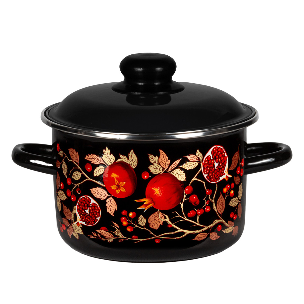 Эмалированная кастрюля Гранат, объем 2 л, с крышкой – это посуда для приготовления первых блюд и компотов, изготовленная из качественной нержавеющей стали с надежным экологичным эмалированным покрытием. Имеет стильный дизайн в черном цвете с красочным изображением граната, будет актуально смотреться в любом интерьерном стиле. Кастрюля обеспечивает равномерное приготовление блюд, устойчива к деформации при длительном нагреве. Эмаль не искажает вкус продуктов, поэтому посуда подходит для хранения готовой еды. Подходит для всех типов плит, включая индукционные.