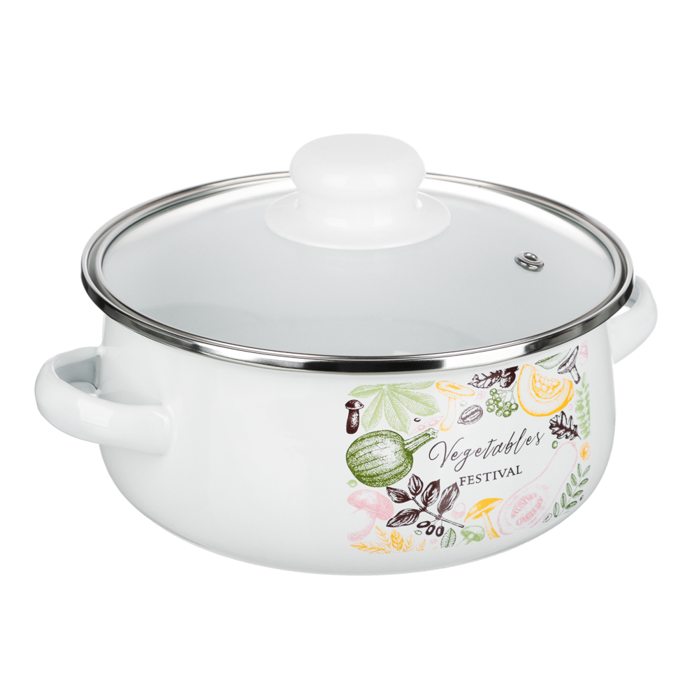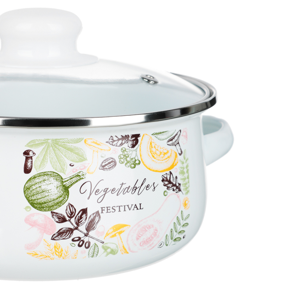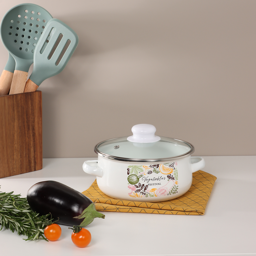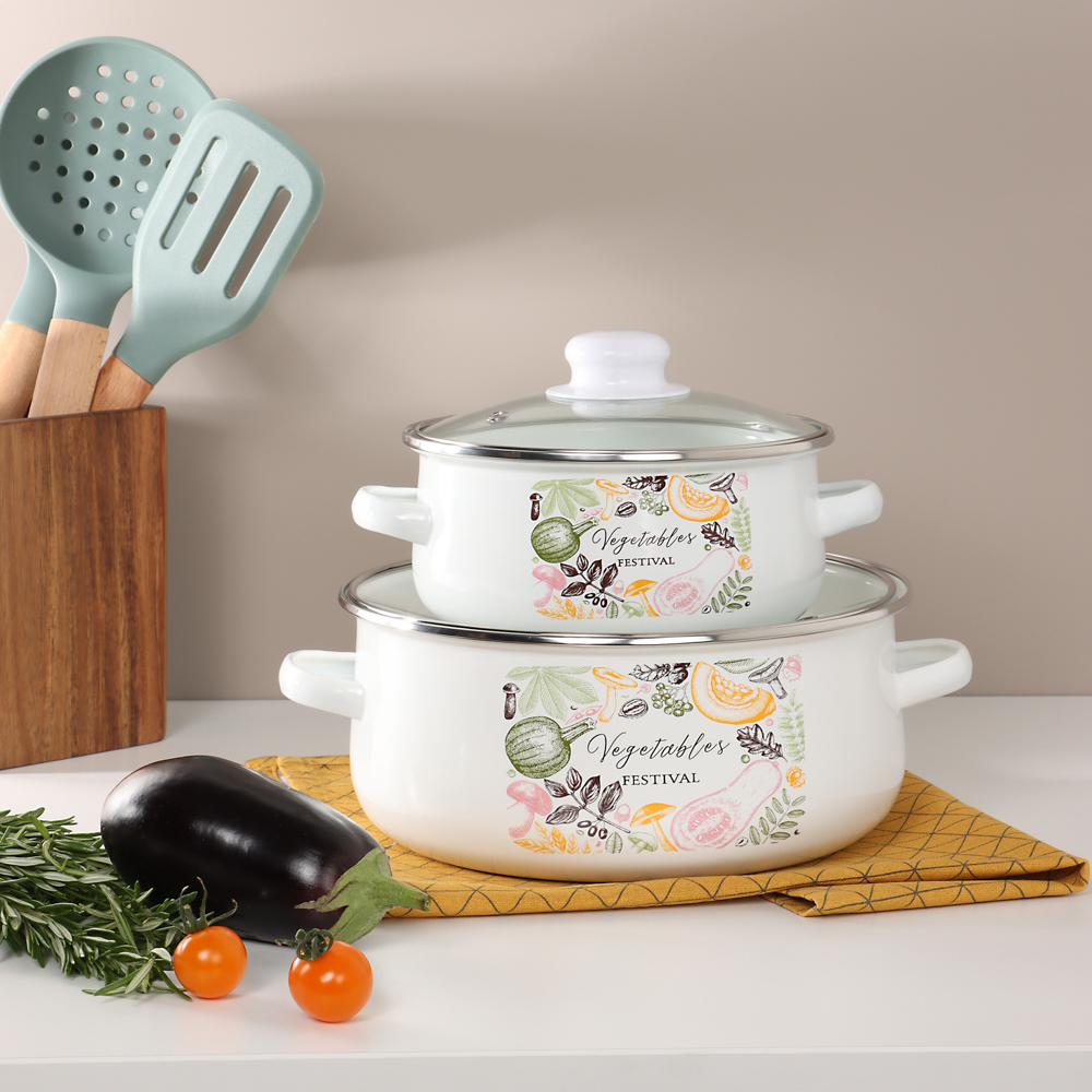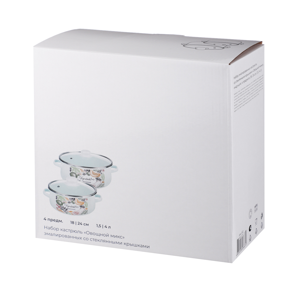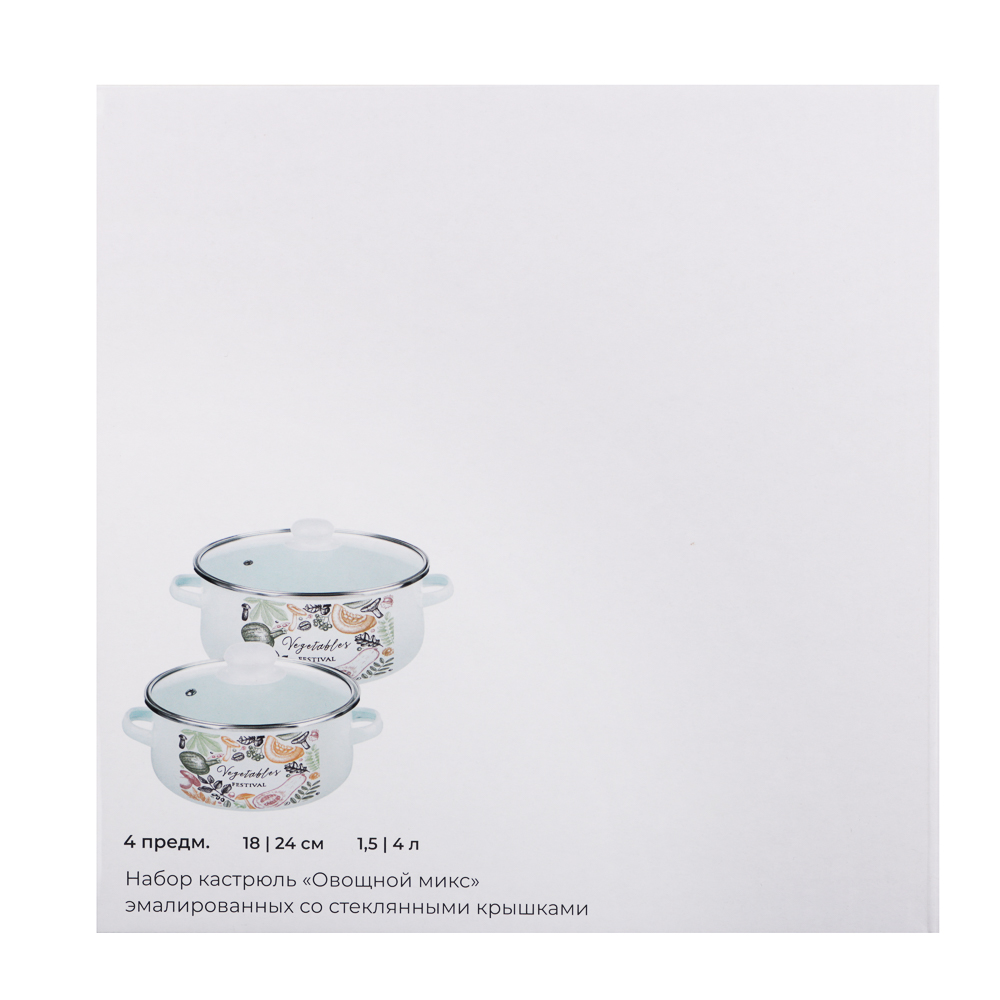 Набор эмалированных кастрюль со стеклянными крышками «Овощной микс» содержит 4 предмета: 2 кастрюли объемом 1,5 л и 4 л и 2 крышки диаметром 18 см и 24 см. Посуда имеет привлекательный современный дизайн в белом цвете с ненавязчивым тематическим принтом. Стеклянные прозрачные крышки оснащены отверстиями для выпуска пара и имеют ненагревающиеся ручки. Кастрюли подходят для приготовления первых блюд, гарниров, варки полуфабрикатов, овощей и яиц. Эмаль не вступает в контакт с продуктами, а также способствует правильному хранению готовых блюд. Набор подходит для всех типов плит, включая индукцию.