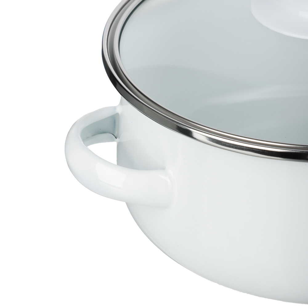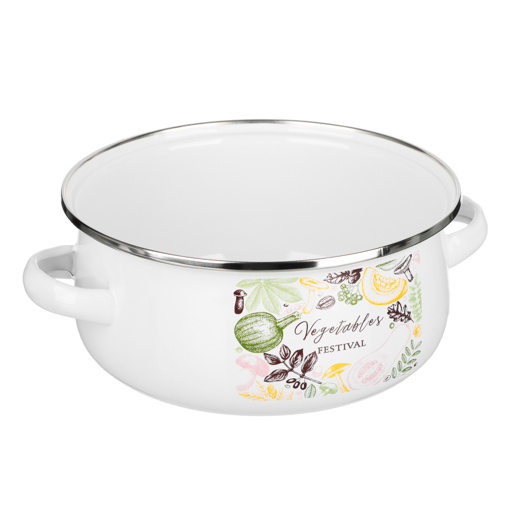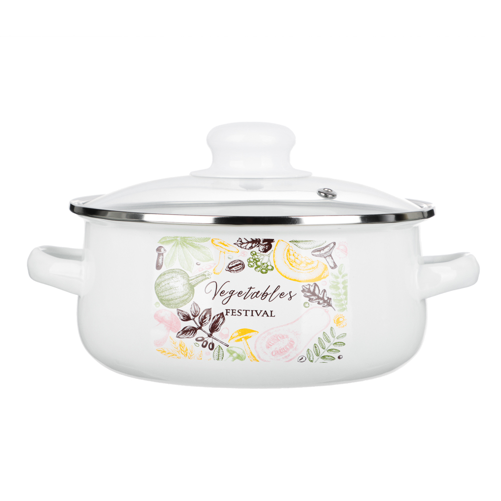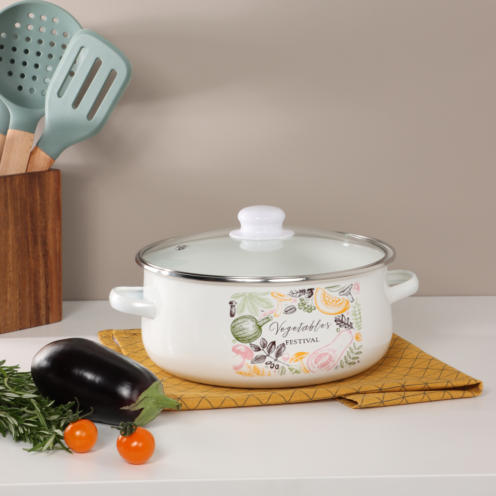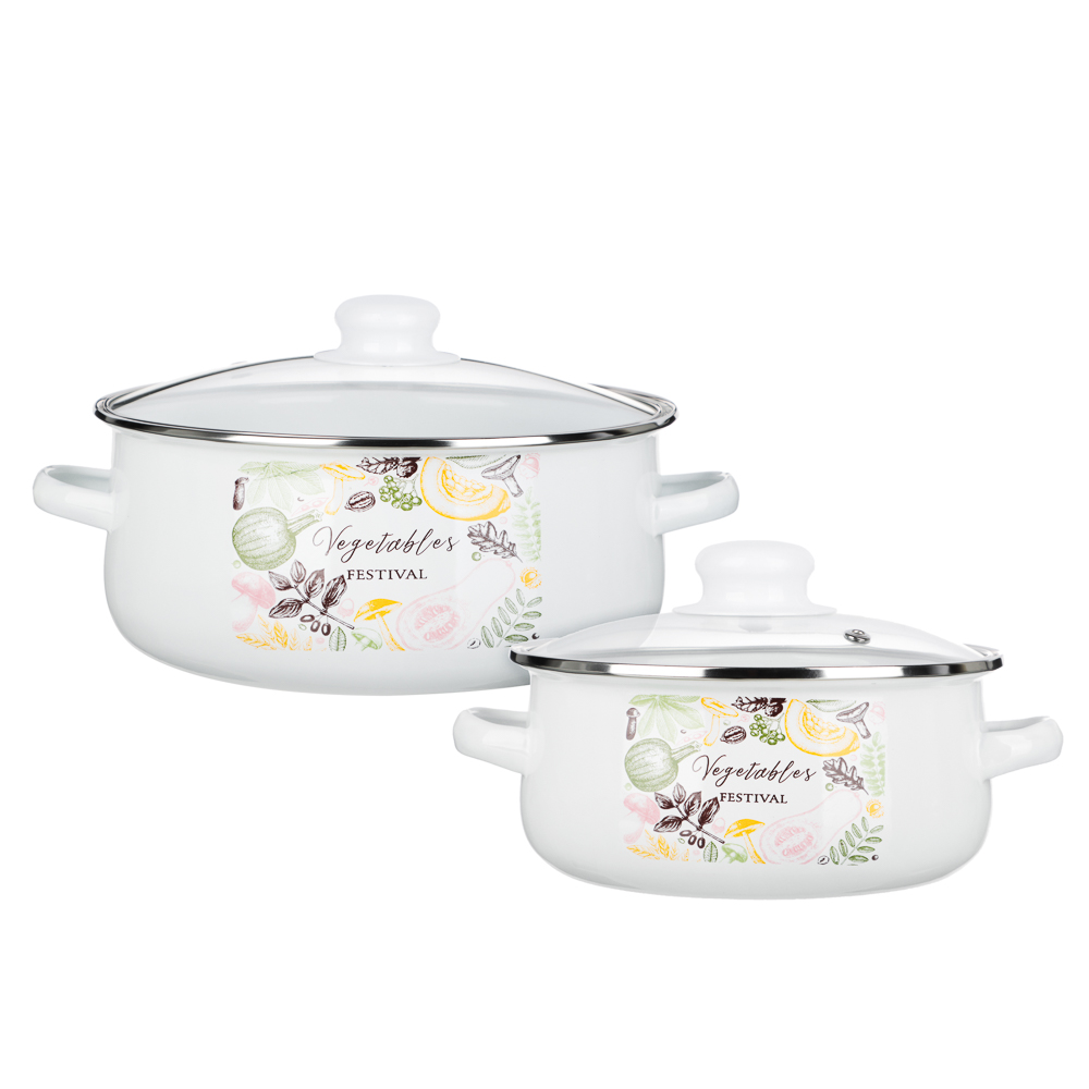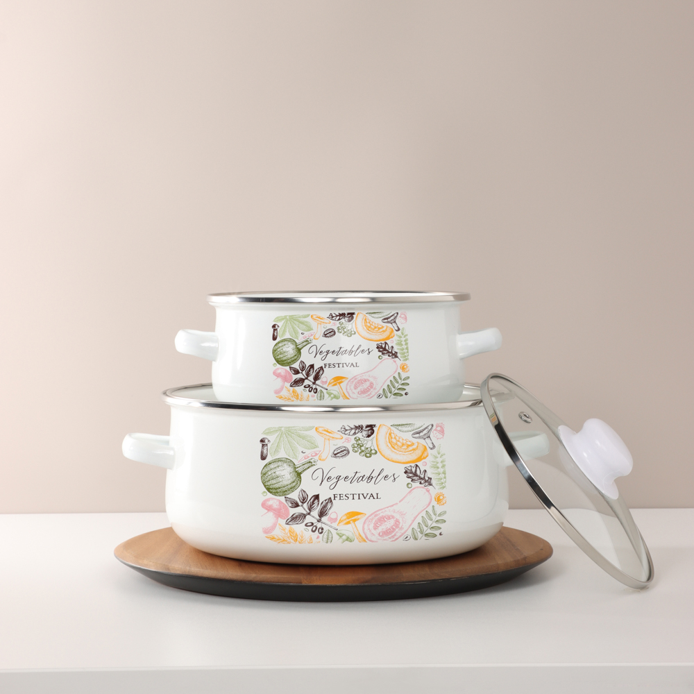Набор эмалированных кастрюль со стеклянными крышками «Овощной микс» содержит 4 предмета: 2 кастрюли объемом 1,5 л и 4 л и 2 крышки диаметром 18 см и 24 см. Посуда имеет привлекательный современный дизайн в белом цвете с ненавязчивым тематическим принтом. Стеклянные прозрачные крышки оснащены отверстиями для выпуска пара и имеют ненагревающиеся ручки. Кастрюли подходят для приготовления первых блюд, гарниров, варки полуфабрикатов, овощей и яиц. Эмаль не вступает в контакт с продуктами, а также способствует правильному хранению готовых блюд. Набор подходит для всех типов плит, включая индукцию.