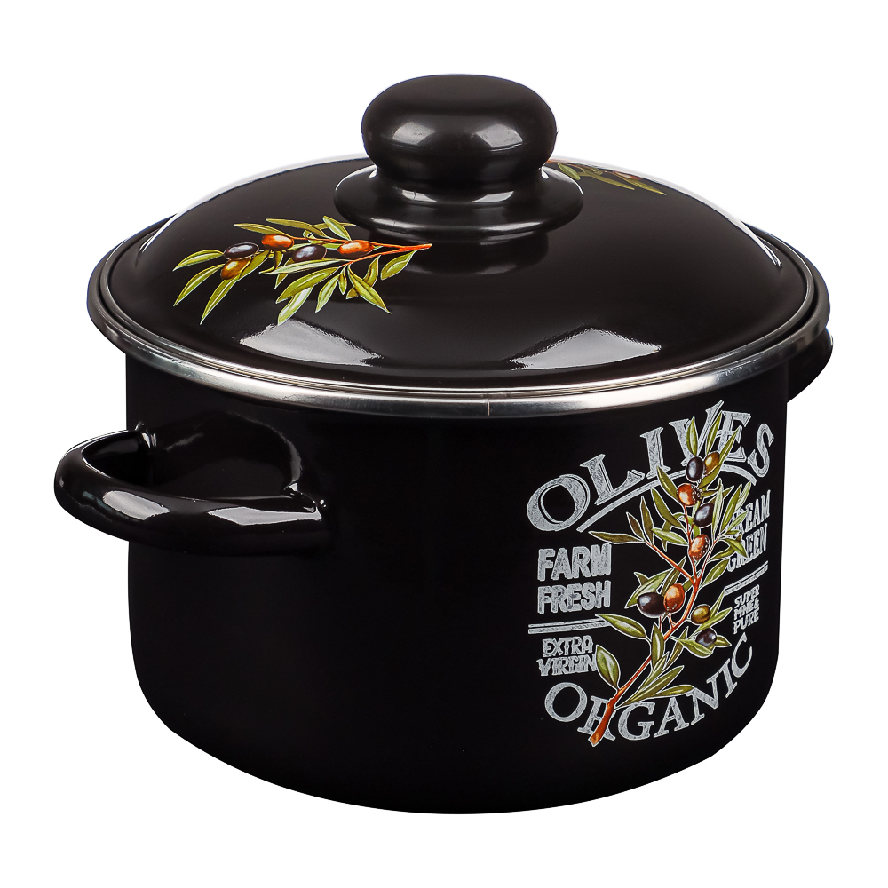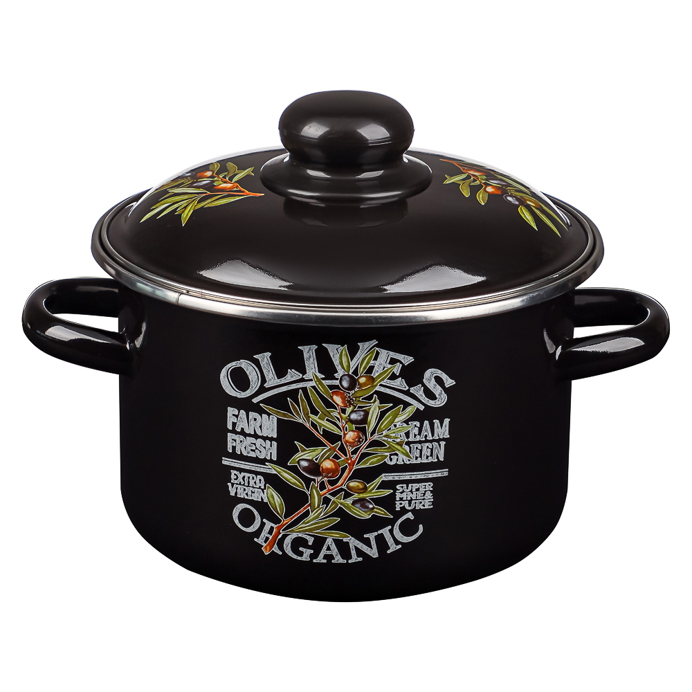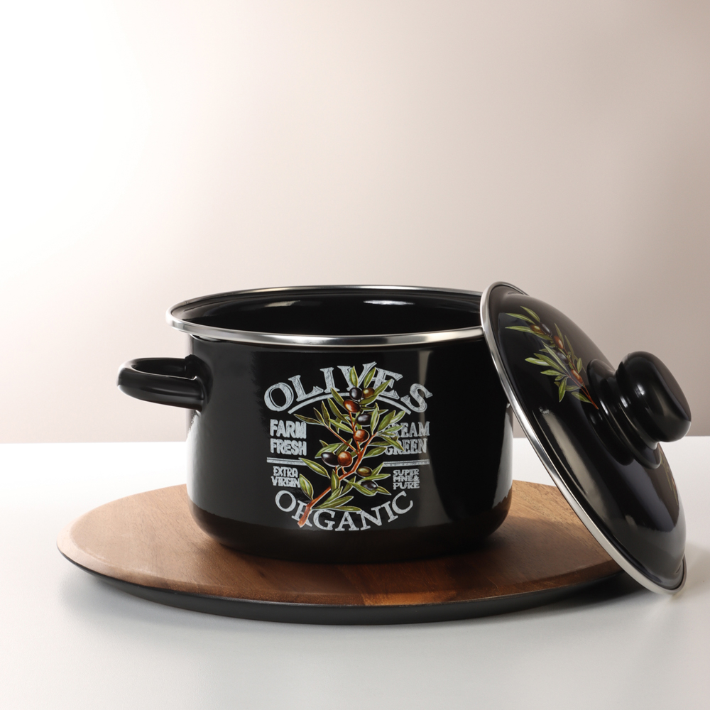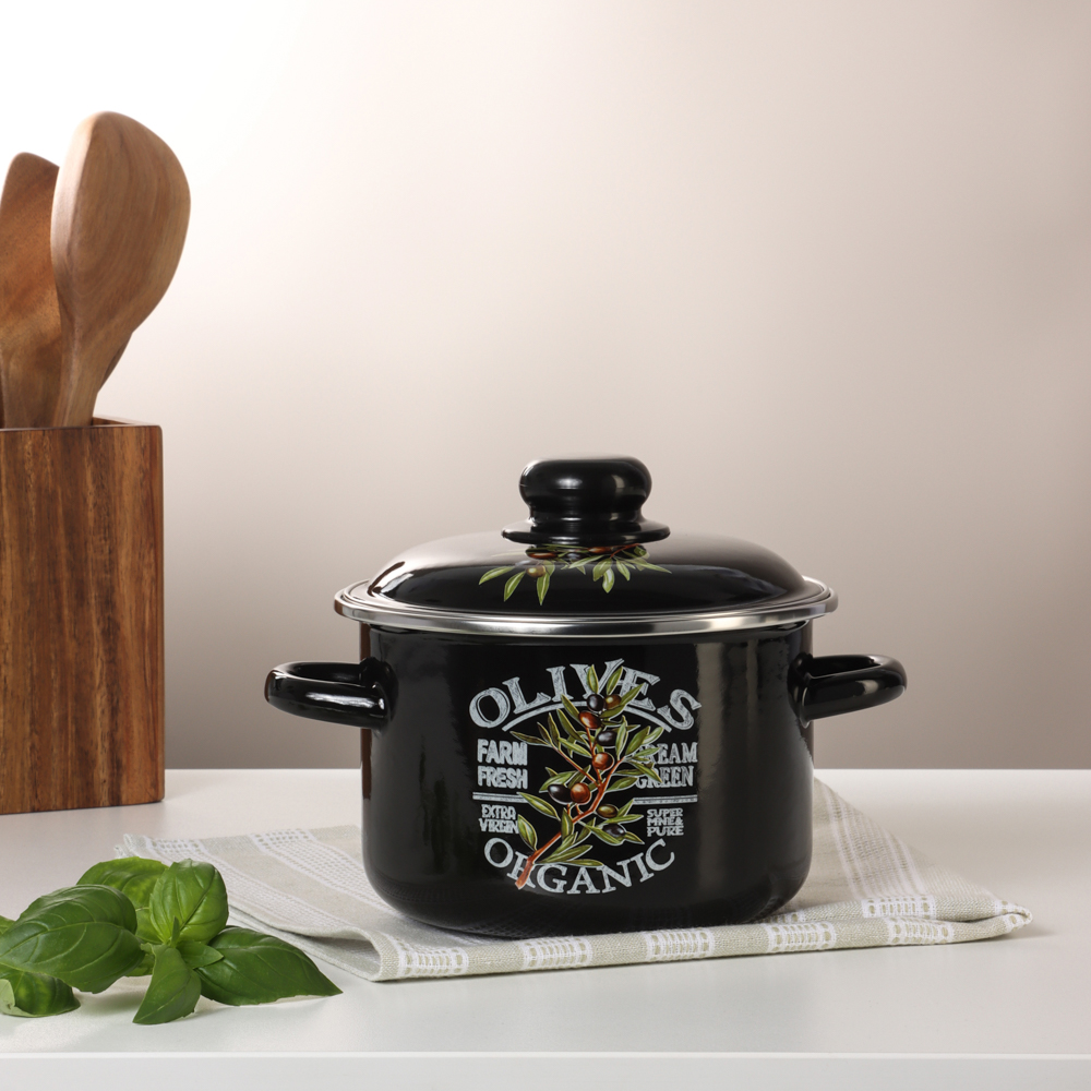 Кастрюля эмалированная Ветка оливы объемом 2 л в стильном черном цвете украшена изящным изображением ветки оливы, что придаёт ей особый шарм и выразительность. Прочная конструкция с толщиной стенок 3 мм и дна не менее 1,1 мм обеспечивает равномерный нагрев, делая её идеальной для приготовления разнообразных блюд. Универсальная кастрюля подходит для всех типов плит, включая индукционные, а удобная крышка помогает сохранить тепло и аромат блюд. Элегантный дизайн с оливковым узором и практичность делают её незаменимой на любой кухне, а её надежность — отличным вложением в ваш кулинарный арсенал.