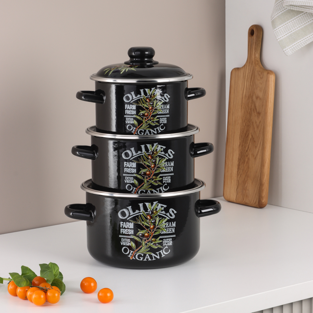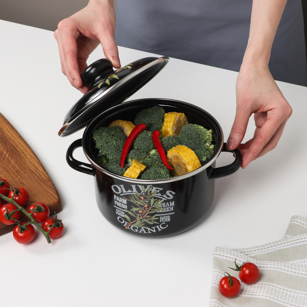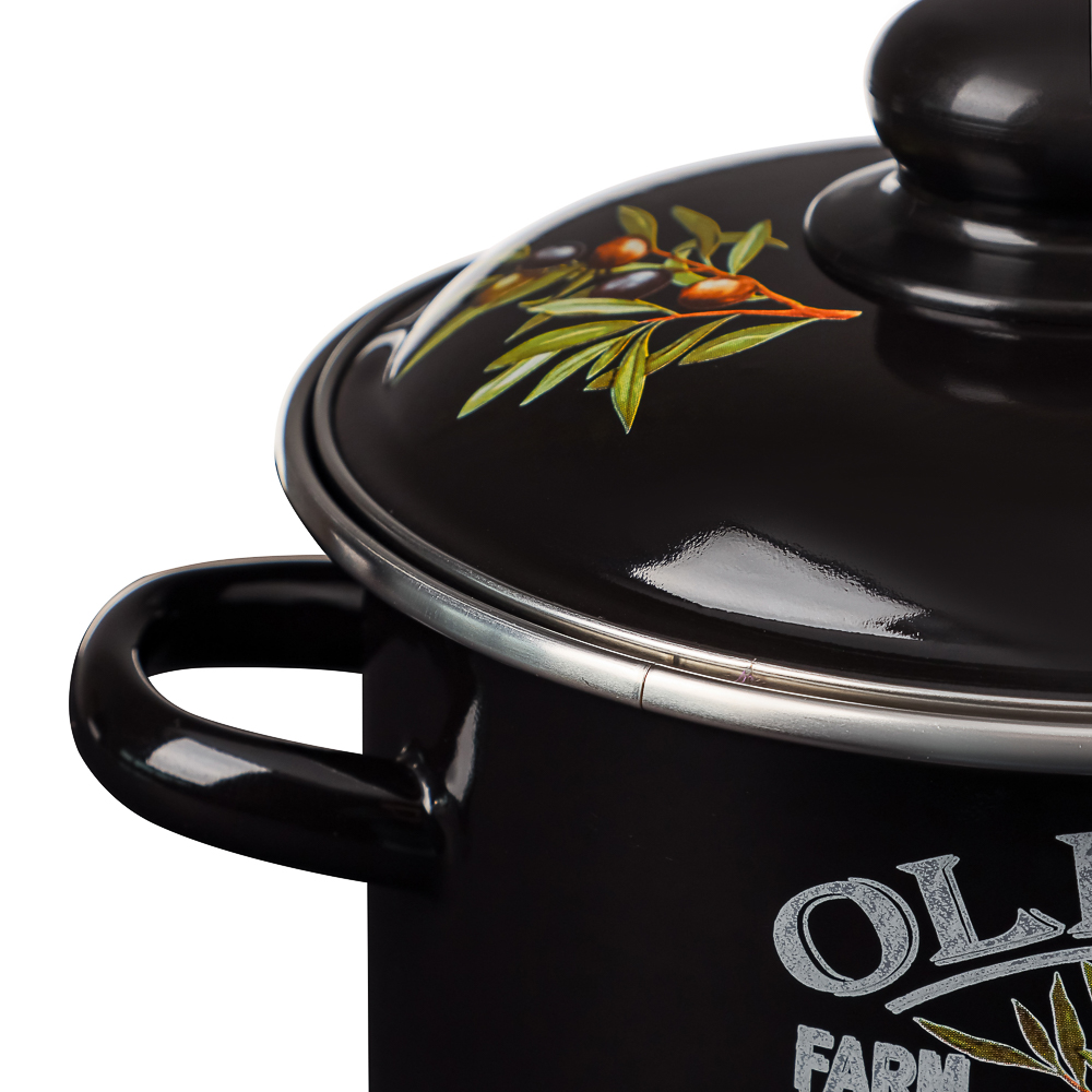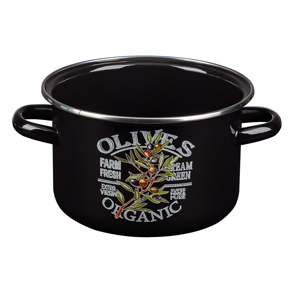 Кастрюля эмалированная Ветка оливы объемом 2 л в стильном черном цвете украшена изящным изображением ветки оливы, что придаёт ей особый шарм и выразительность. Прочная конструкция с толщиной стенок 3 мм и дна не менее 1,1 мм обеспечивает равномерный нагрев, делая её идеальной для приготовления разнообразных блюд. Универсальная кастрюля подходит для всех типов плит, включая индукционные, а удобная крышка помогает сохранить тепло и аромат блюд. Элегантный дизайн с оливковым узором и практичность делают её незаменимой на любой кухне, а её надежность — отличным вложением в ваш кулинарный арсенал.