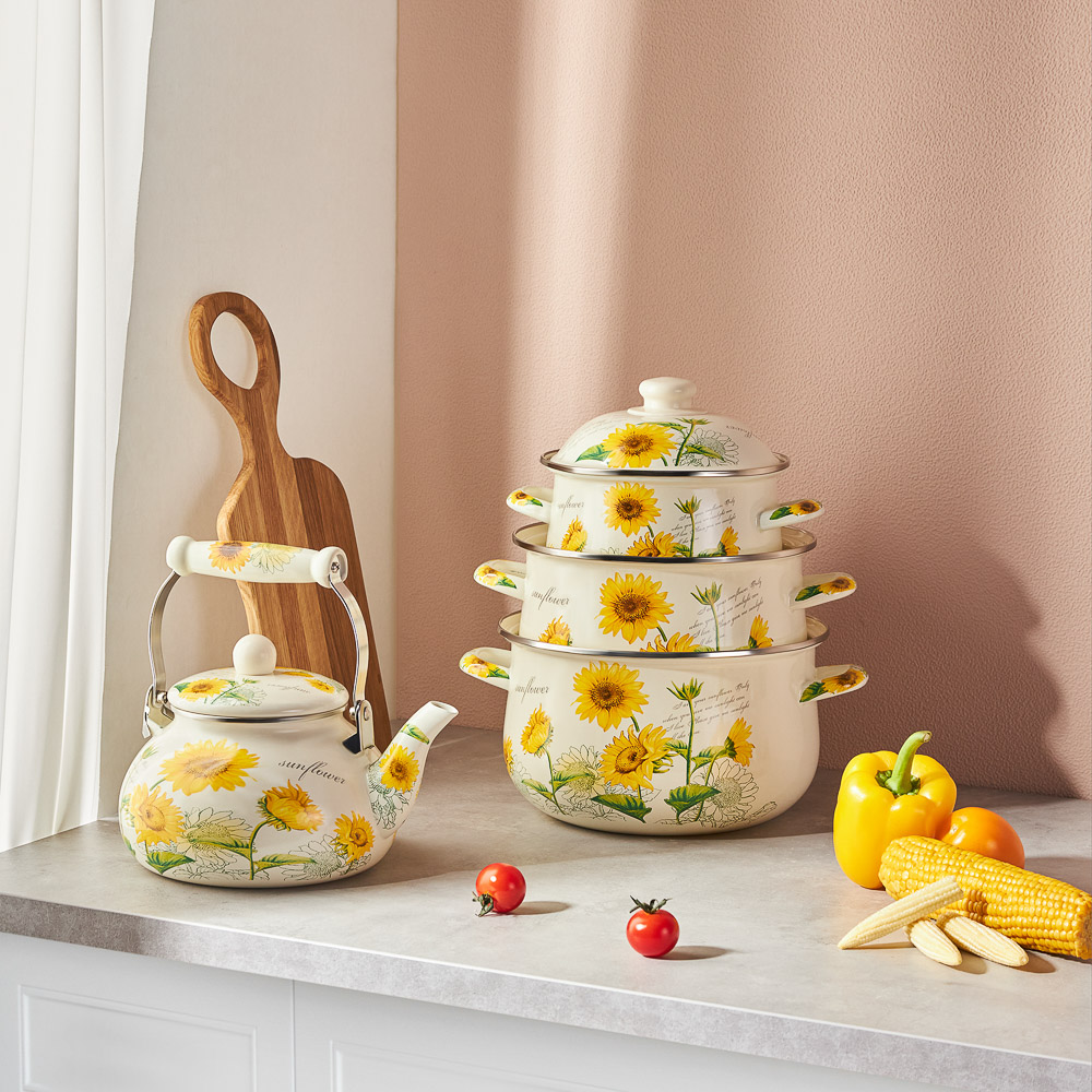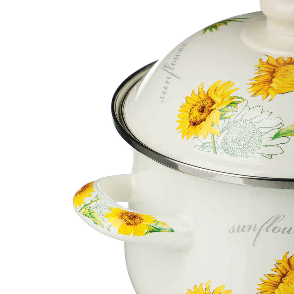 Нужна безопасная, качественная и красивая посуда для кухни? Эмалированная кастрюля VETTA «Подсолнухи» отвечает всем заявленным критериям. Идеально гладкая поверхность легко очищается от загрязнений, исключает размножение бактерий. В такой емкости можно хранить первые и вторые блюда. Приготовленный суп не пропитается запахом металла и не испортится.Причины купить эмалированные кастрюли VETTA:• варите на всех типах плит, включая индукцию;• объем — 2 литра, диаметр — 18 см;• можно ставить в духовой шкаф при температуре до 200°;• эмалированная посуда практична и долговечна: не подвержена коррозии, прочная, не деформируется со временем.