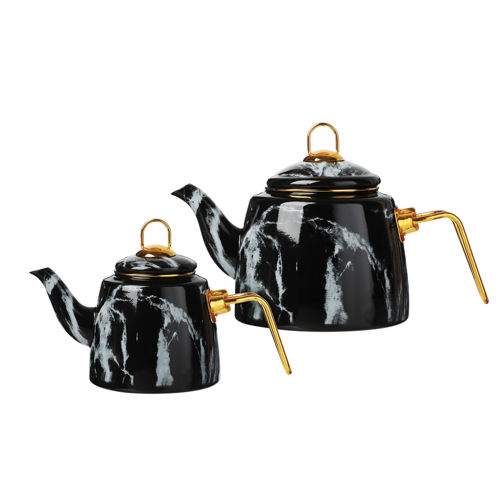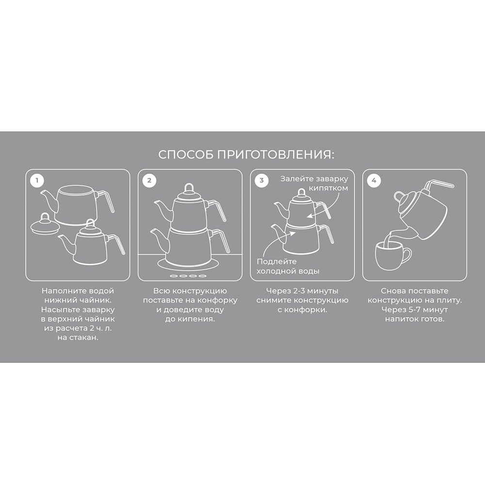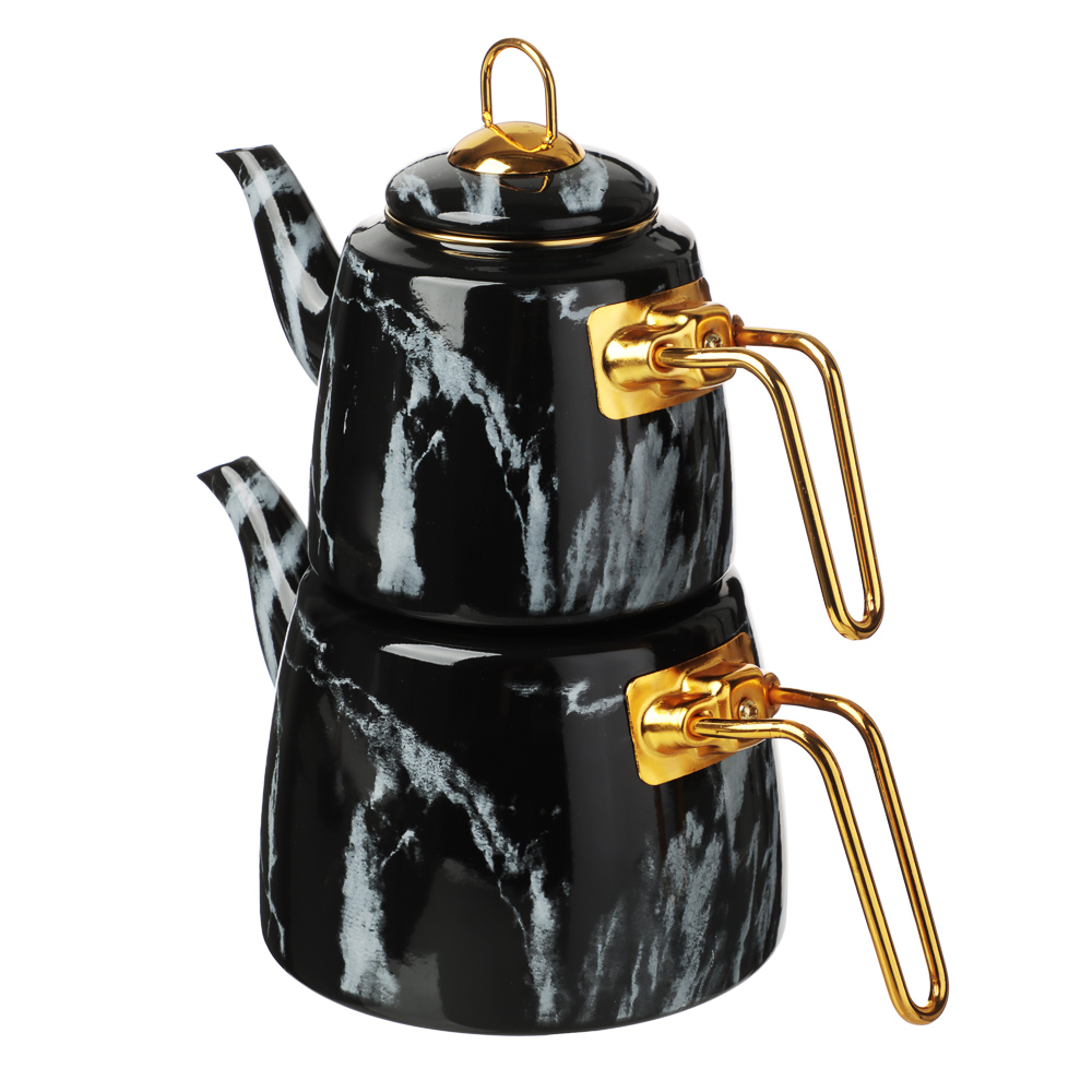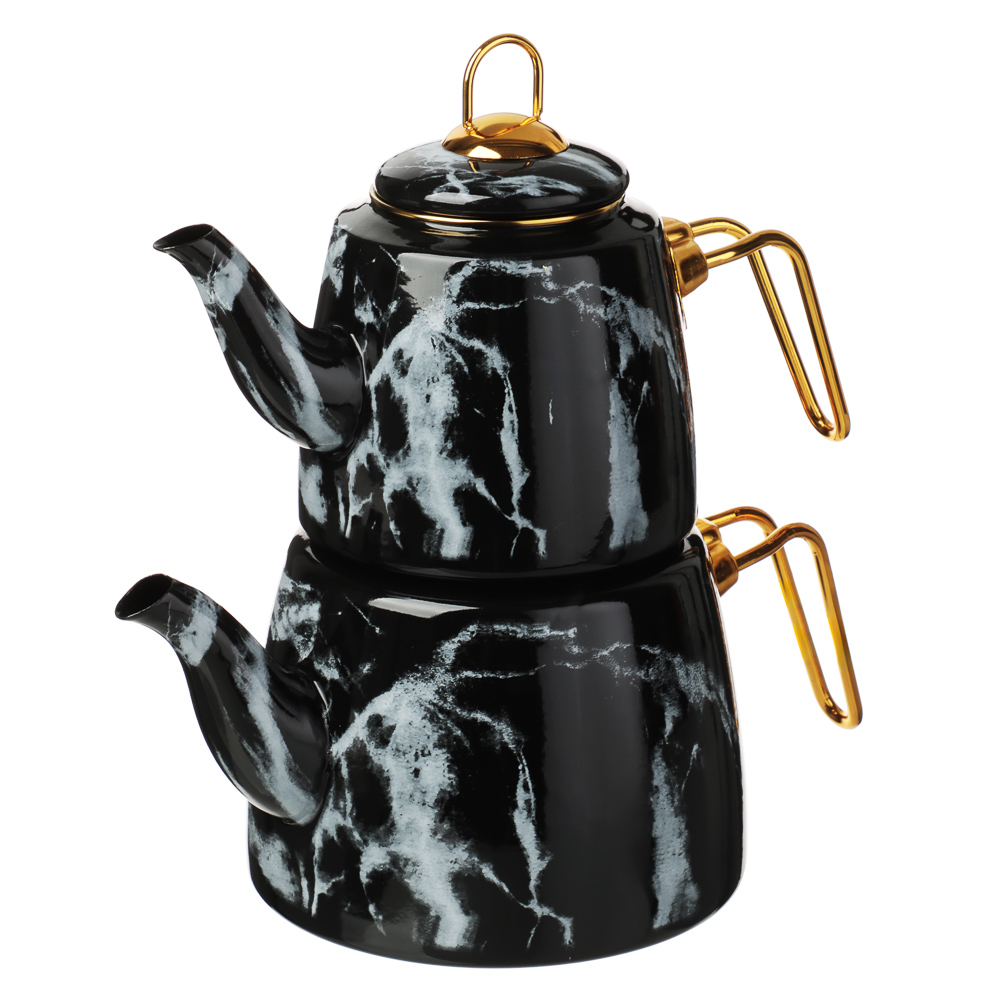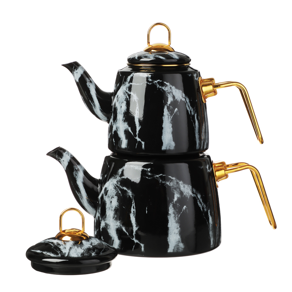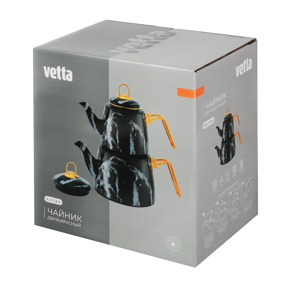 Чайник двухъярусный эмалированный VETTA, 1,5 л, 2,1 л – это необычное решение для заваривания чая оригинальным способом. Конструкция с двумя чайниками разного объема позволит организовать эффектную подачу любимого напитка и превратит чаепитие в особый ритуал. Благодаря необычному способу приготовления чайный лист постепенно раскрывает свой вкус и аромат, напиток получается насыщенным и бодрящим. Чайник имеет стильный дизайн с поверхностью под мрамор и ручками золотого цвета, смотрится выразительно и привлекает всеобщее внимание. Эмаль не вступает в контакт с напитком и не изменяет его вкус. Подходит для всех типов плит, включая индукцию. Подробная инструкция по приготовлению чая представлена на упаковке.
