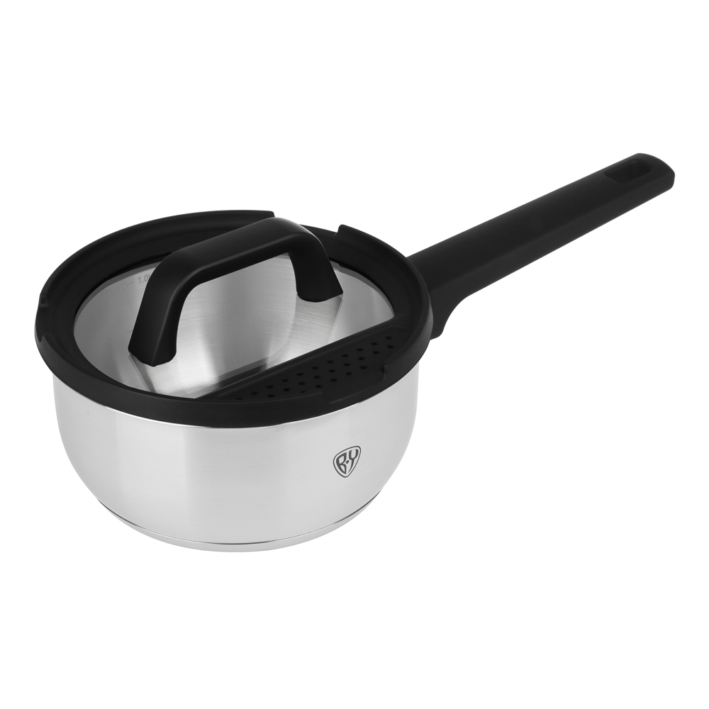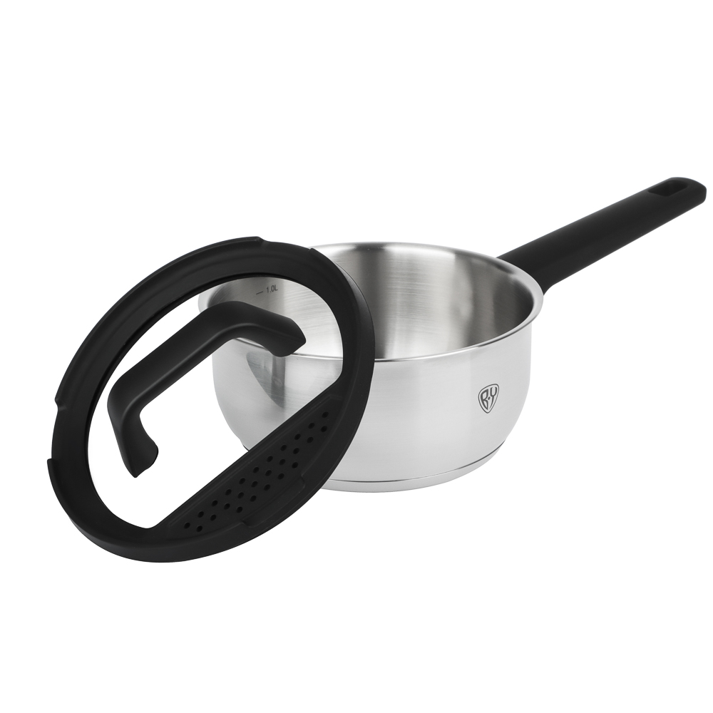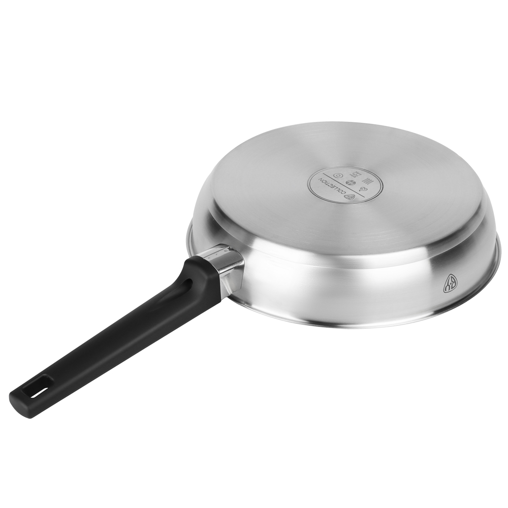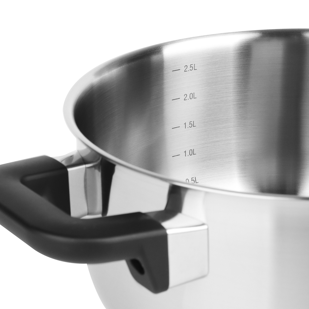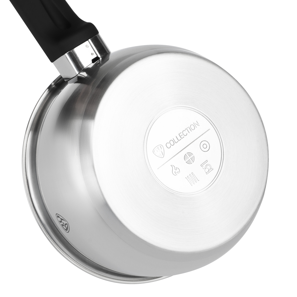 Набор кухонной посуды BY COLLECTION «Inta» из 7 предметов включает все необходимое для приготовления первых и вторых блюд, а также каш и соусов на домашней кухне. Состав комплекта: кастрюли 5 л; 3 л; ковш 1,5 л; сковорода 24 см и 3 крышки. Все предметы изготовлены из высококачественной нержавеющей стали марки AISI-304, обладающей высокой коррозионной стойкостью и прочностью. Кастрюли и сковорода имеют толстое капсульное дно для быстрого нагрева и равномерного приготовления пищи. Бакелитовые ручки не нагреваются, а крышки оснащены сливными отверстиями для удаления жидкостей при варке гарниров и овощей. Шкала объема на внутренних стенках позволяет точно дозировать количество ингредиентов. Сковорода с безопасным антипригарным покрытием позволяет готовить полезные блюда с минимальным количеством масла, а продукты не пригорают и не прилипают. Современный дизайн с хромированной отделкой и эргономичными ручками выигрышно смотрится в любом интерьерном стиле.